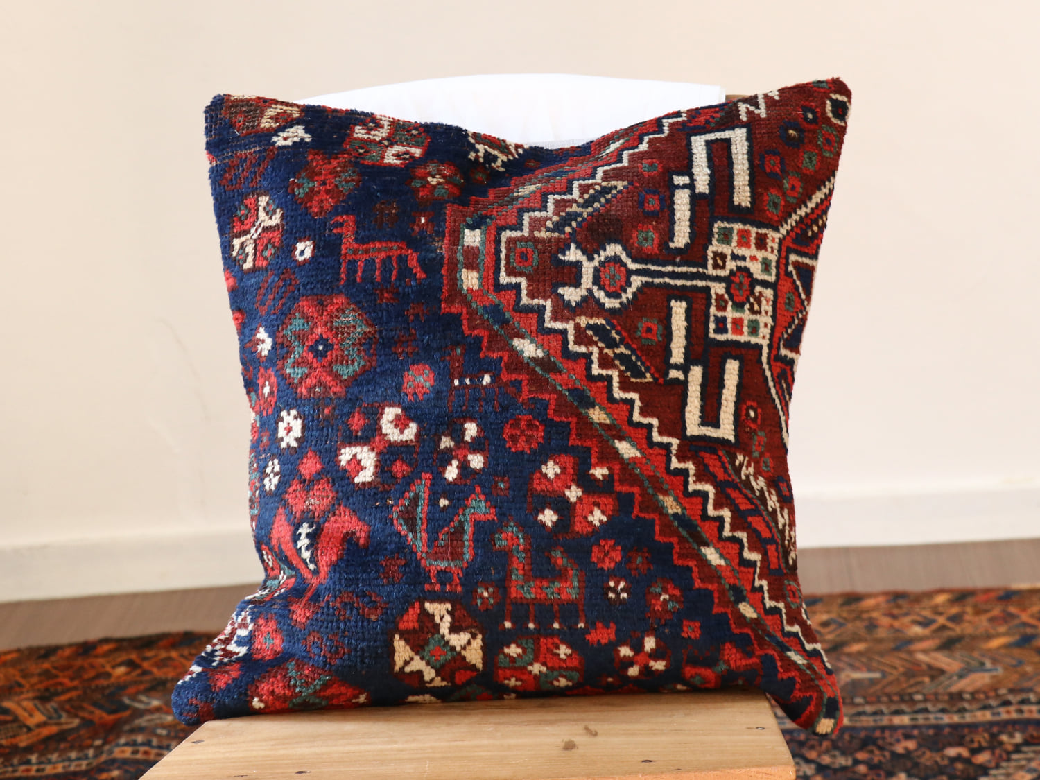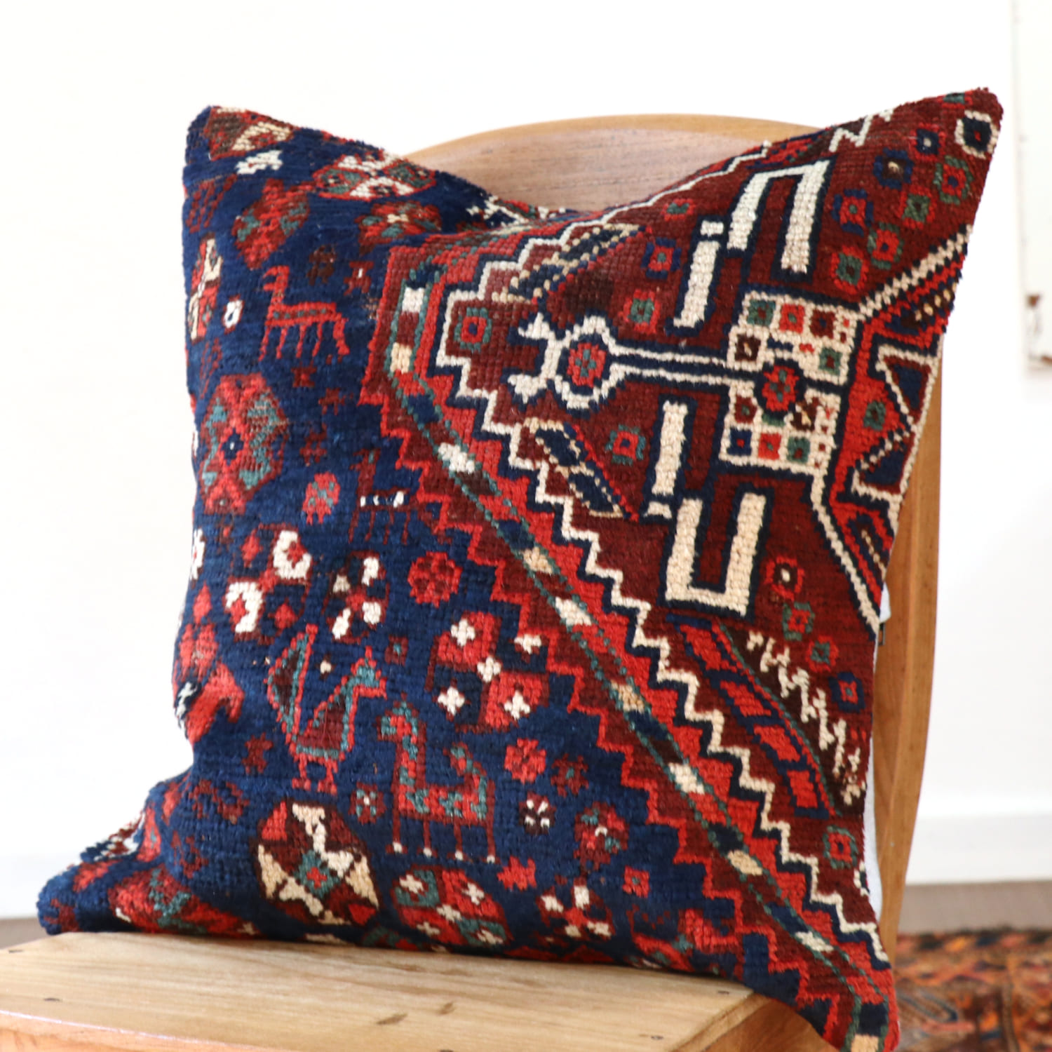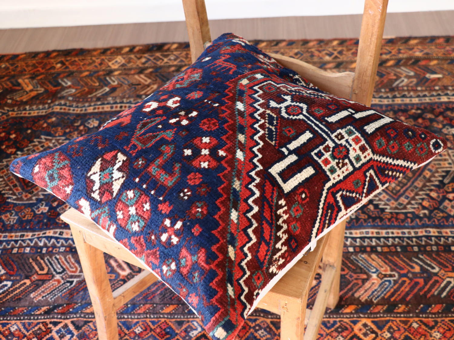 | 20世紀初頭に織られたアンティークラグからカットされたパイル織り絨毯のクッションカバーです。イラン南部に暮らすカシュカイ族のもので、天然染料による美しい色が100年経った現在でも、きれいに残っています。 |