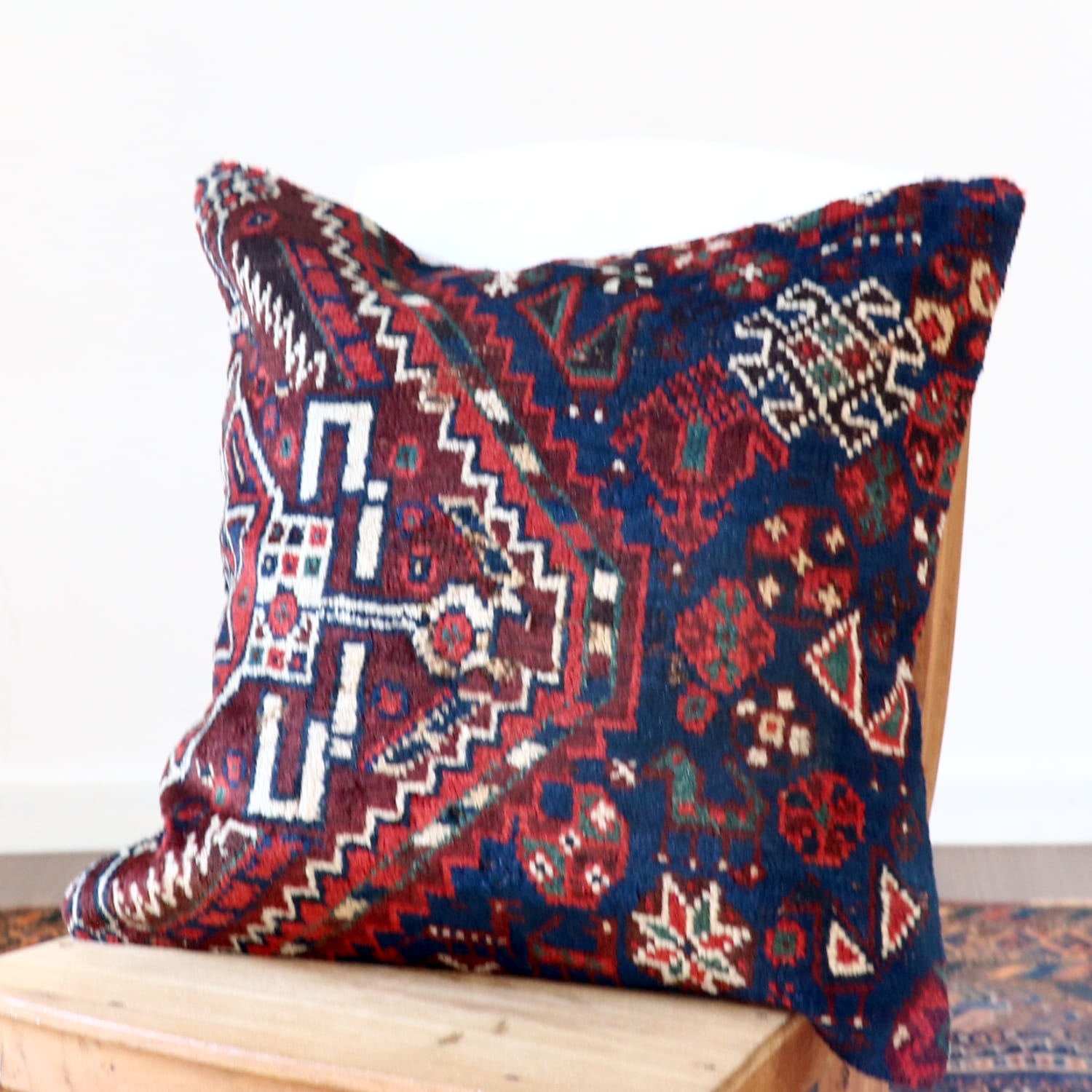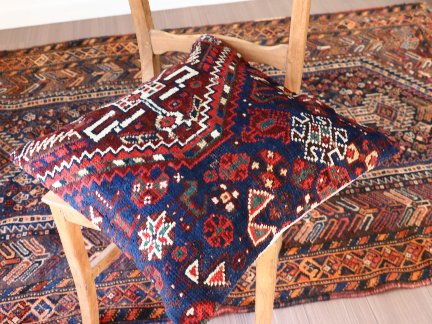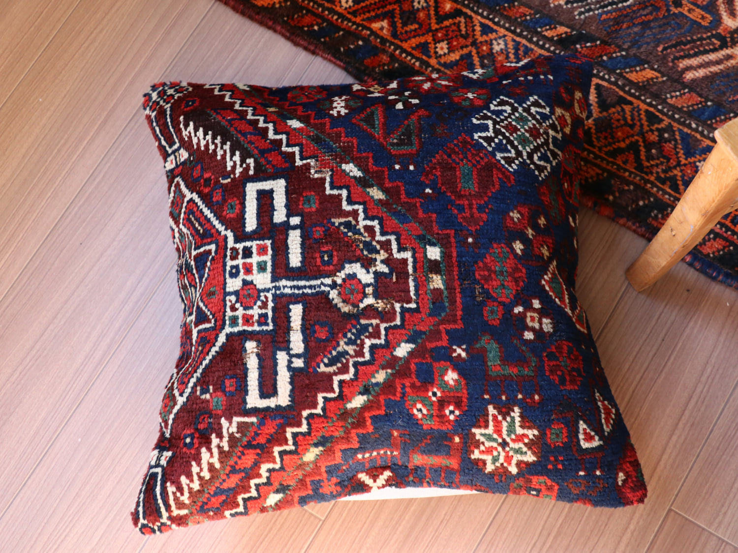| 20世紀初頭に織られたアンティークラグからカットされたパイル織り絨毯のクッションカバーです。イラン南部に暮らすカシュカイ族のもので、天然染料による美しい色が100年経った現在でも、きれいに残っています。 |