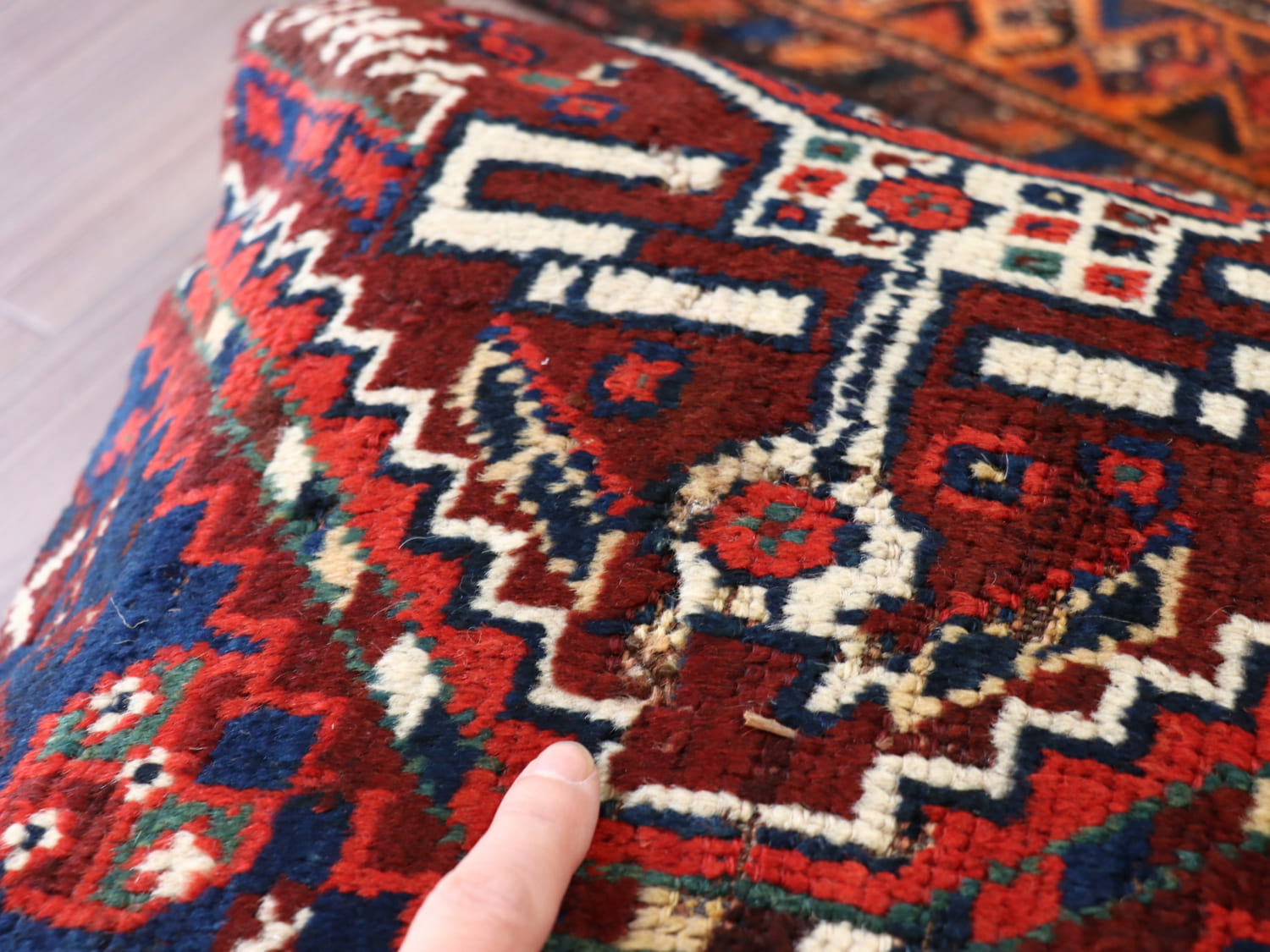 | 長く敷物として使われていたラグからのカットされていますが、比較的状態はよく、パイル(毛足)の表面はなめらかです。 |