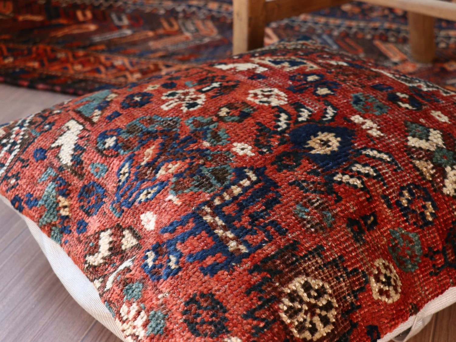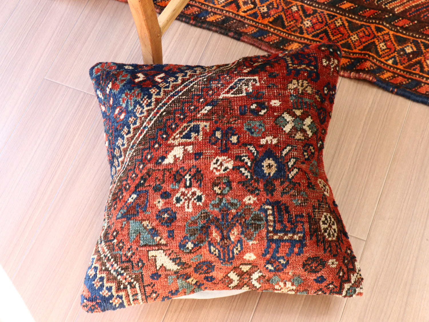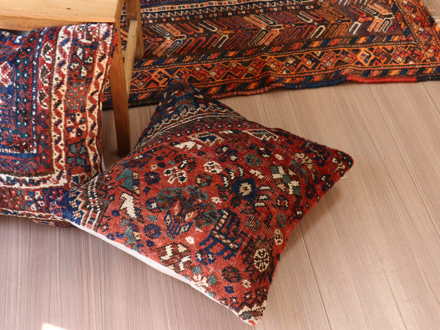 | 20世紀初頭に織られたアンティークラグからカットされたパイル織り絨毯のクッションカバーです。イラン南部に暮らすカシュカイ族のもので、天然染料による美しい色が100年経った現在でも、きれいに残っています。 |