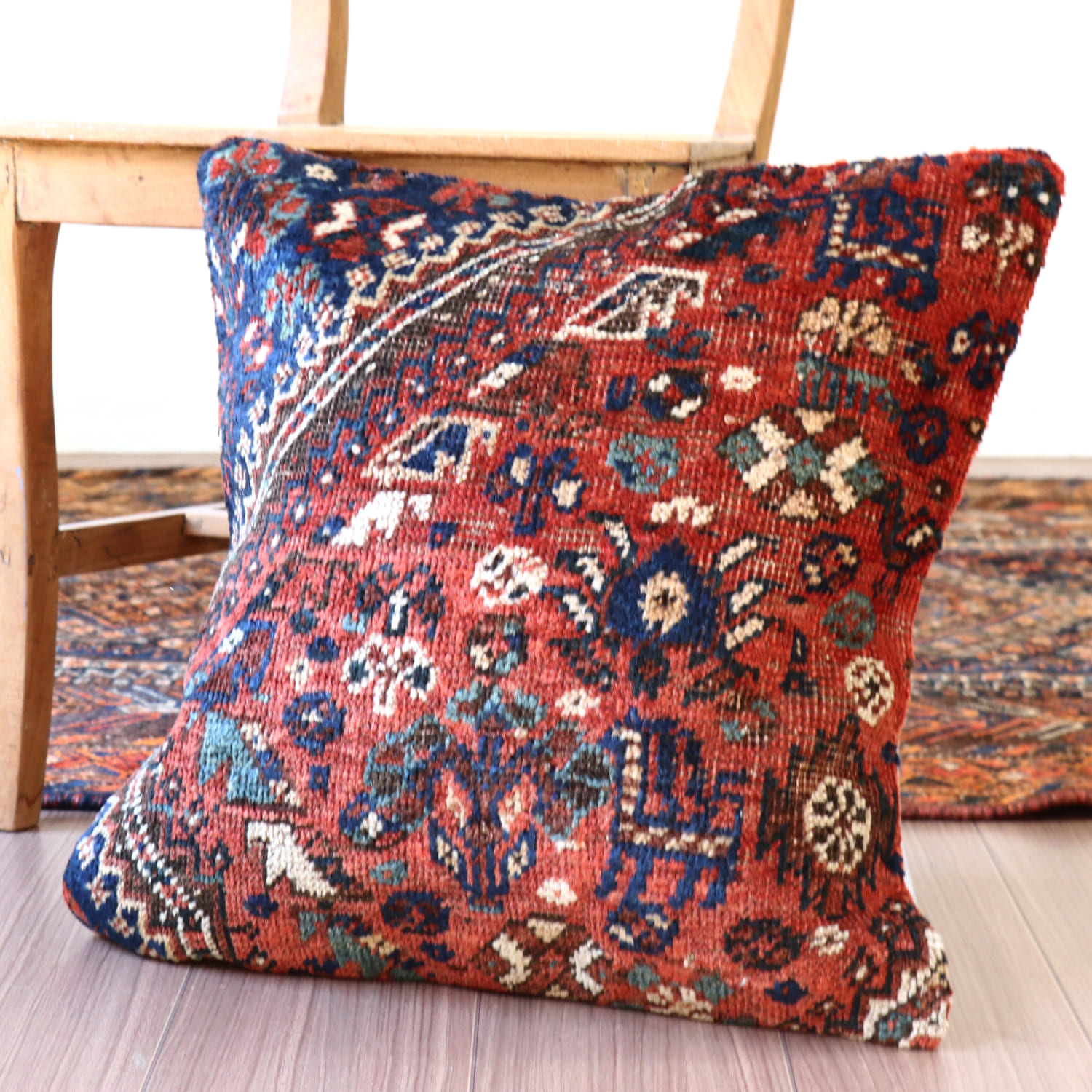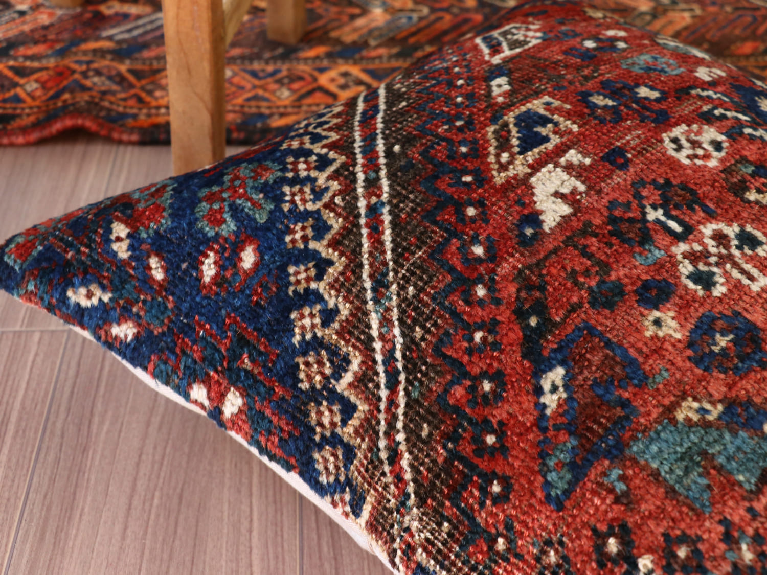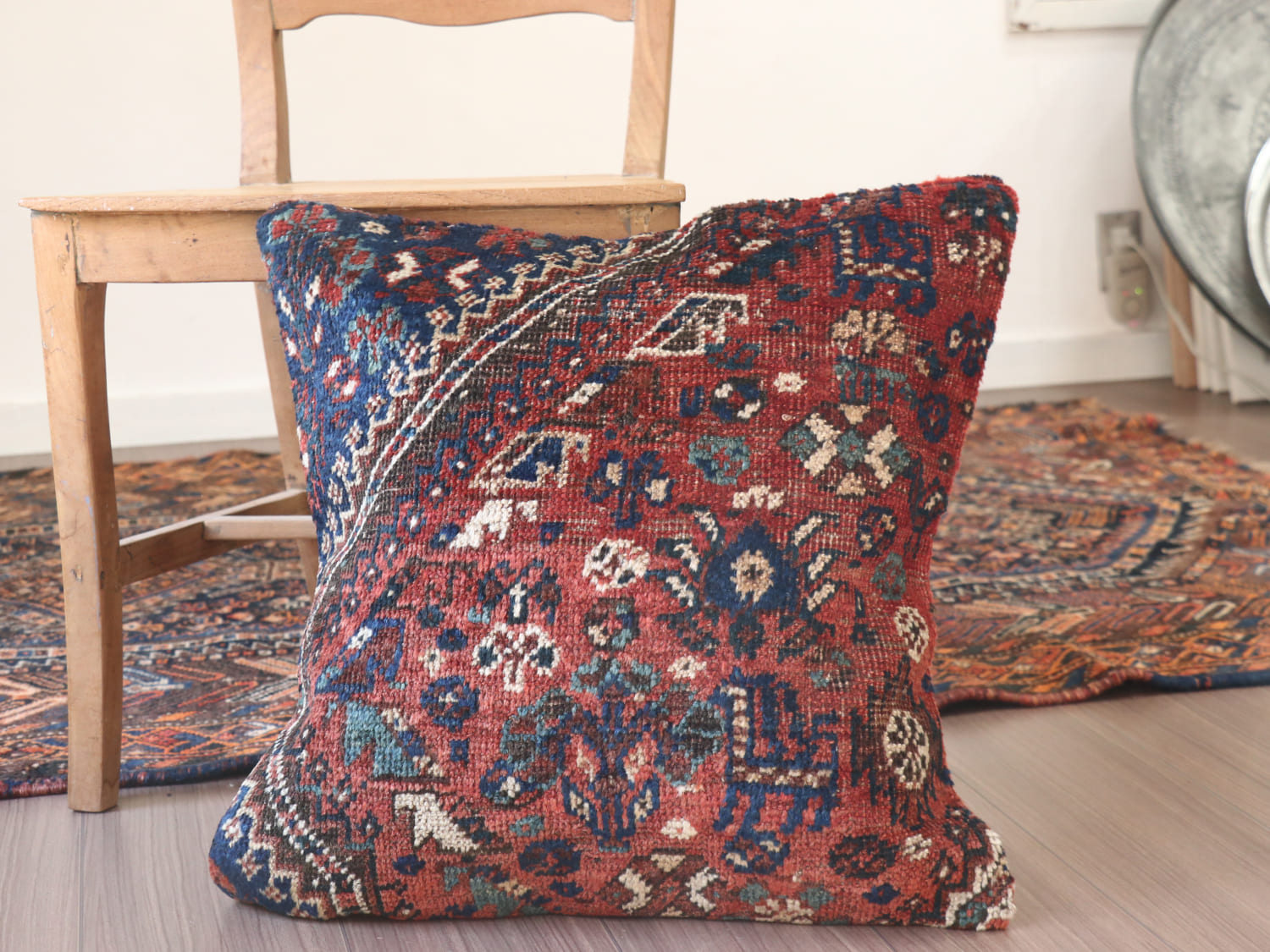| 20世紀初頭に織られたアンティークラグからカットされたパイル織り絨毯のクッションカバーです。イラン南部に暮らすカシュカイ族のもので、天然染料による美しい色が100年経った現在でも、きれいに残っています。 |