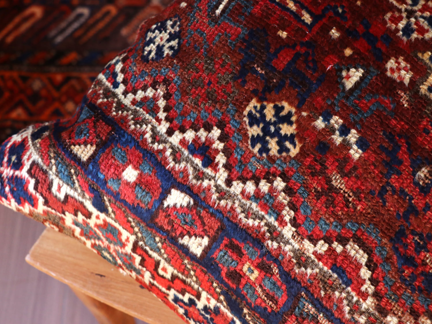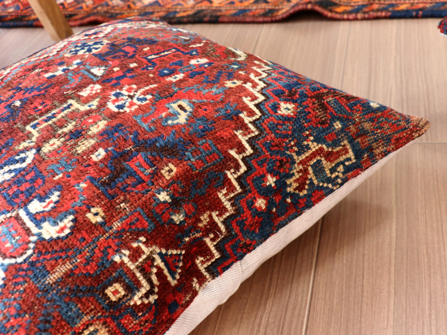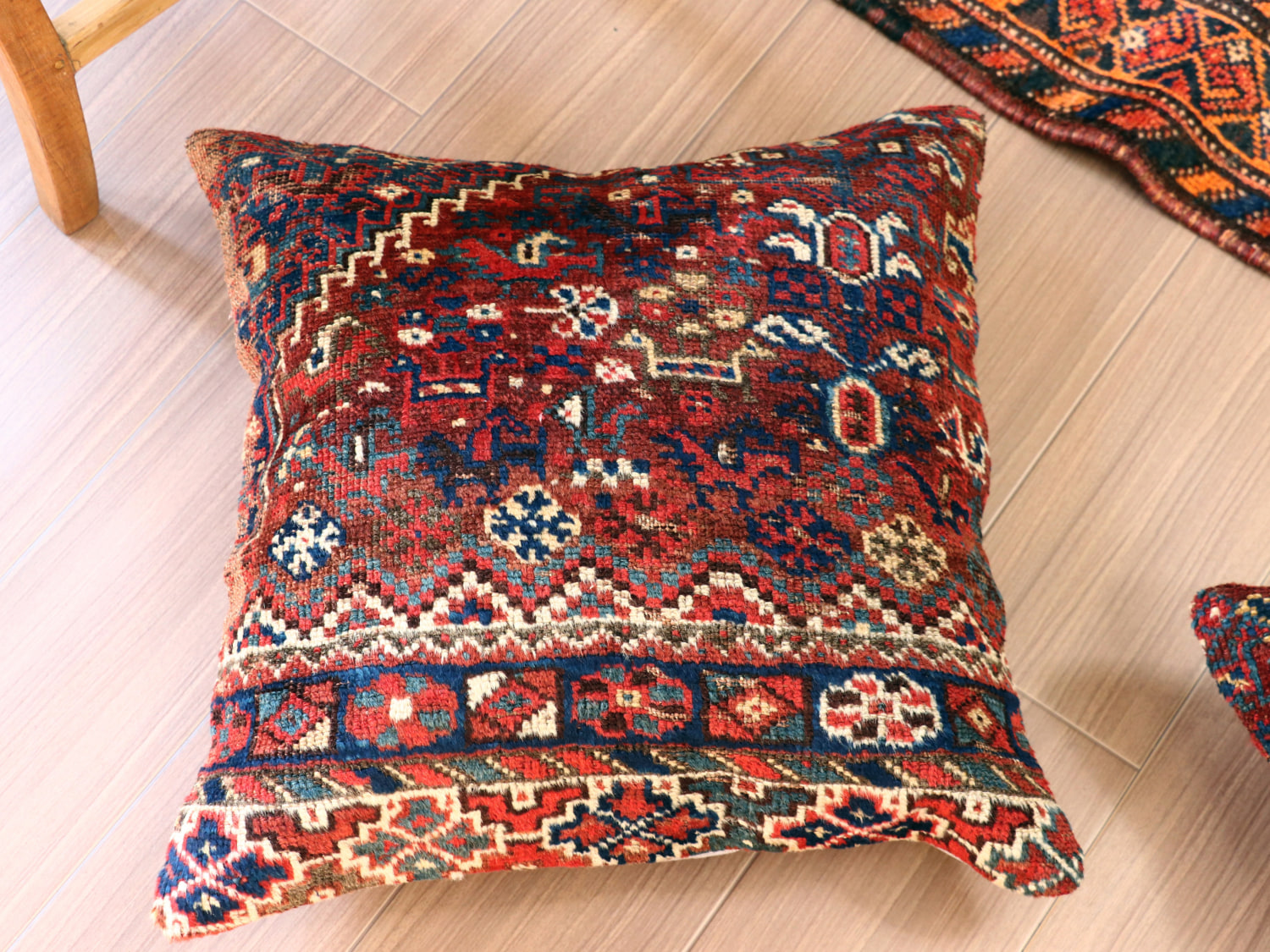 | 20世紀初頭に織られたアンティークラグからカットされたパイル織り絨毯のクッションカバーです。イラン南部に暮らすカシュカイ族のもので、天然染料による美しい色が100年経った現在でも、きれいに残っています。 |