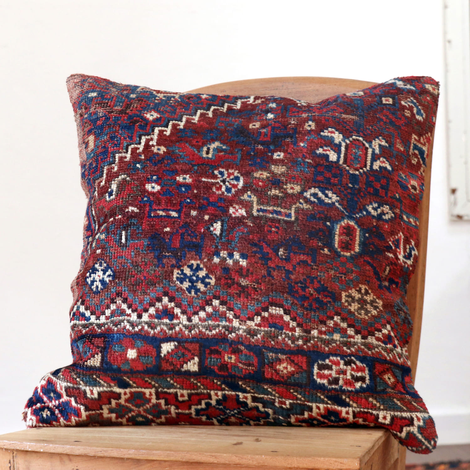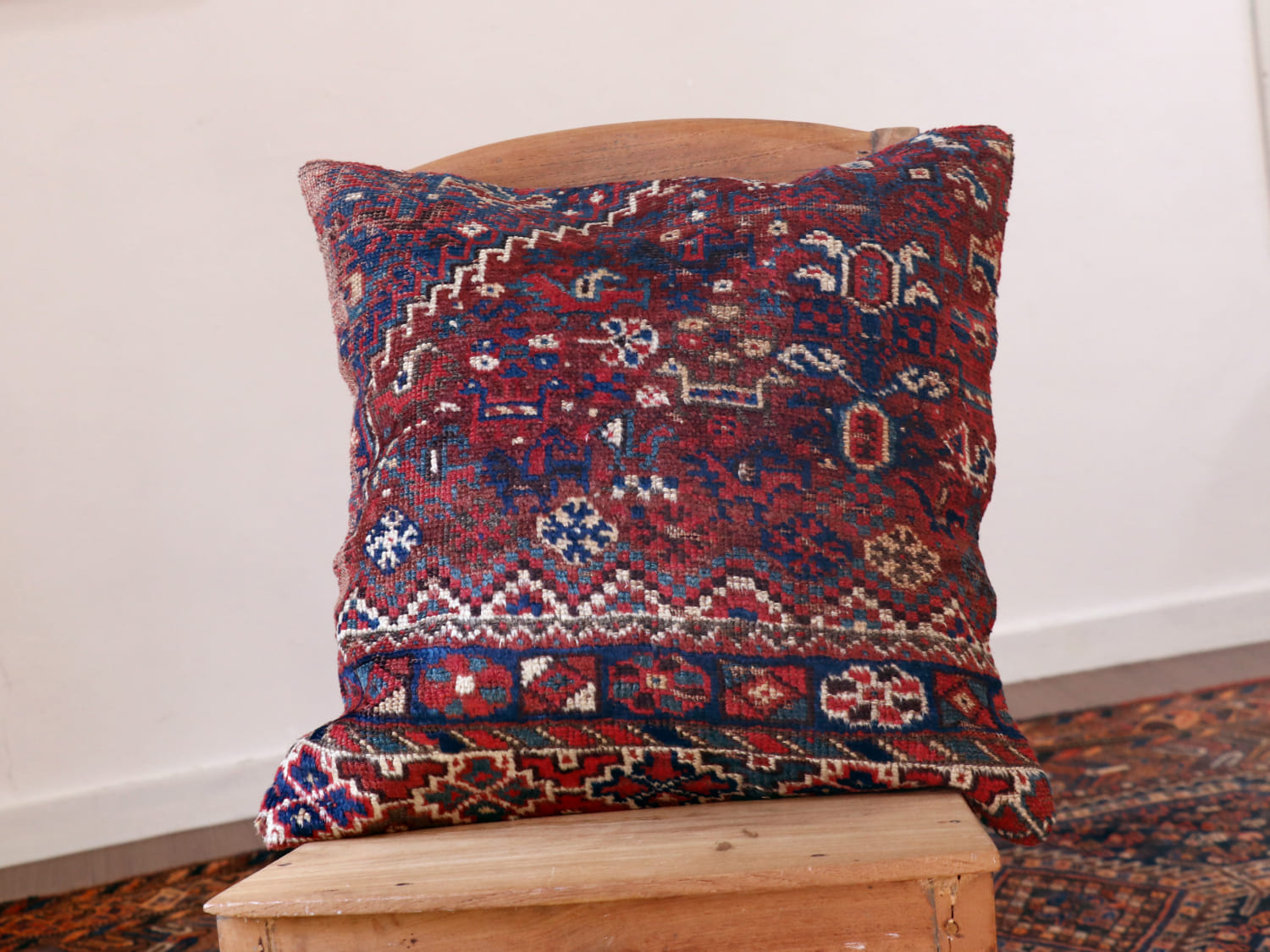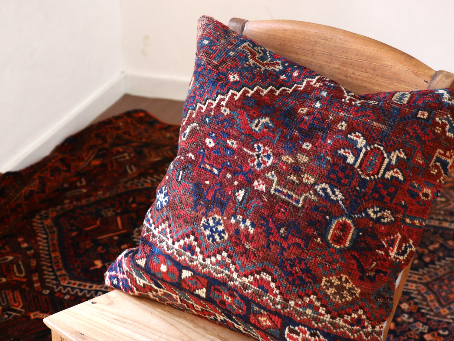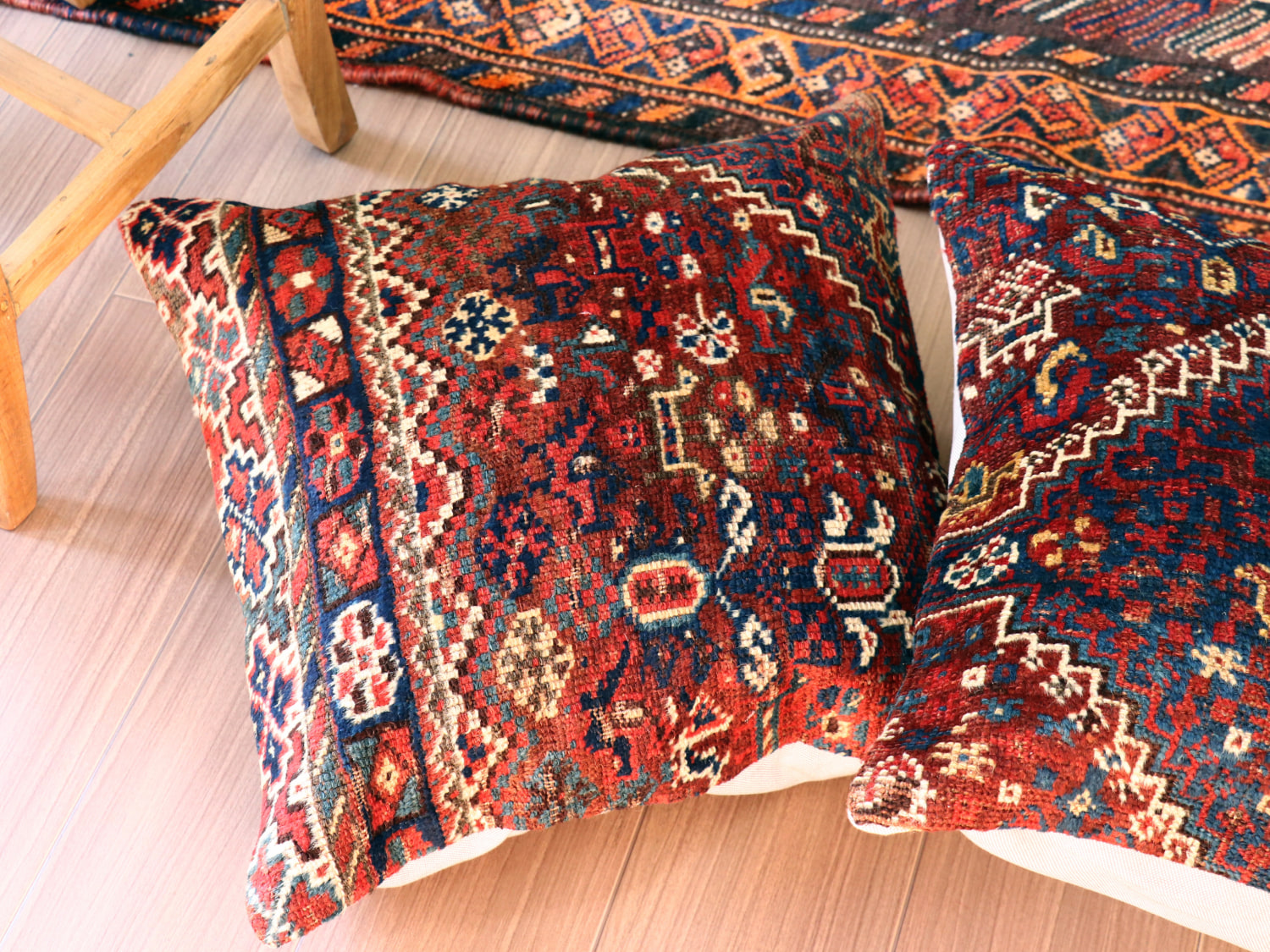 | 20世紀初頭に織られたアンティークラグからカットされたパイル織り絨毯のクッションカバーです。イラン南部に暮らすカシュカイ族のもので、天然染料による美しい色が100年経った現在でも、きれいに残っています。 |