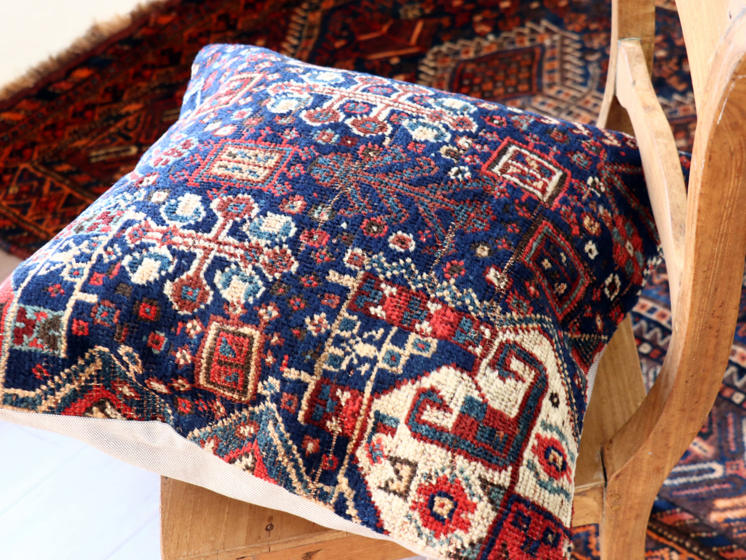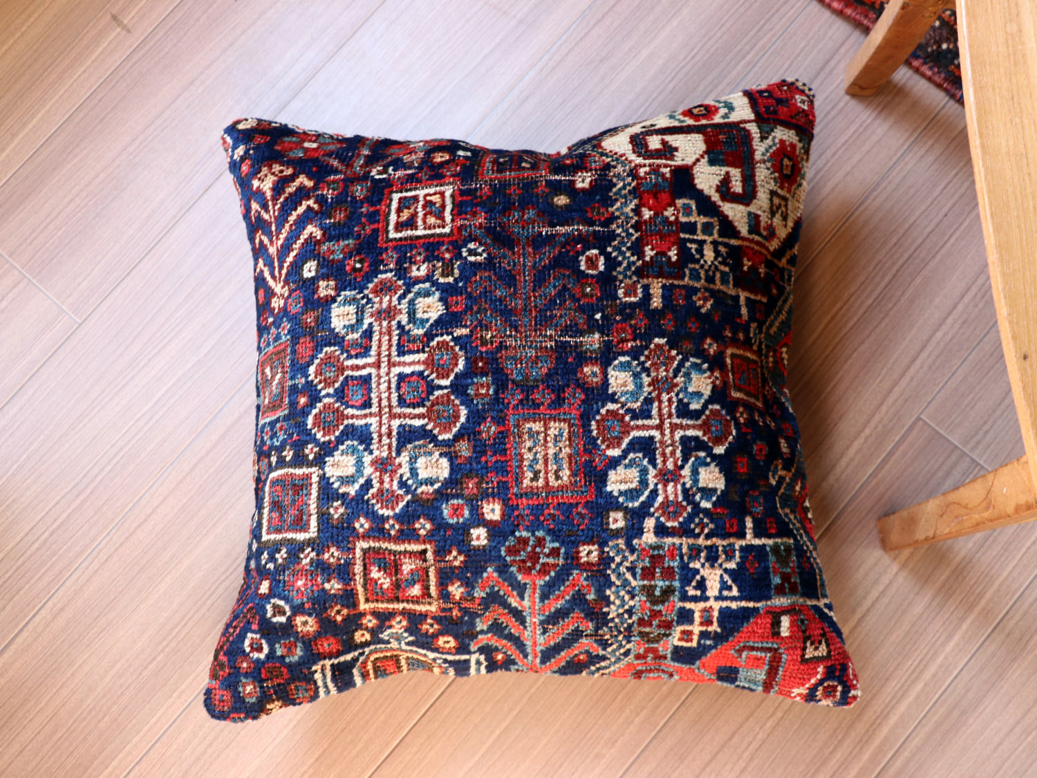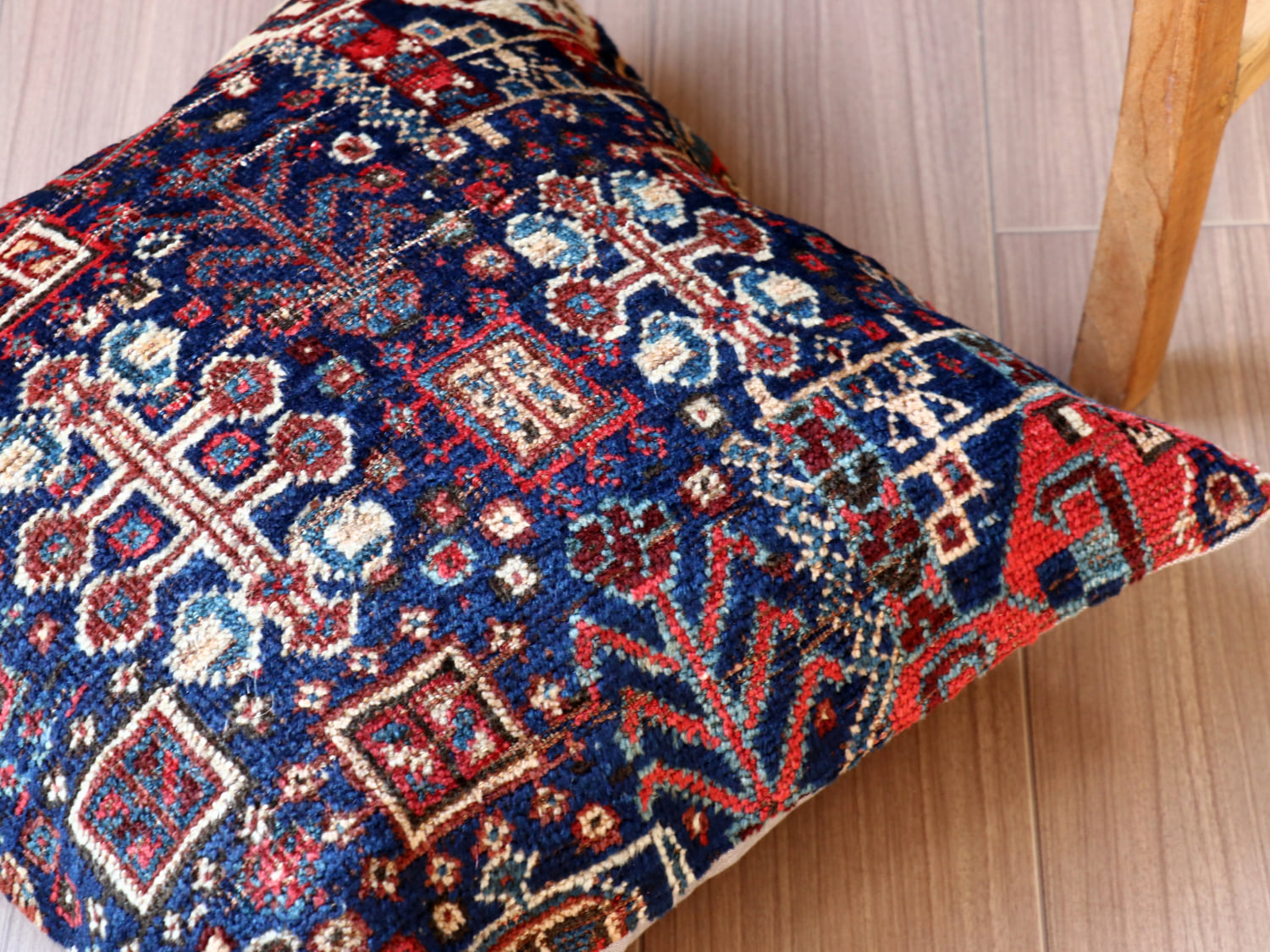 | 20世紀初頭に織られたアンティークラグからカットされたパイル織り絨毯のクッションカバーです。イラン南部に暮らすカシュカイ族のもので、天然染料による美しい色が100年経った現在でも、きれいに残っています。 |
