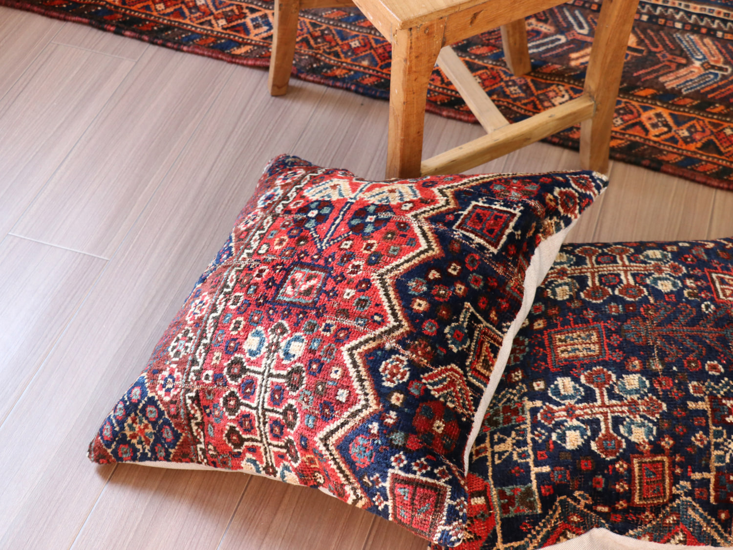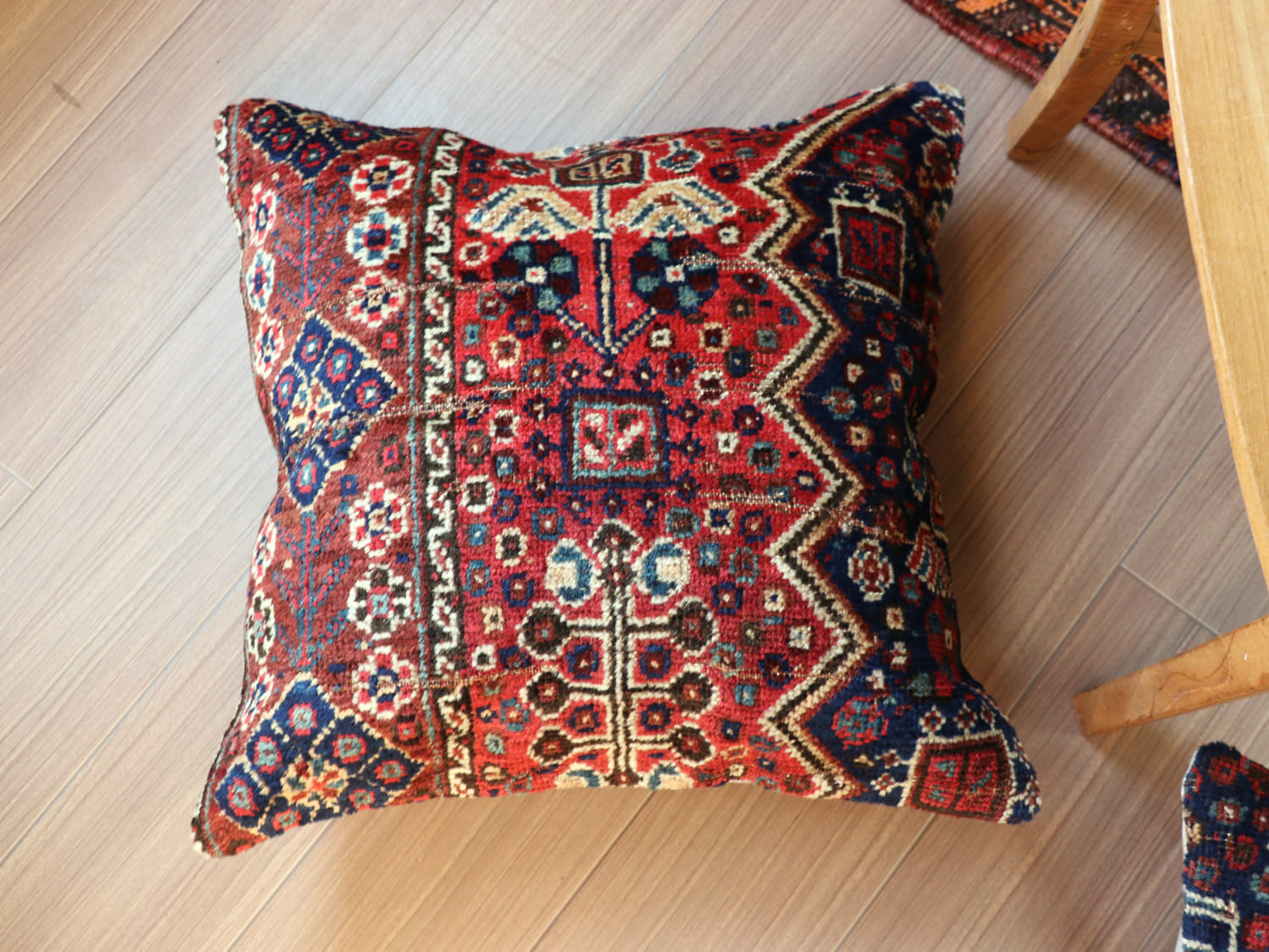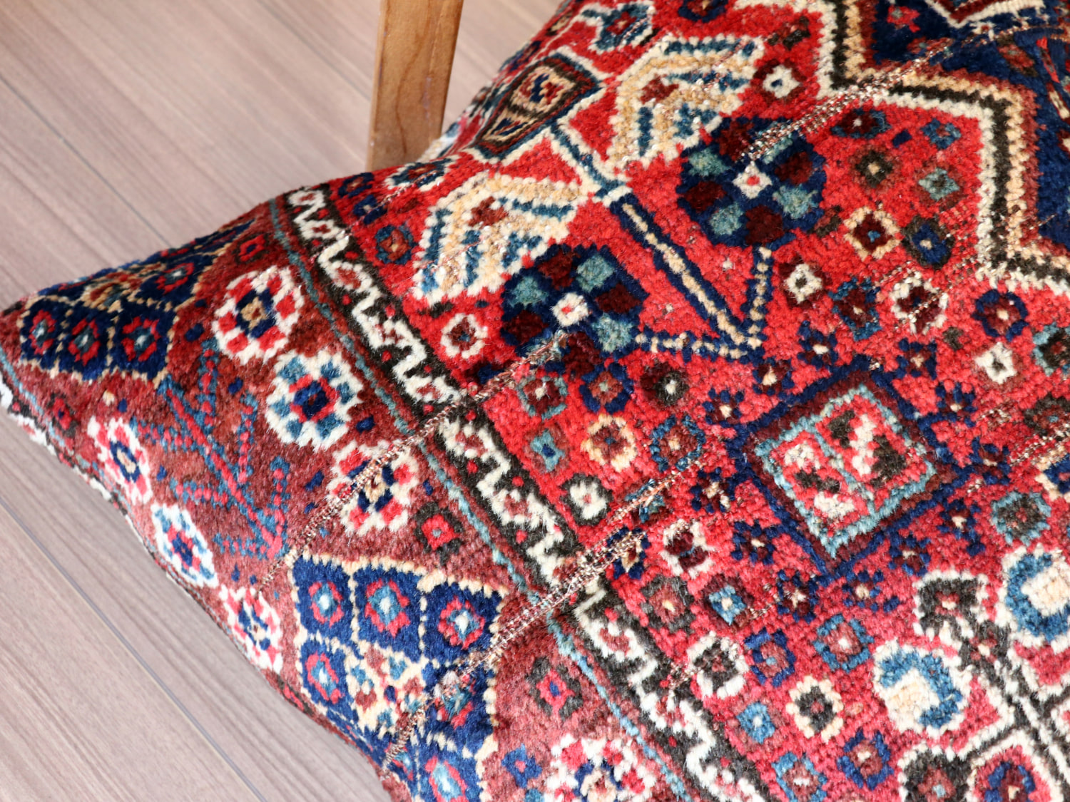 | 20世紀初頭に織られたアンティークラグからカットされたパイル織り絨毯のクッションカバーです。イラン南部に暮らすカシュカイ族のもので、天然染料による美しい色が100年経った現在でも、きれいに残っています。 |
