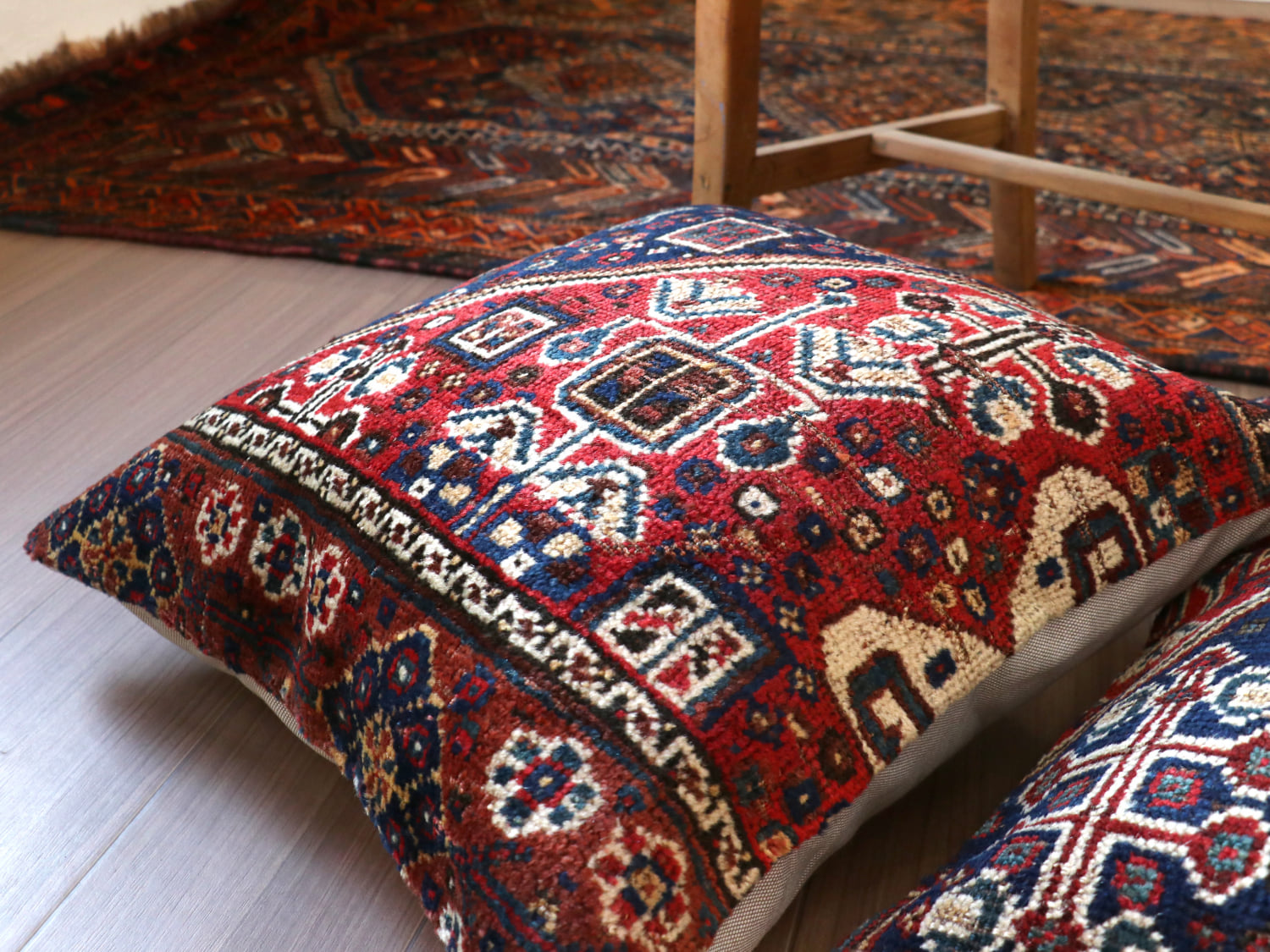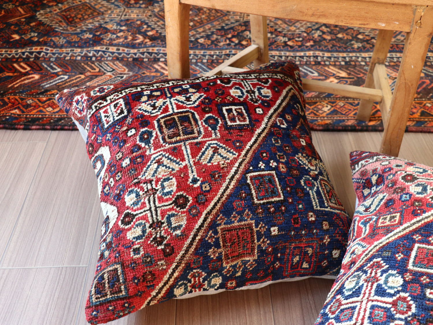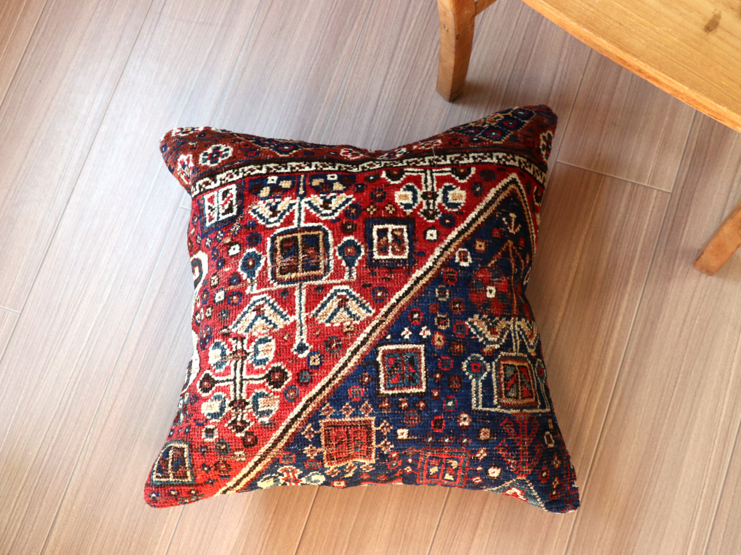 | 20世紀初頭に織られたアンティークラグからカットされたパイル織り絨毯のクッションカバーです。イラン南部に暮らすカシュカイ族のもので、天然染料による美しい色が100年経った現在でも、きれいに残っています。 |