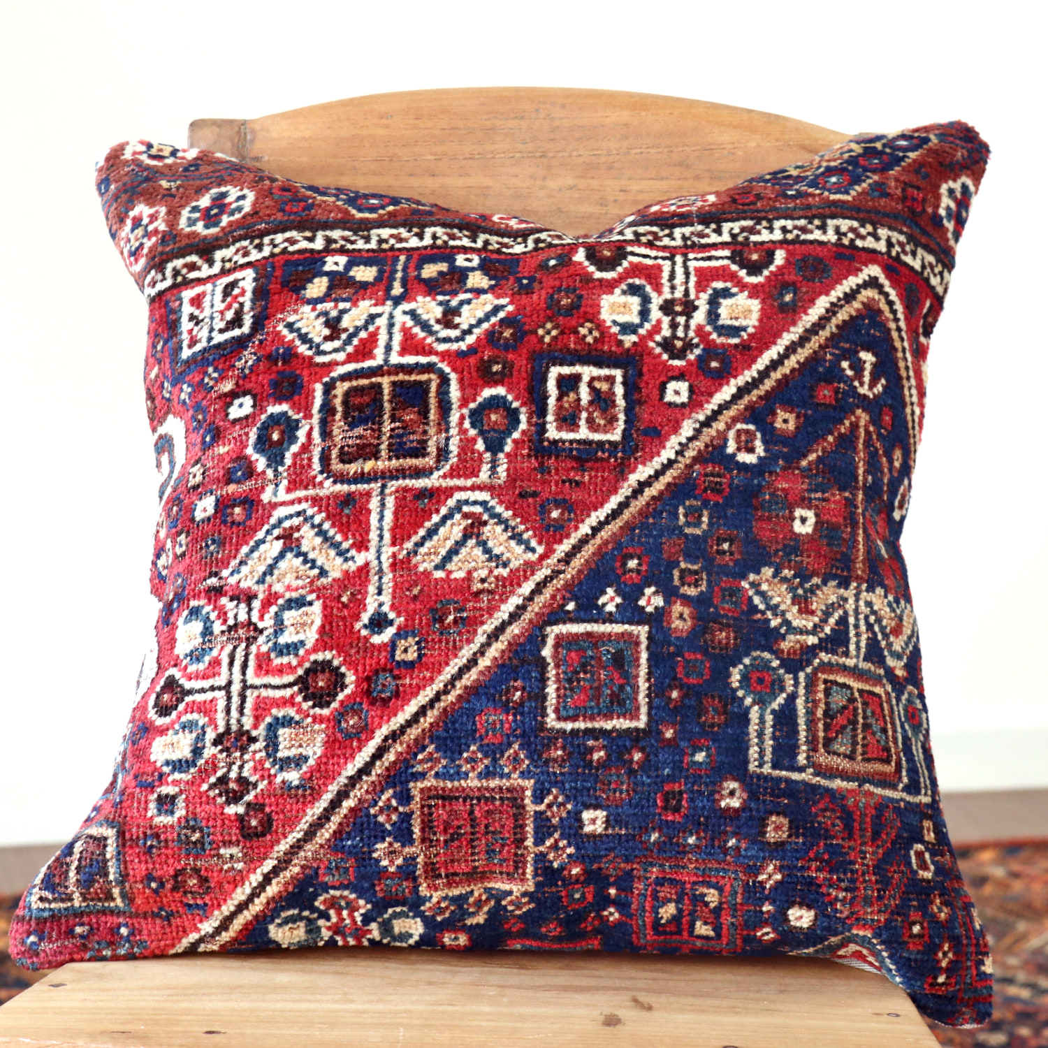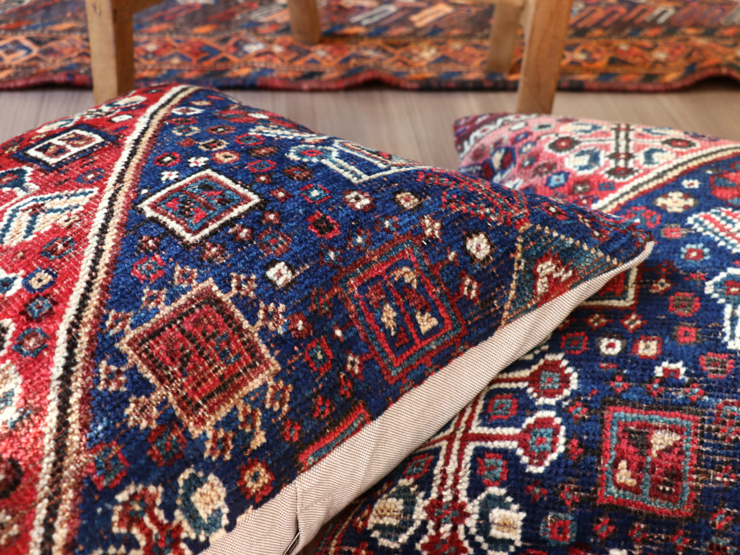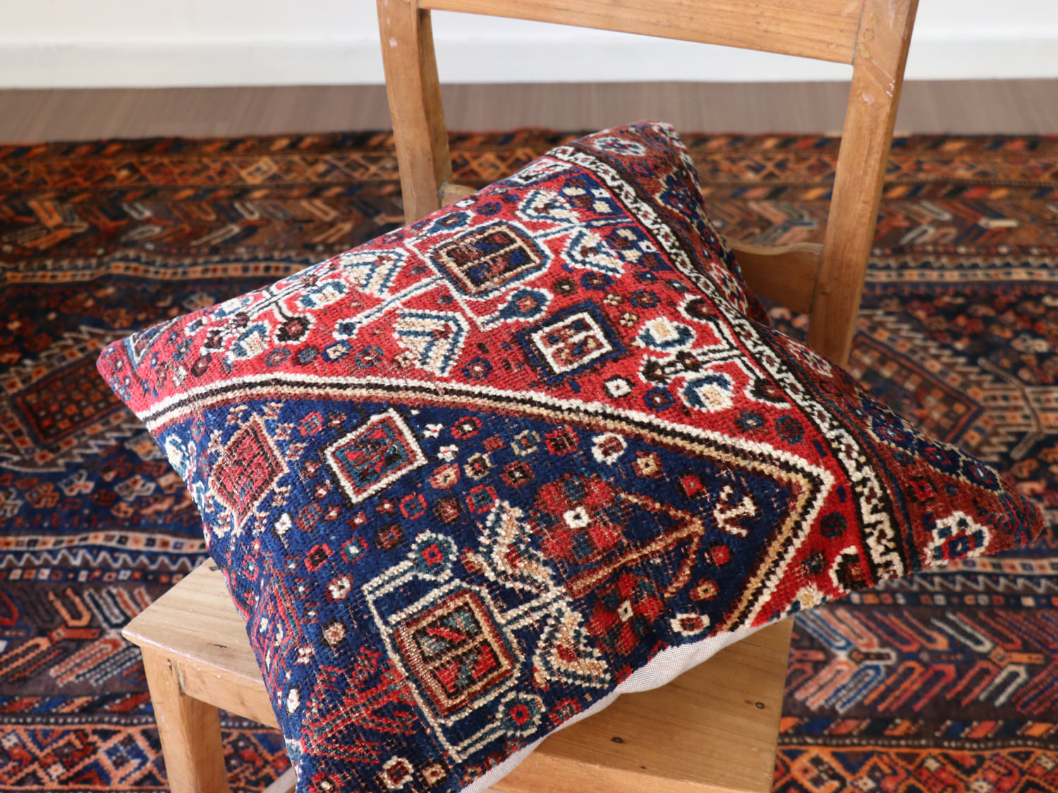 | 20世紀初頭に織られたアンティークラグからカットされたパイル織り絨毯のクッションカバーです。イラン南部に暮らすカシュカイ族のもので、天然染料による美しい色が100年経った現在でも、きれいに残っています。 |