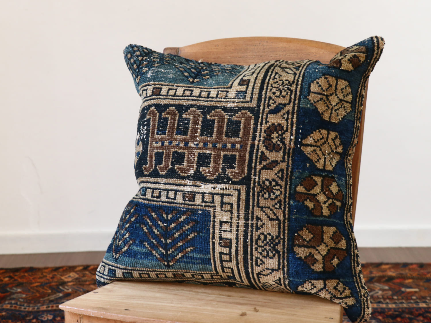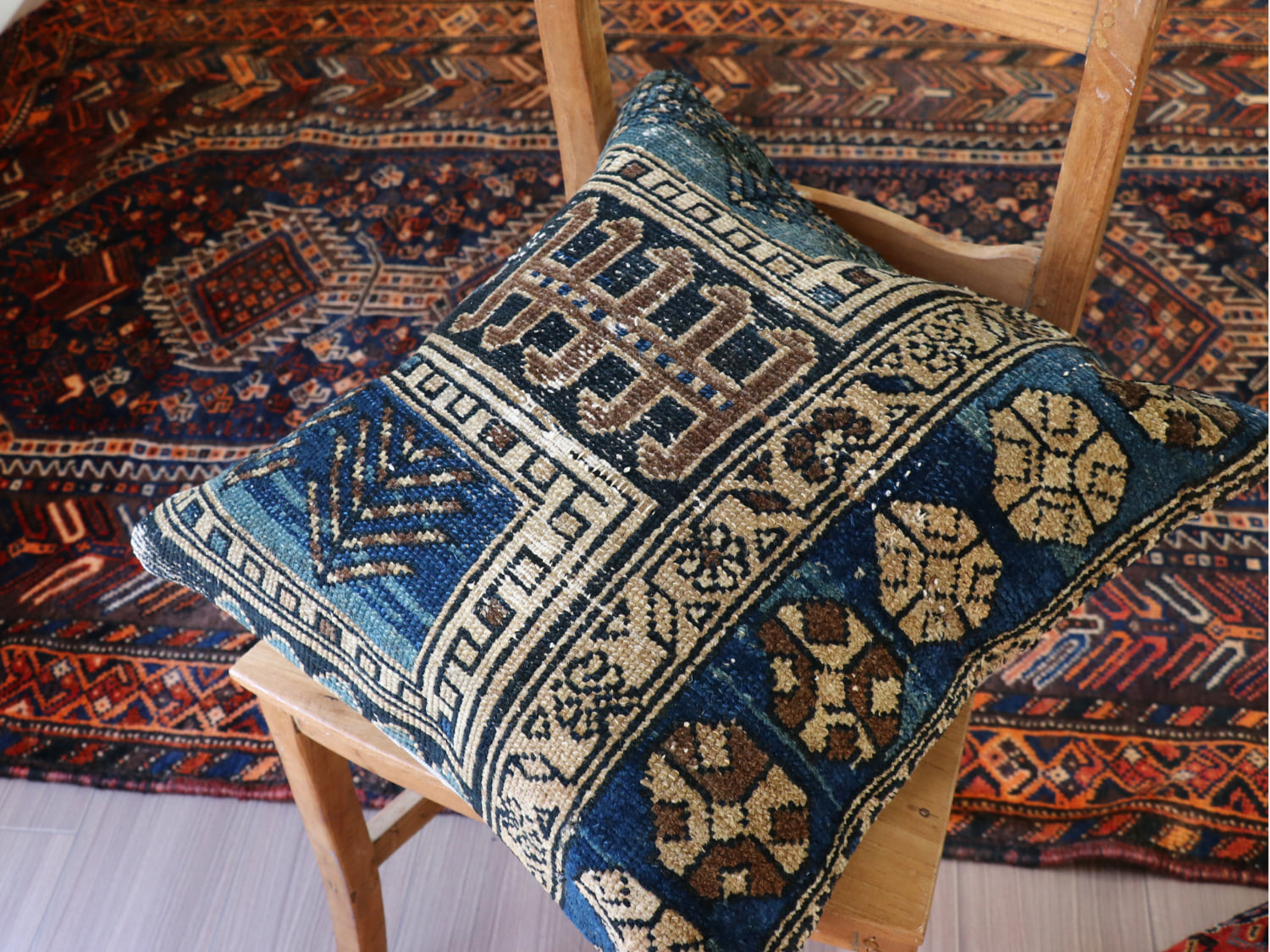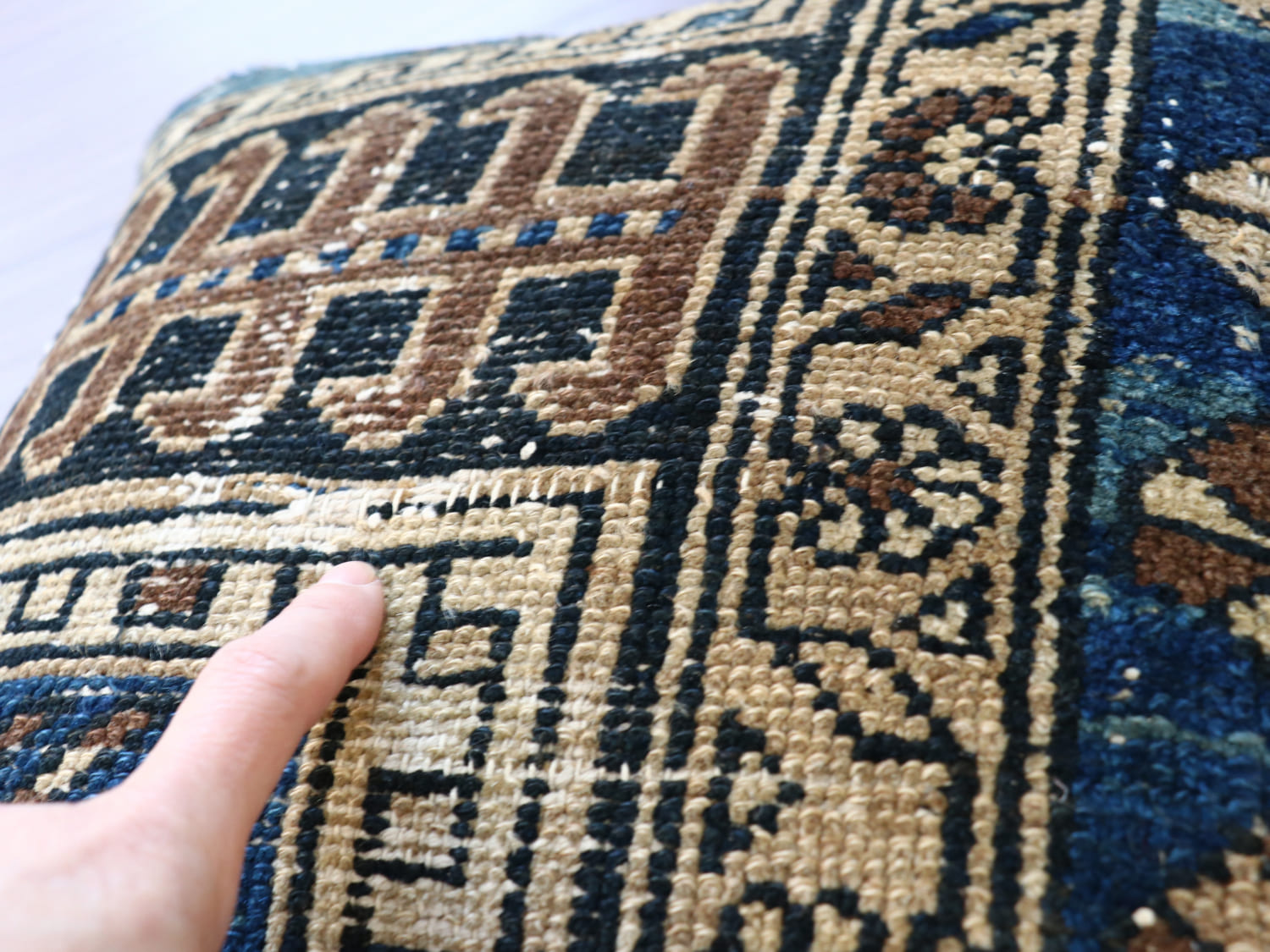 | 20世紀後半に織られたラグからカットされたパイル織り絨毯のクッションカバーです。イラン南部に暮らすカシュカイ族のもので、ブルー、ネイビー、ブラウンのシックなカラーです。 |