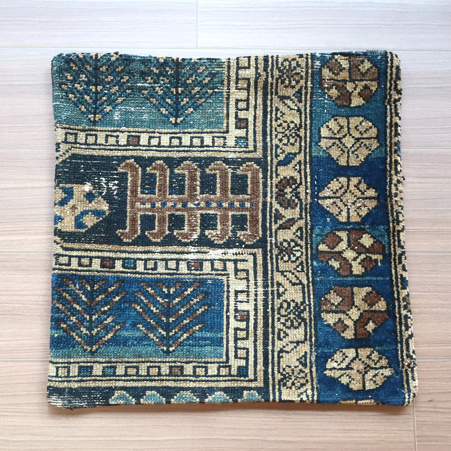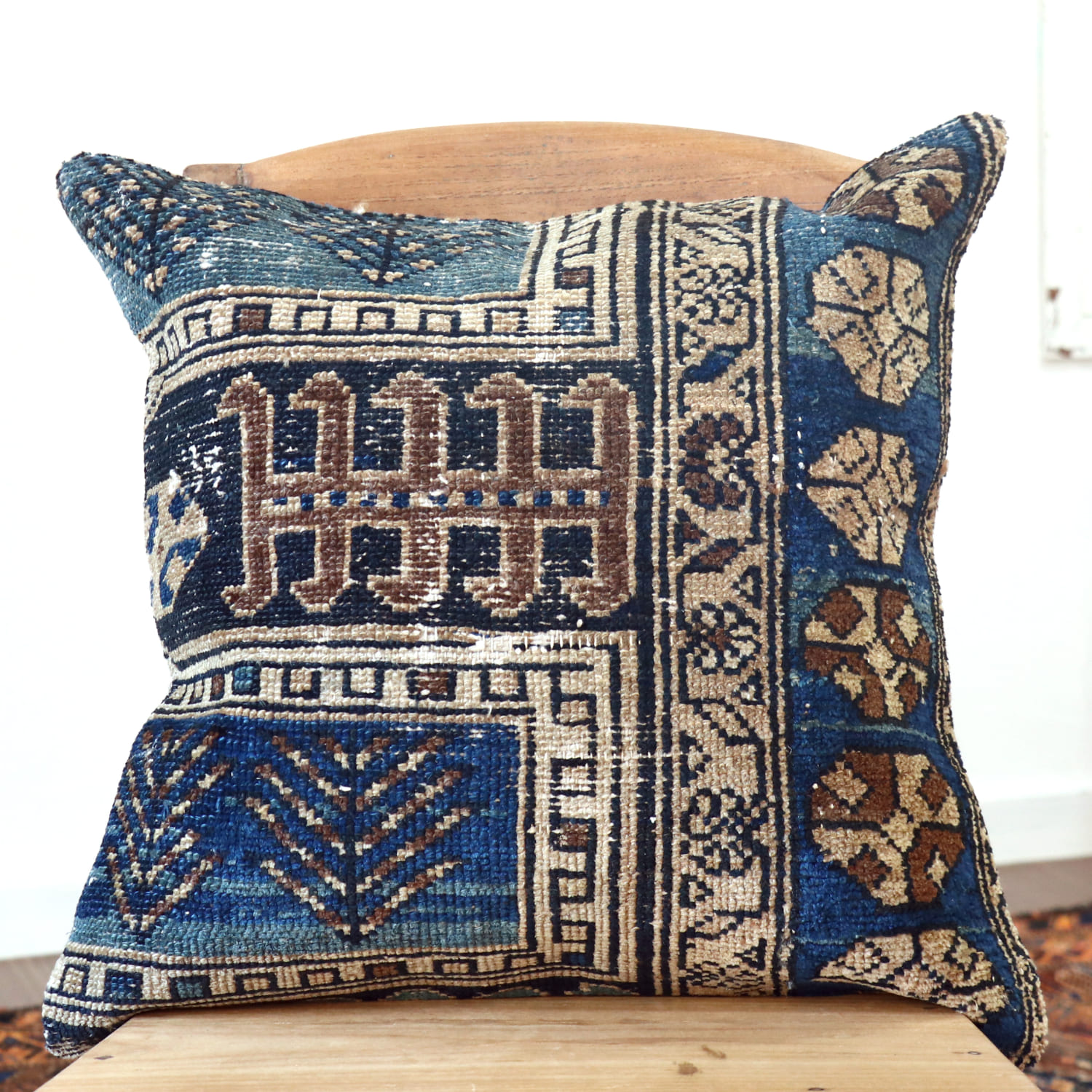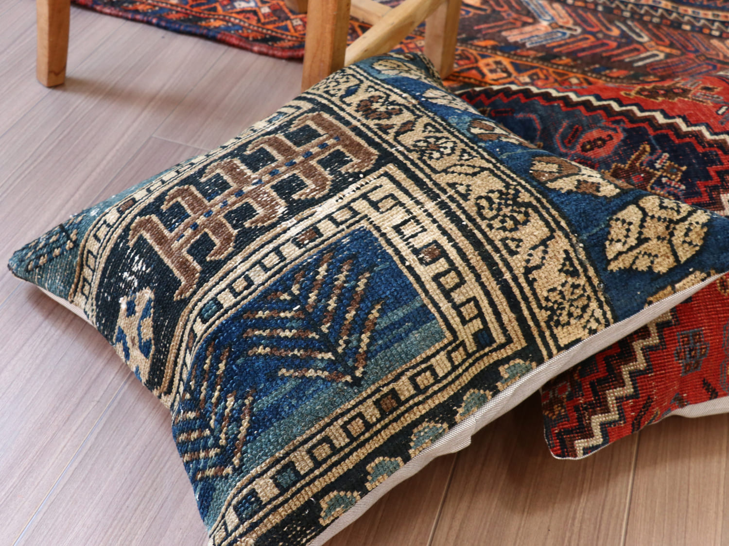| 20世紀後半に織られたラグからカットされたパイル織り絨毯のクッションカバーです。イラン南部に暮らすカシュカイ族のもので、ブルー、ネイビー、ブラウンのシックなカラーです。 |