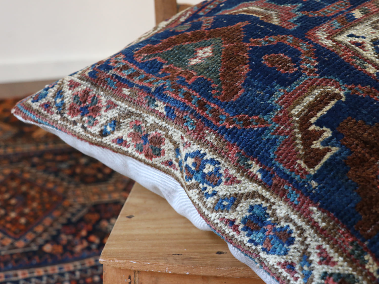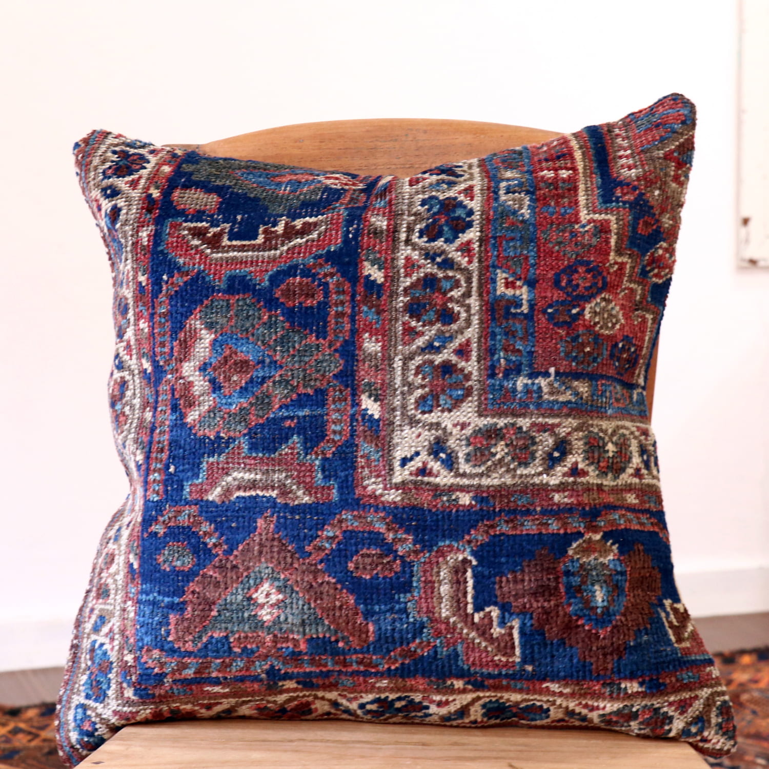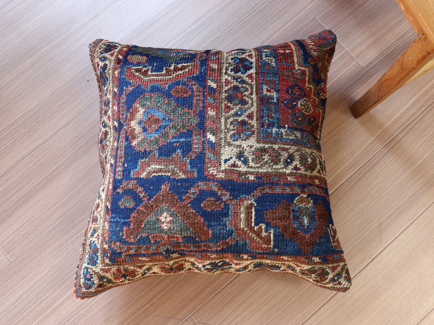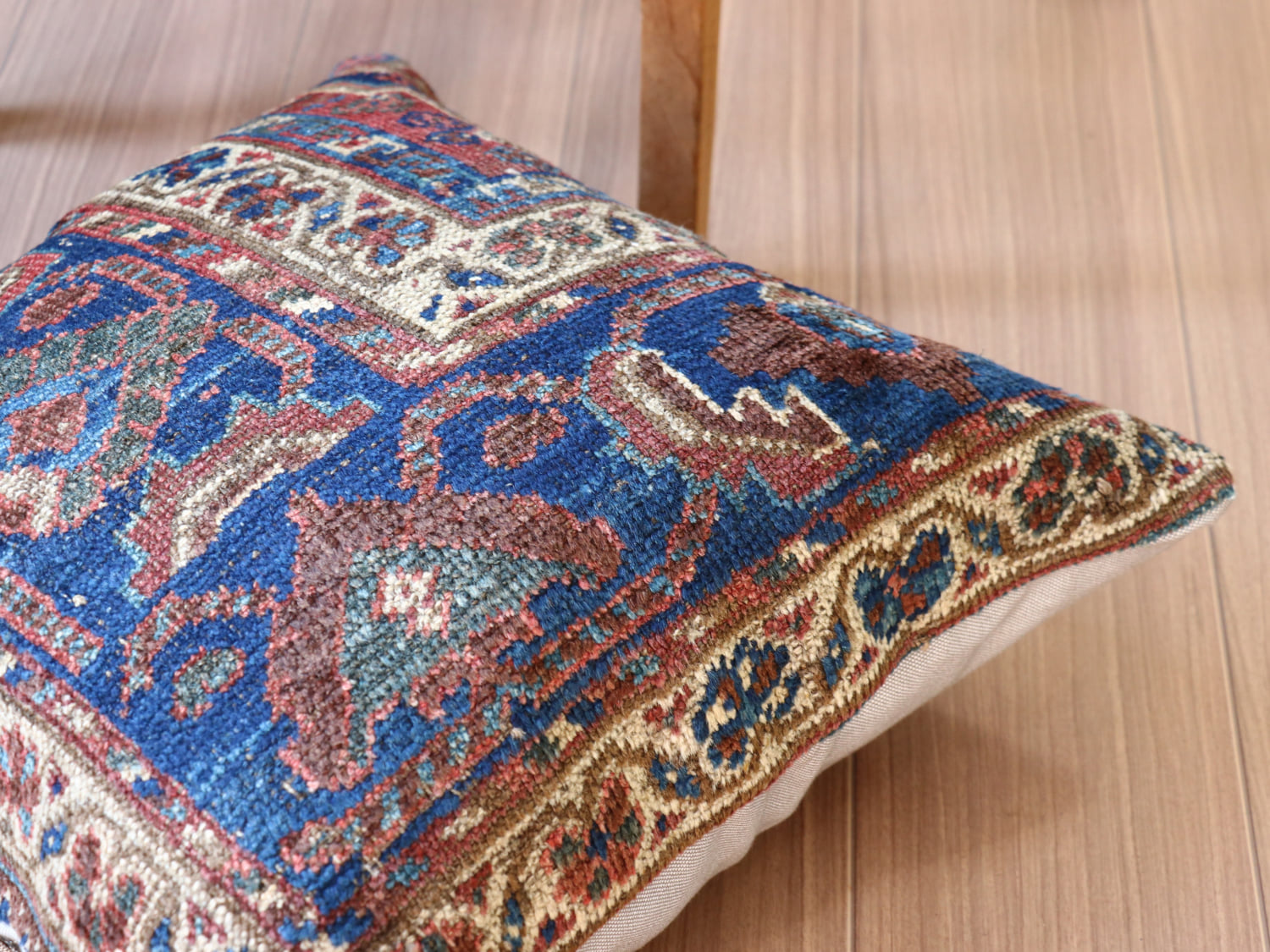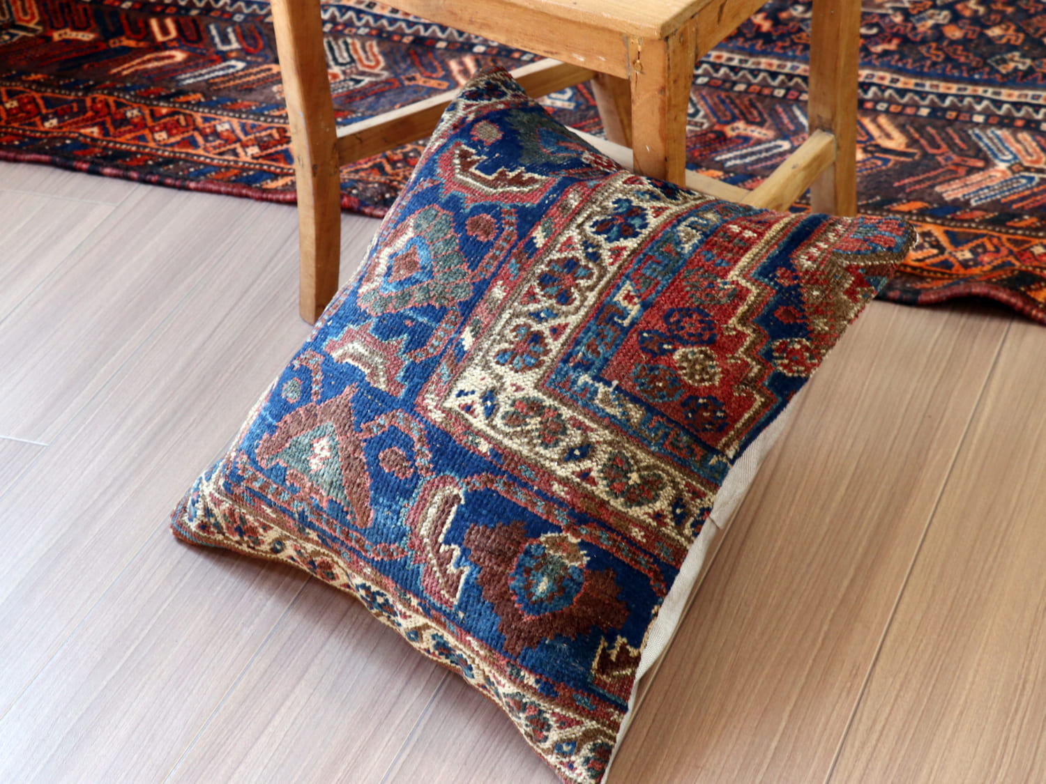 | 20世紀初頭に織られたアンティークラグからカットされたパイル織り絨毯のクッションカバーです。イラン南部に暮らすカシュカイ族のもので、天然染料による美しい色が100年経った現在でも、きれいに残っています。 |