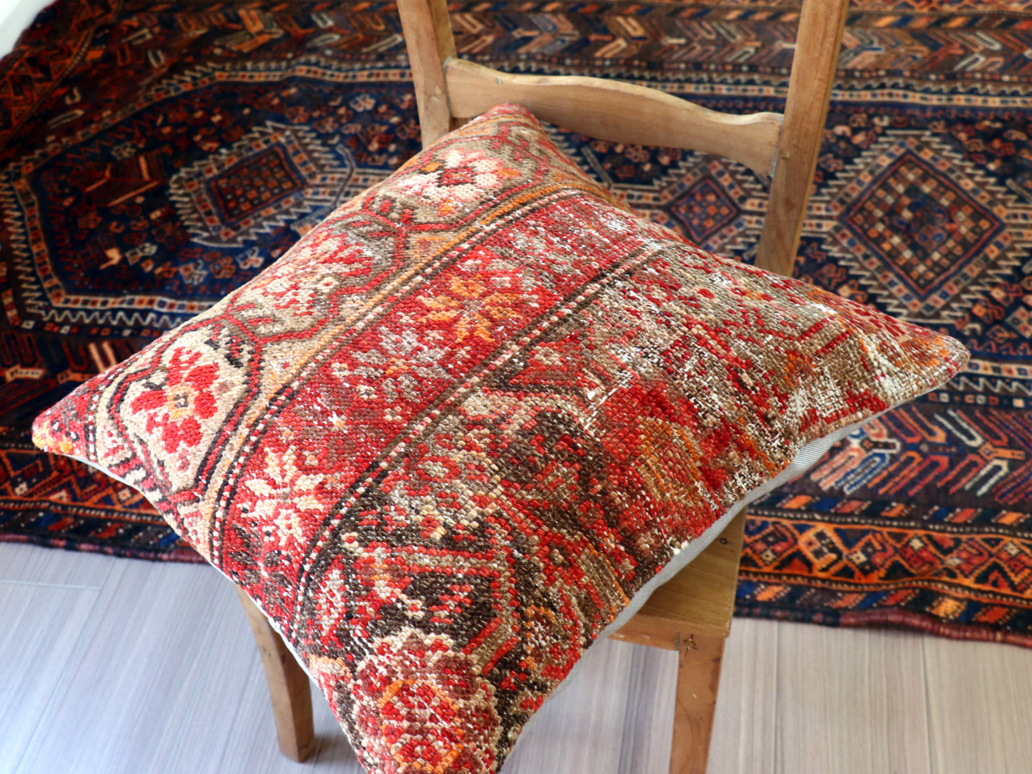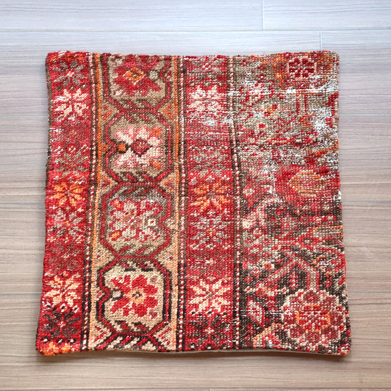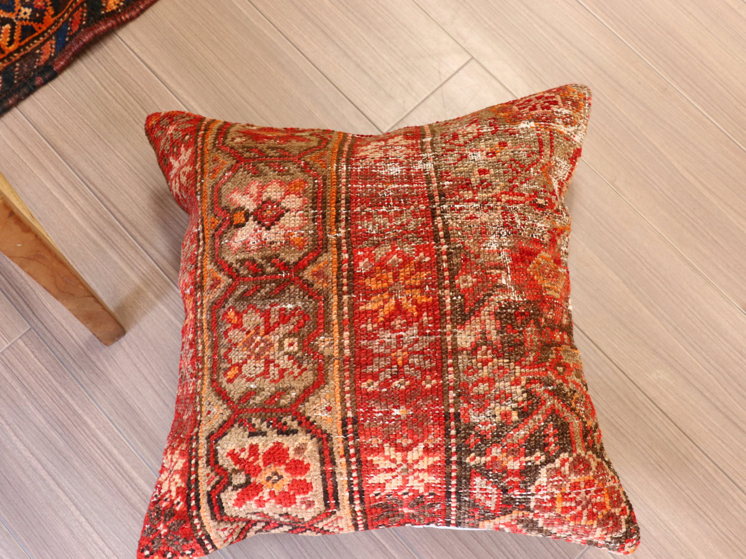 | 赤、オレンジ、ブラウンを使った温かみのある色使い。20世紀中頃に織られた、古いじゅうたんからカットされたクッションカバーです。 |