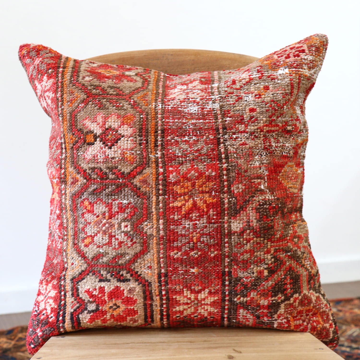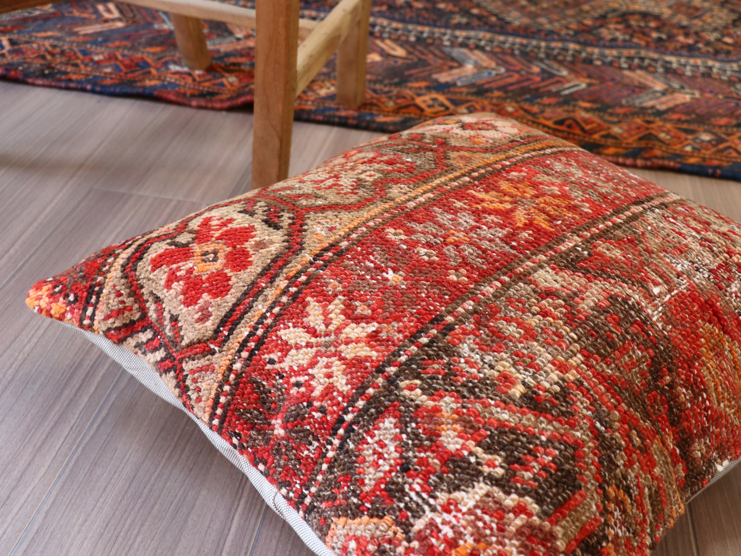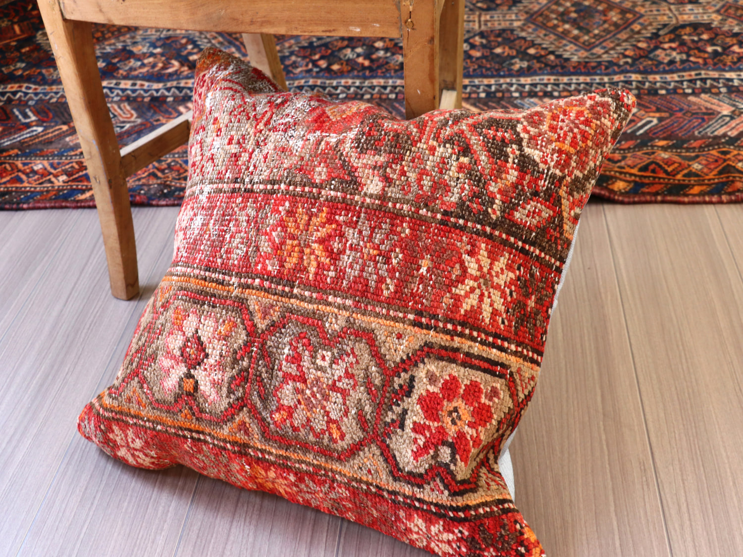 | 赤、オレンジ、ブラウンを使った温かみのある色使い。20世紀中頃に織られた、古いじゅうたんからカットされたクッションカバーです。 |