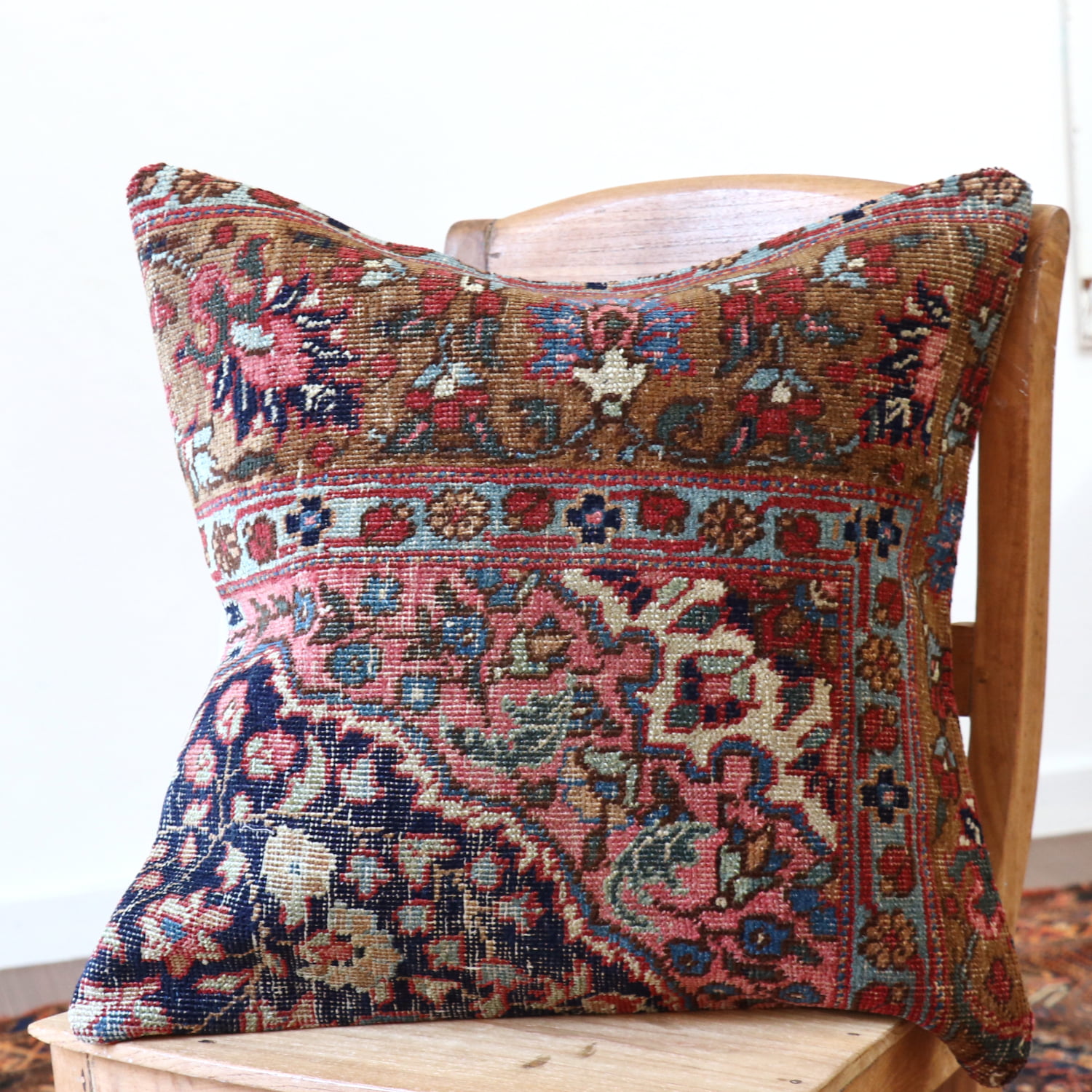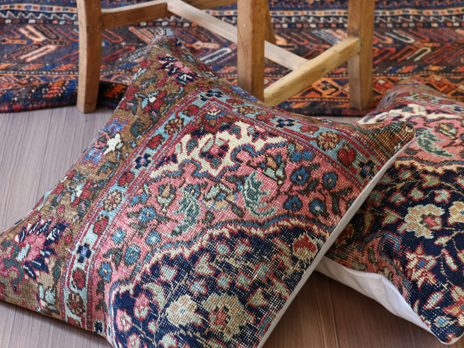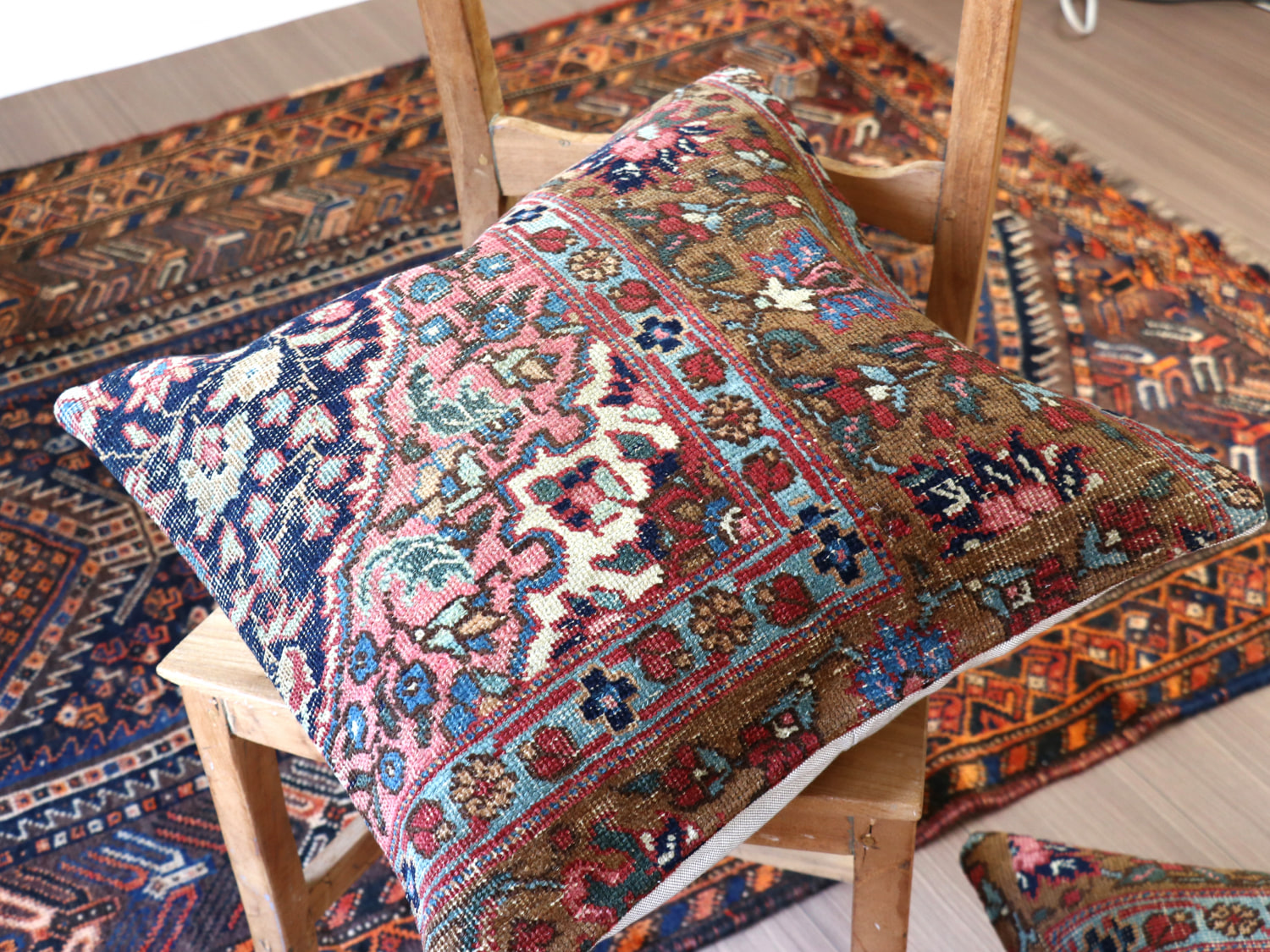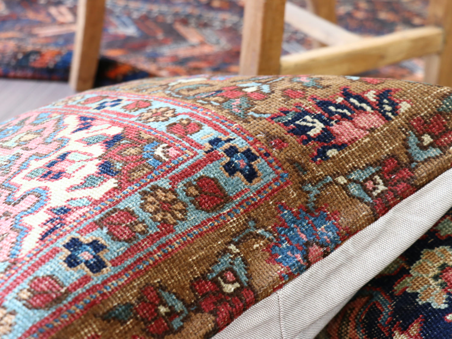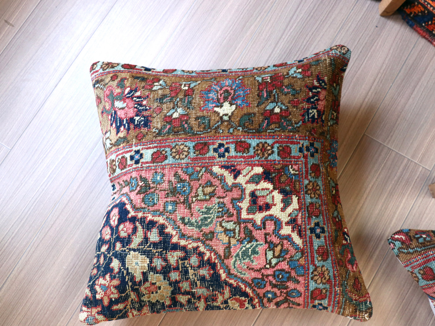 | イラン北部、トルコに近いタブリーズエリアの緻密な織りの絨毯をカットしてクッションカバーにしました。織り目がぎゅっと詰まって、厚みのあるがっちりした織りの絨毯です。20世紀中ごろに織られたもので、表面は使い古してパイル(毛足)は擦り切れているところがありますが、織られた当時の色をきれいに残しています。 |