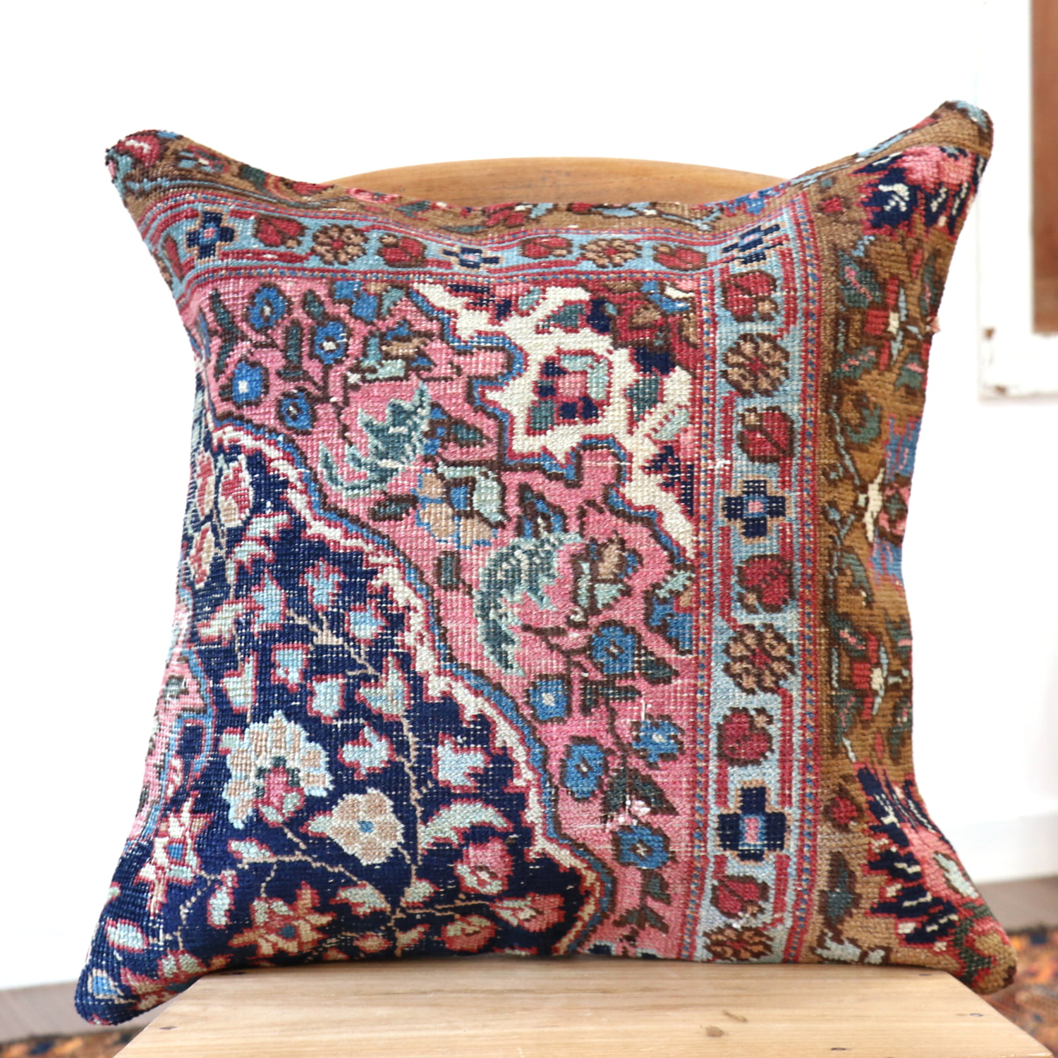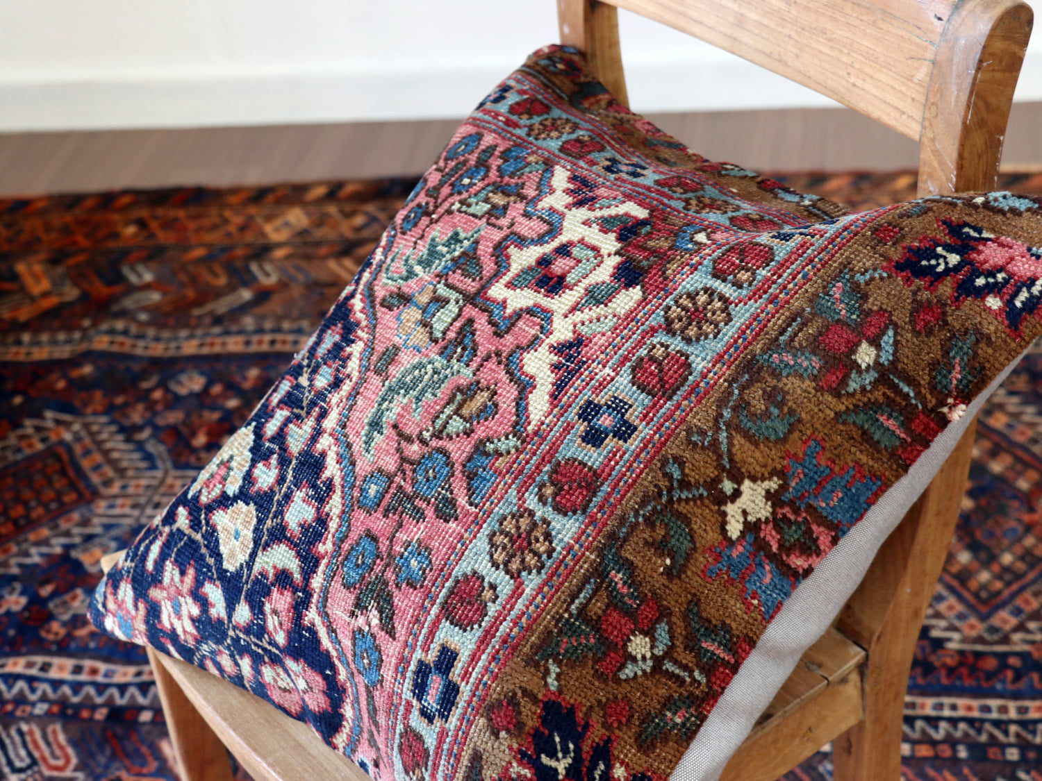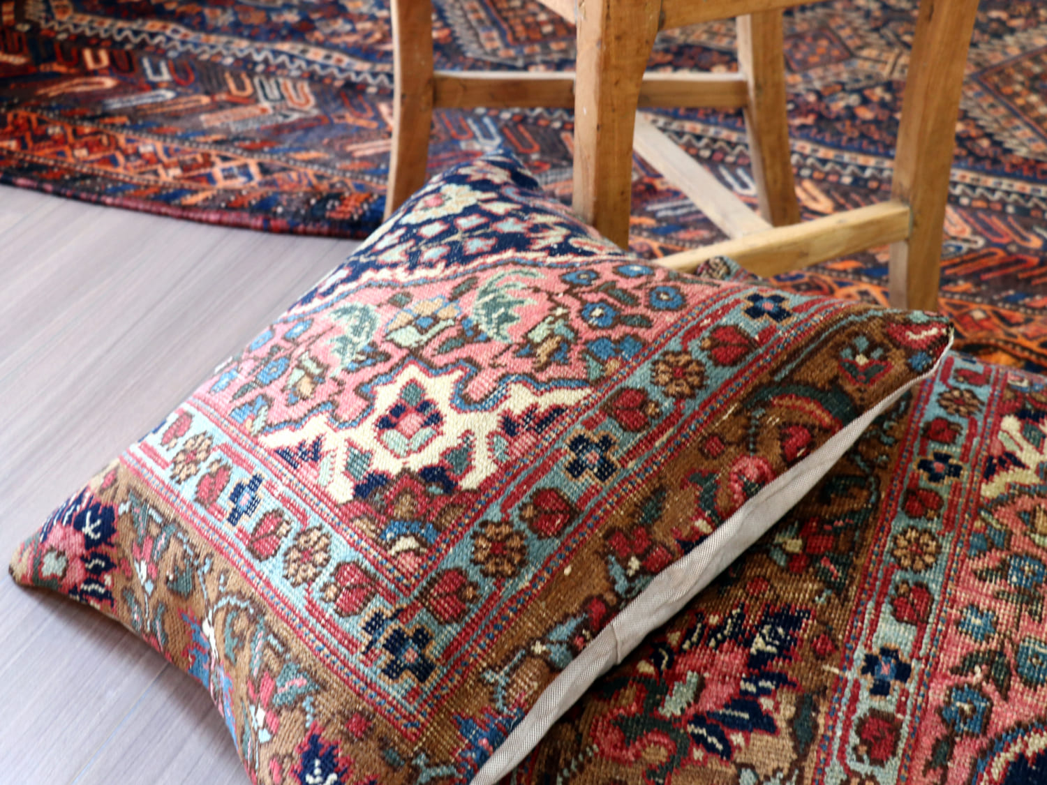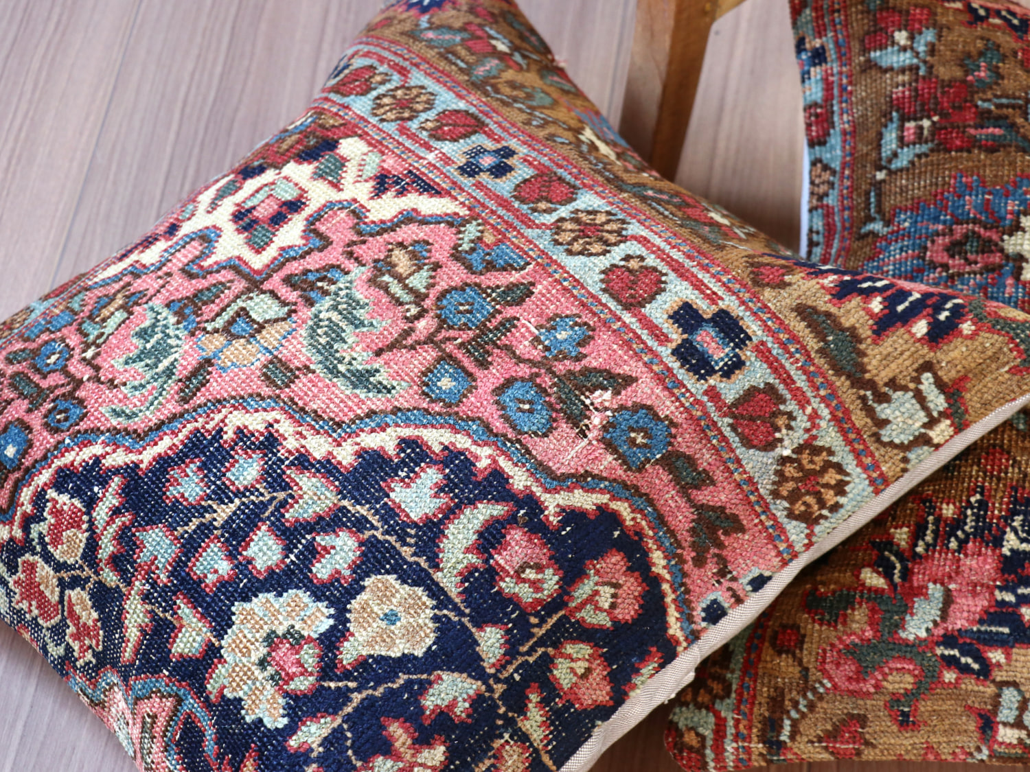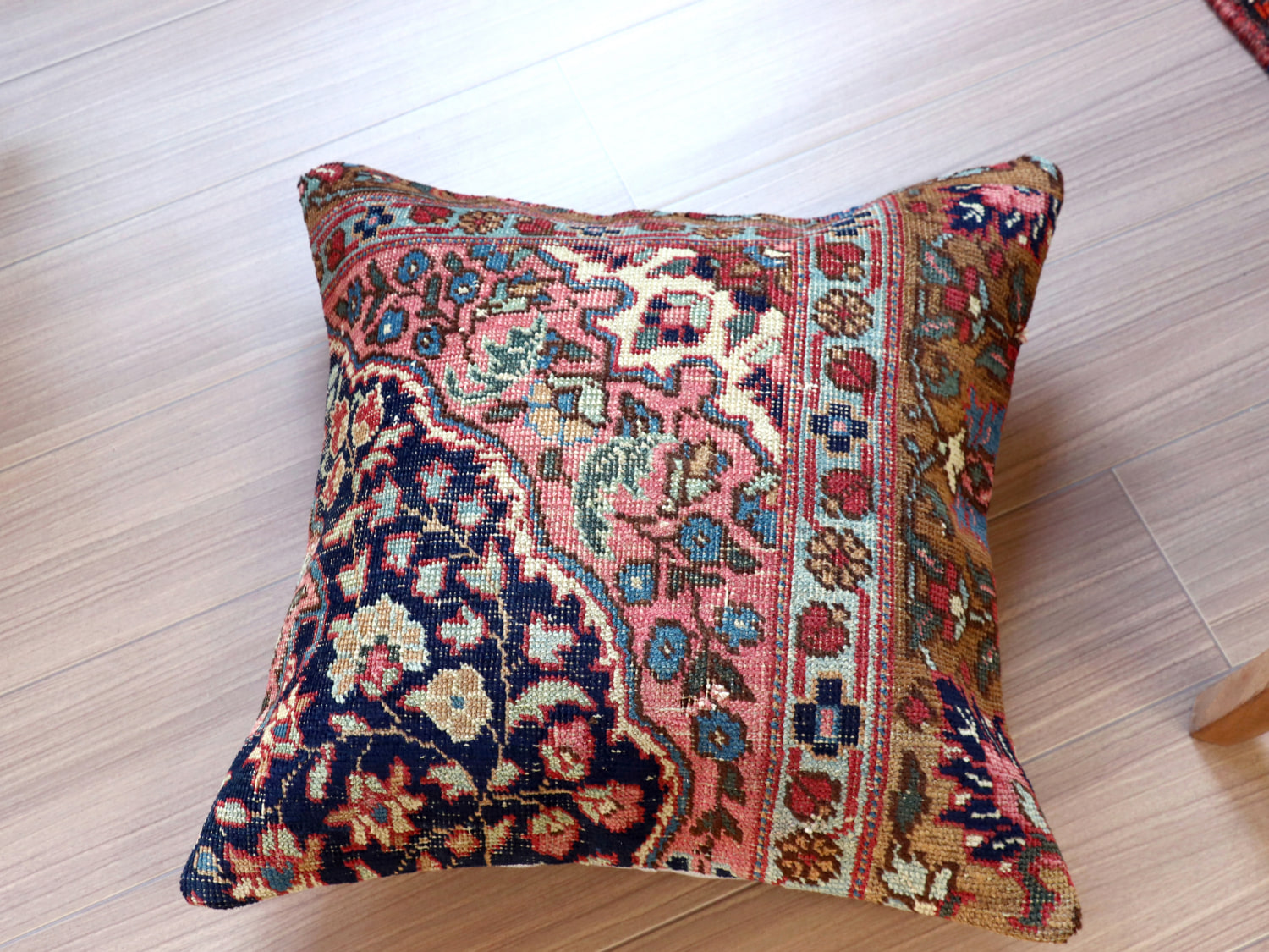 | イラン北部、トルコに近いタブリーズエリアの緻密な織りの絨毯をカットしてクッションカバーにしました。織り目がぎゅっと詰まって、厚みのあるがっちりした織りの絨毯です。20世紀中ごろに織られたもので、表面は使い古してパイル(毛足)は擦り切れているところがありますが、織られた当時の色をきれいに残しています。 |