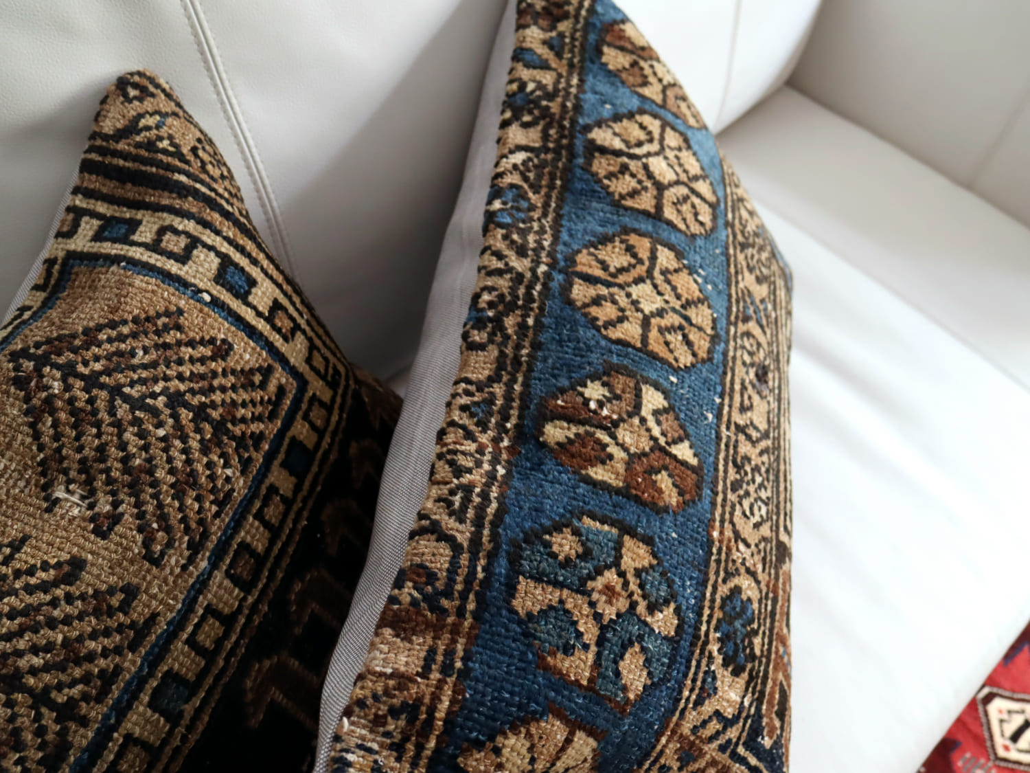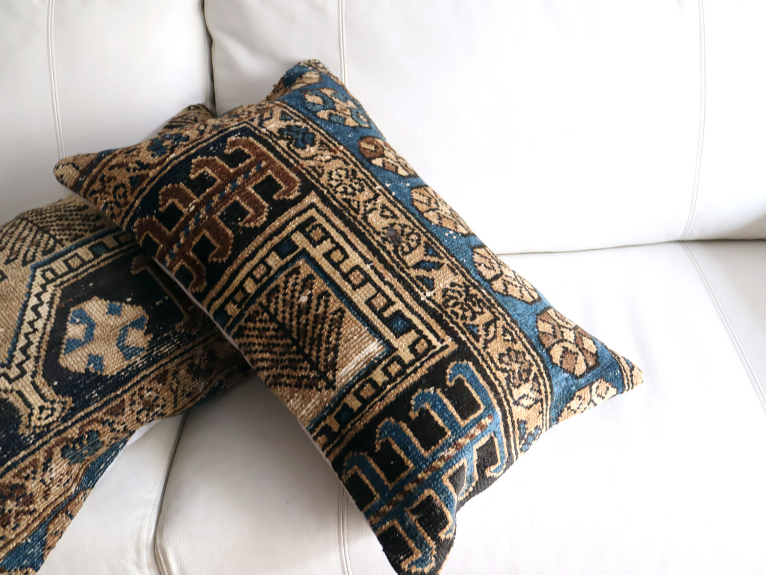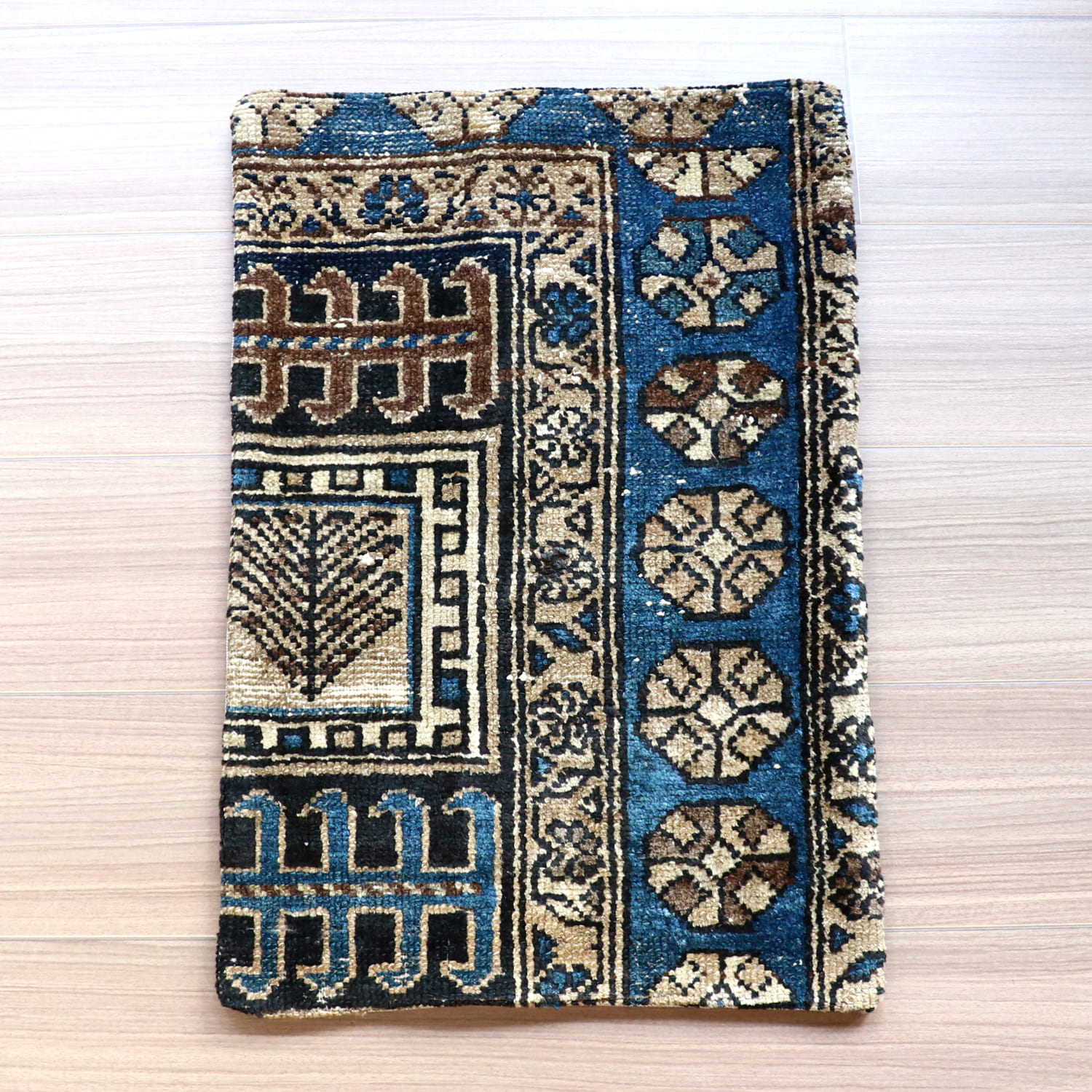| 20世紀後半に織られたラグからカットされたパイル織り絨毯のクッションカバーです。イラン南部に暮らすカシュカイ族のもので、ブルー、ネイビー、ブラウンのシックなカラーです。 |