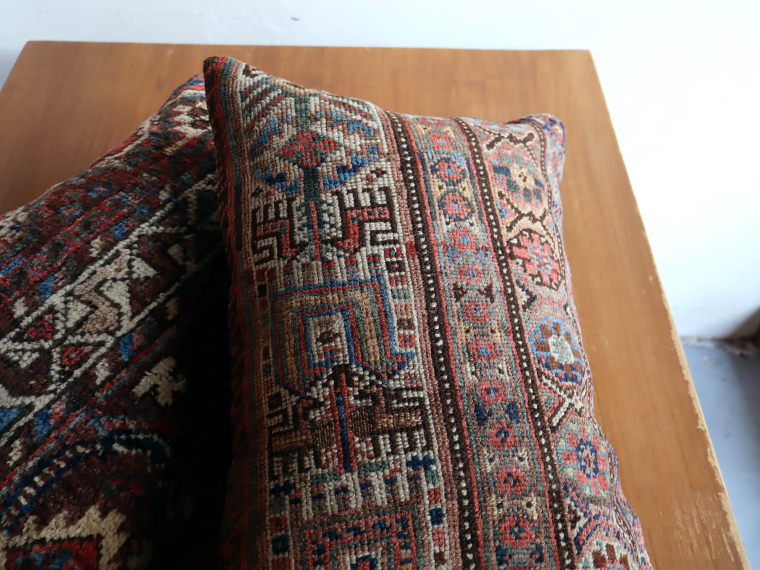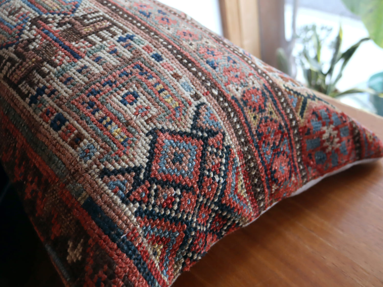 | コーカサス地方(現在のアゼルバイジャン)で織られた年代の古いじゅうたんからカットされたクッションカバーです。グレーや色あせた赤など全体的に色あせてやわらかな印象。 |
