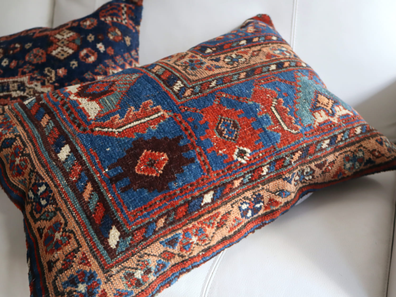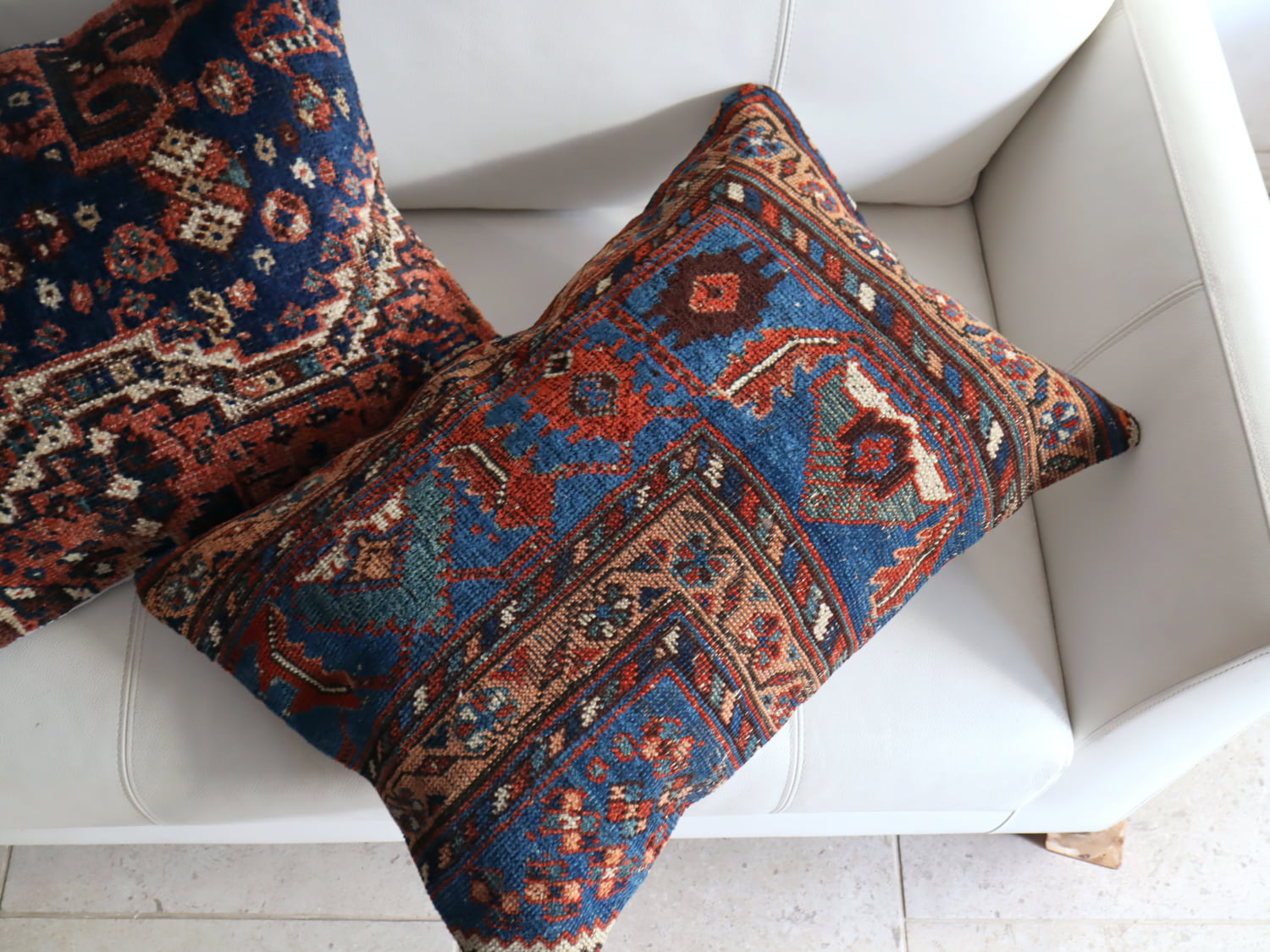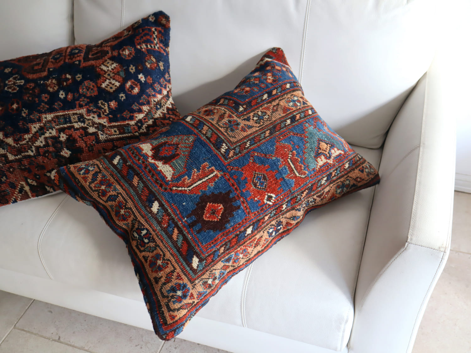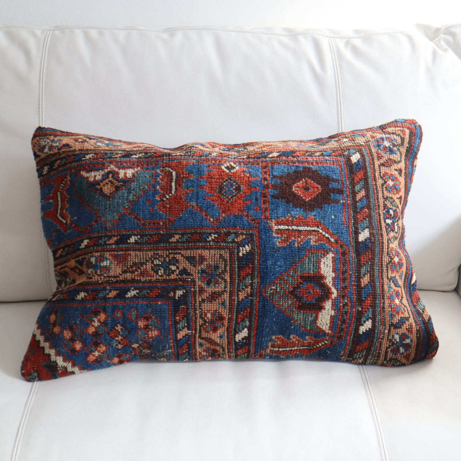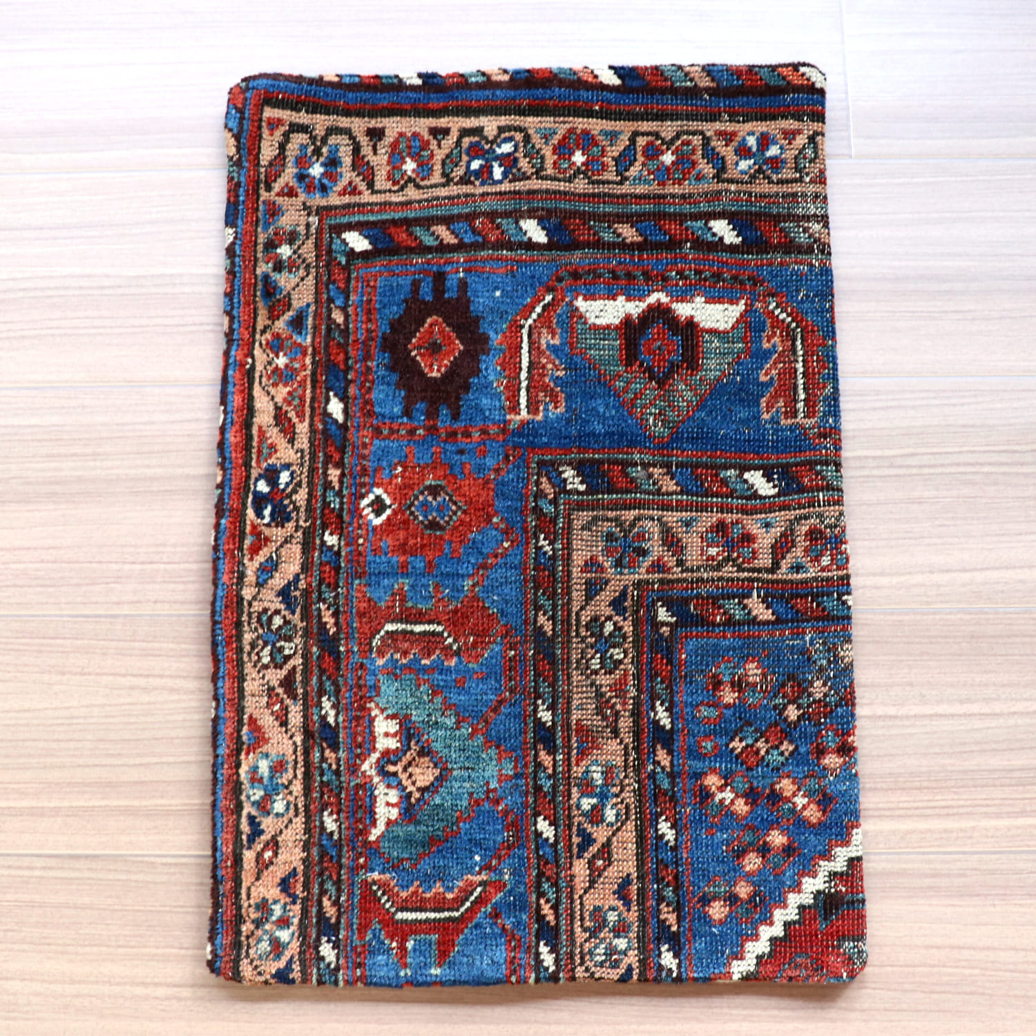 | 20世紀初頭に織られたアンティークラグからカットされたパイル織り絨毯のクッションカバーです。イラン南部に暮らすカシュカイ族のもので、天然染料による美しい色が100年経った現在でも、きれいに残っています。 |