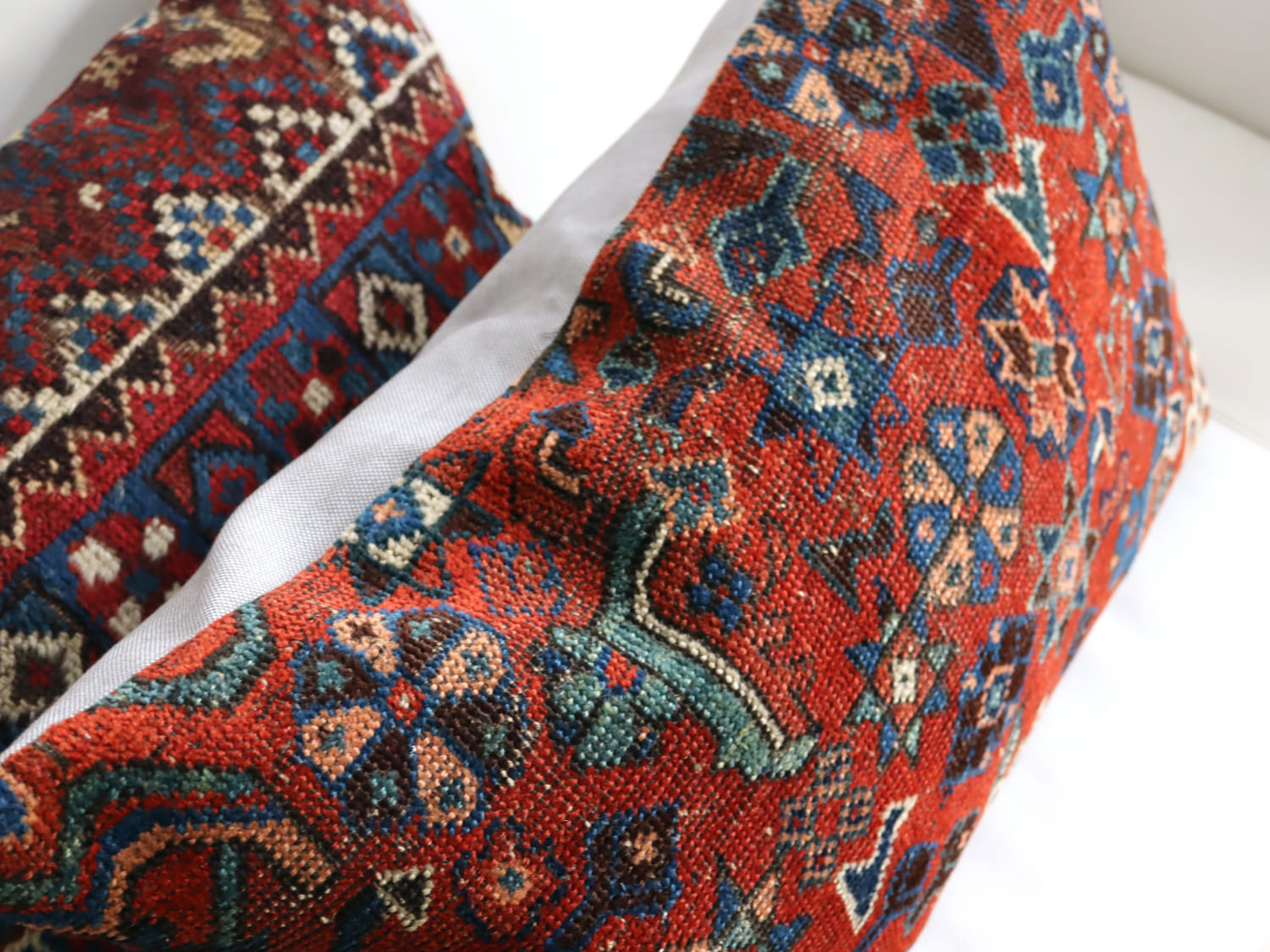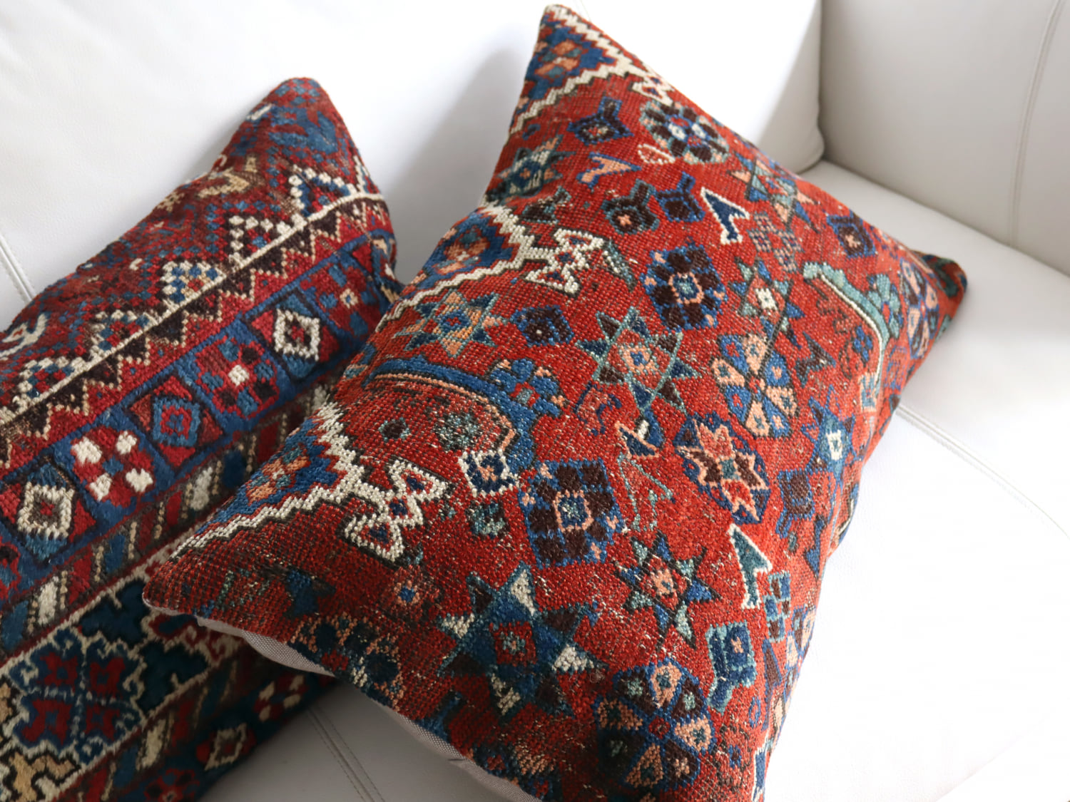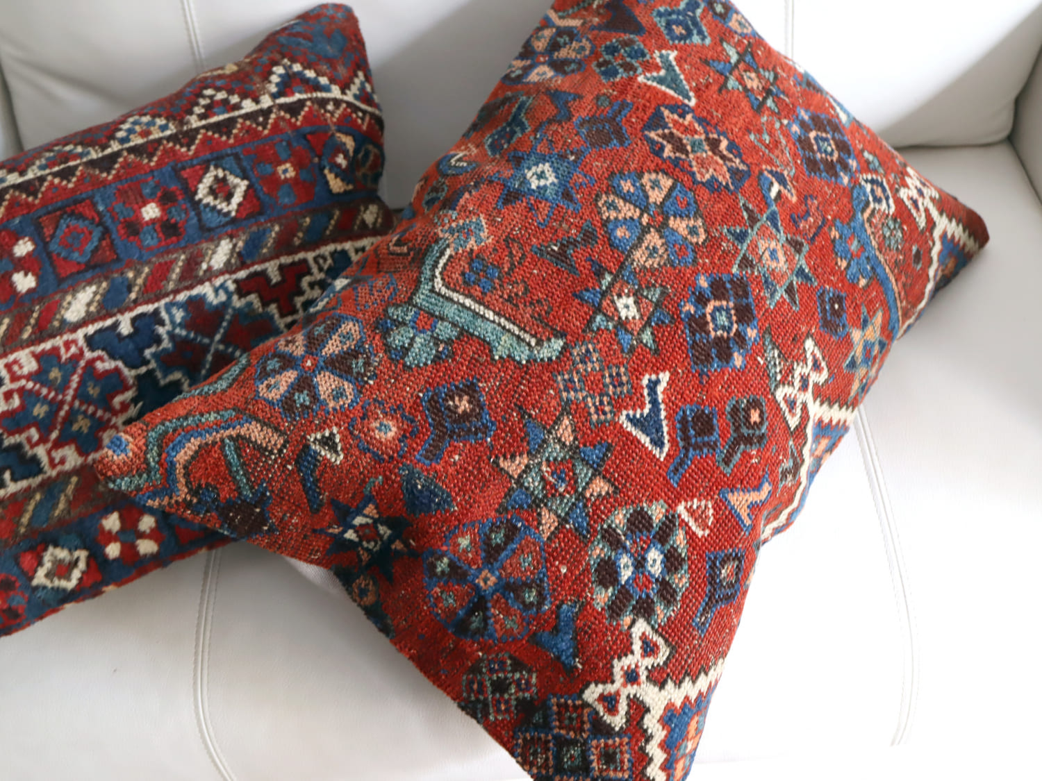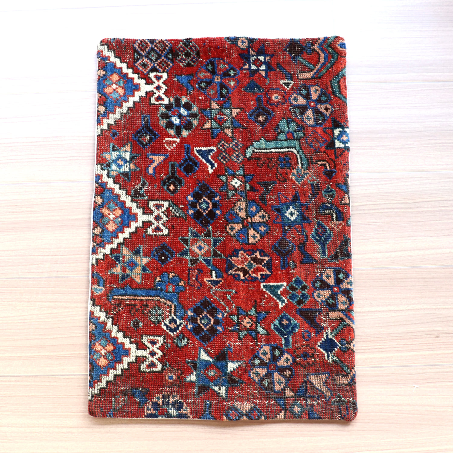 | 20世紀初頭に織られたアンティークラグからカットされたパイル織り絨毯のクッションカバーです。イラン南部に暮らすカシュカイ族のもので、天然染料による美しい色が100年経った現在でも、きれいに残っています。 |