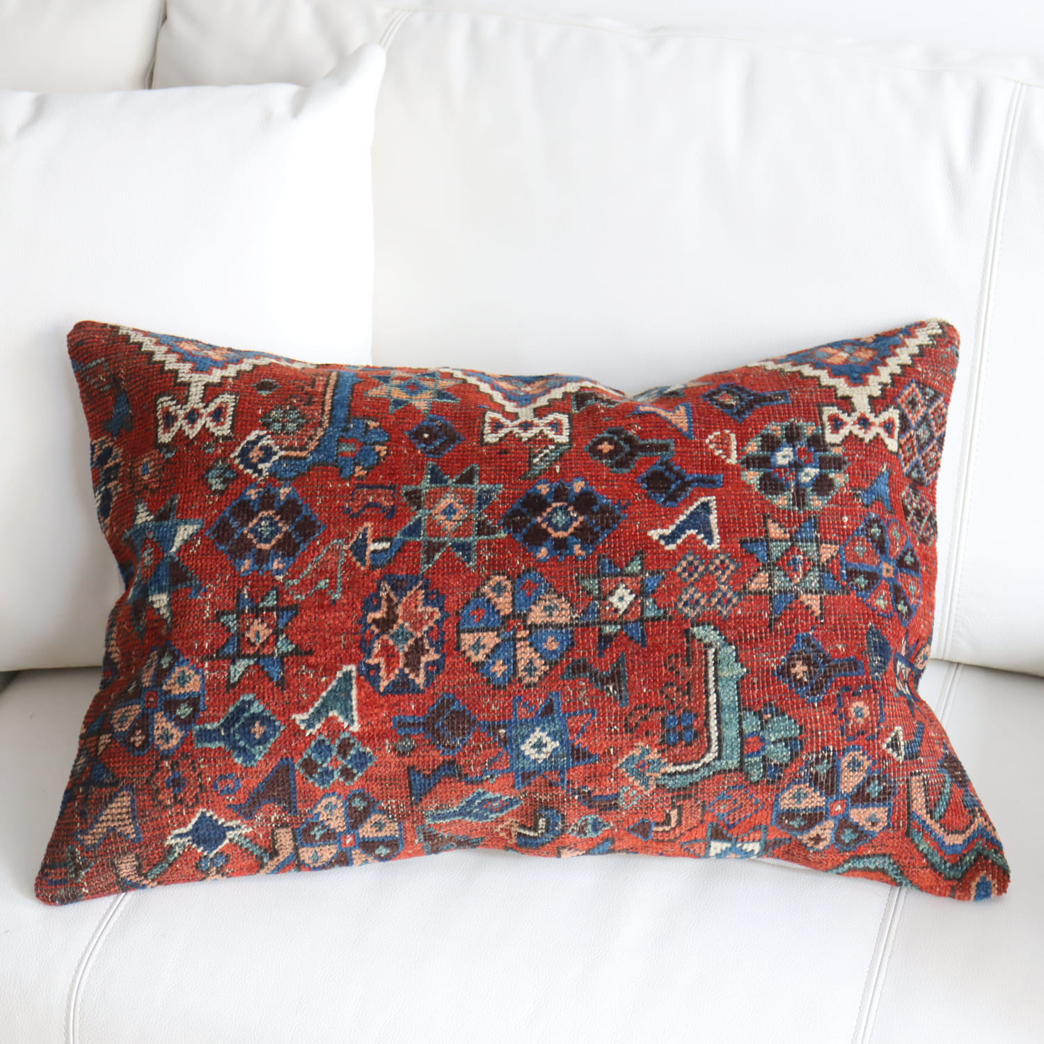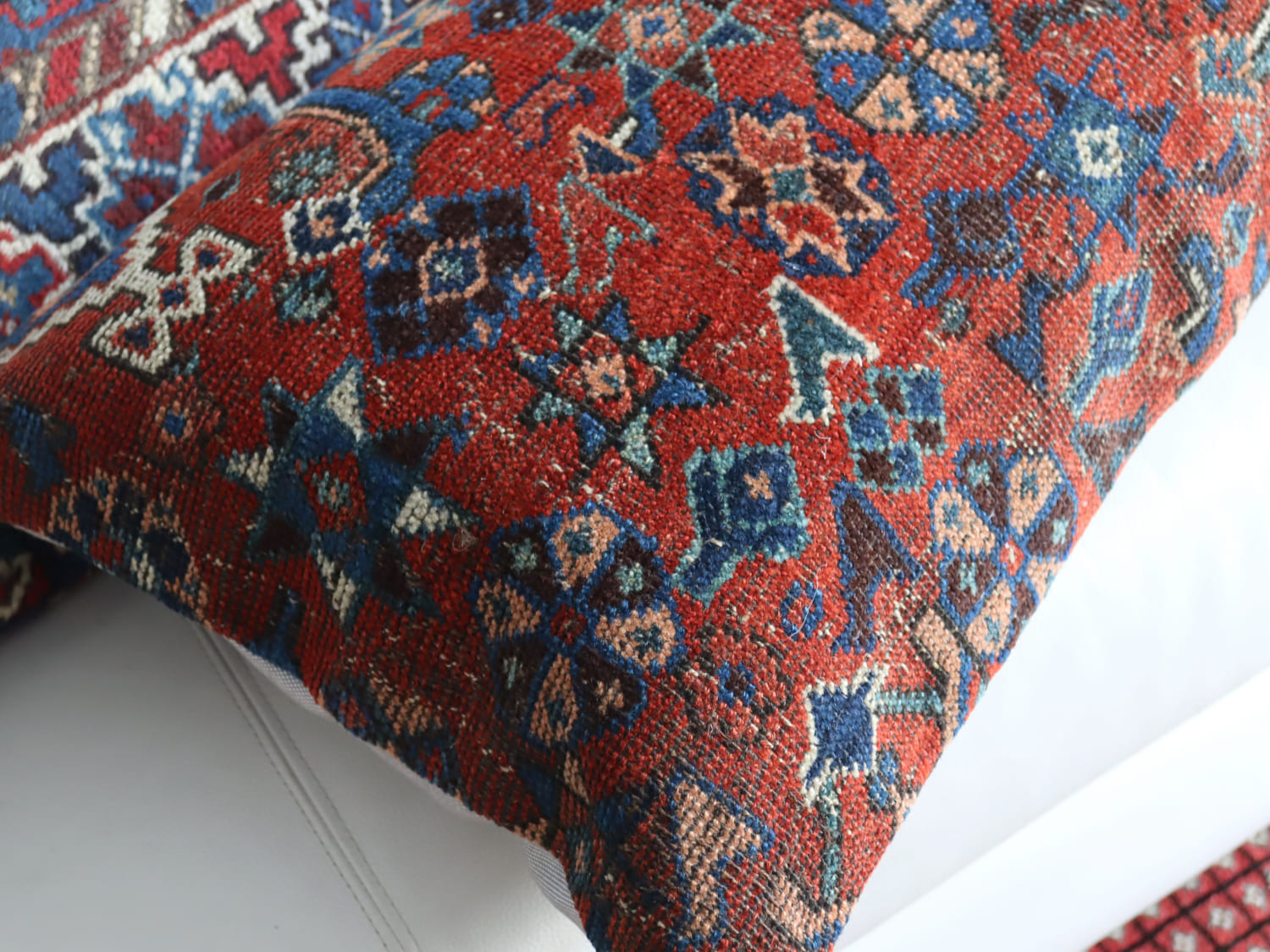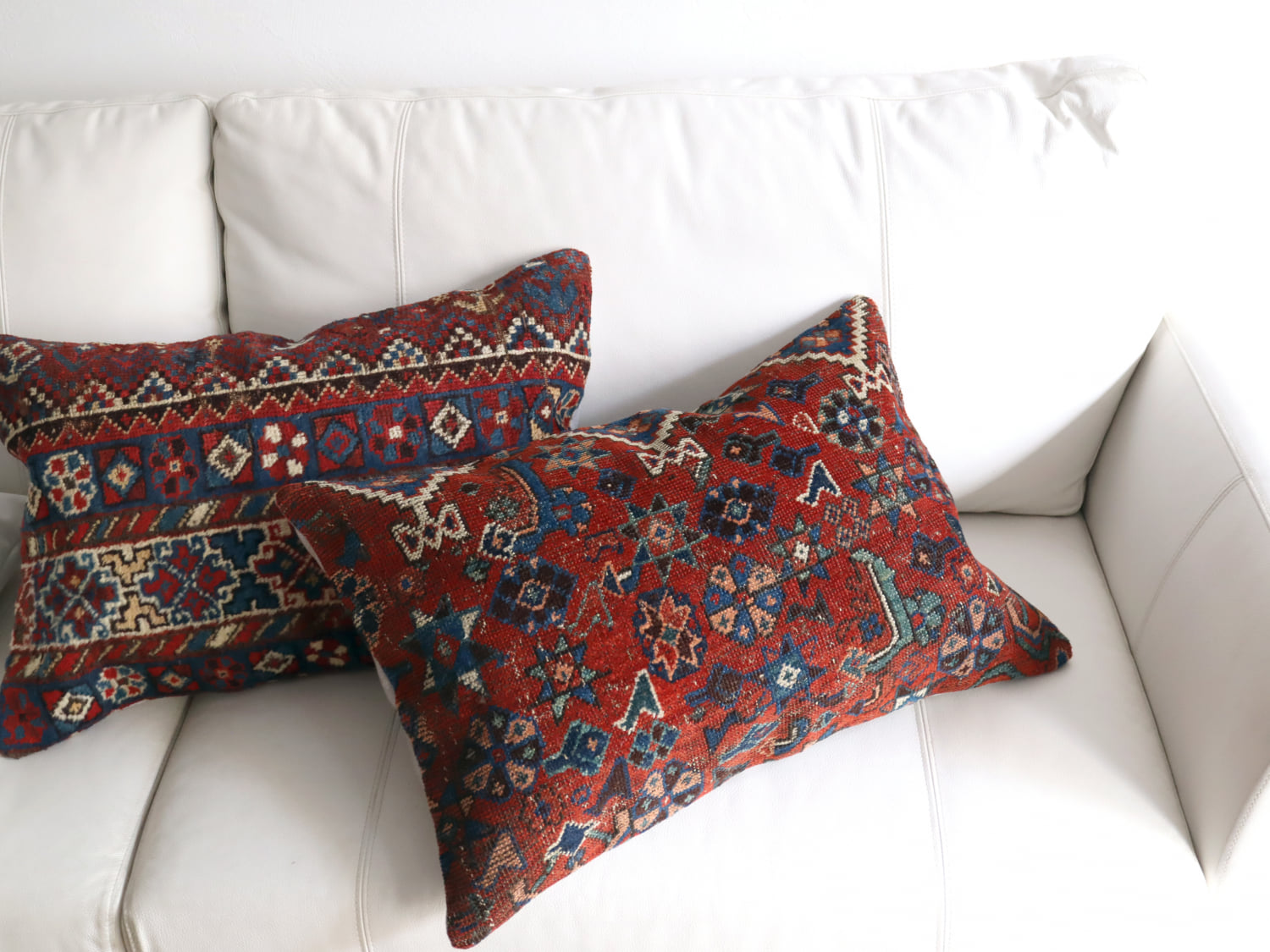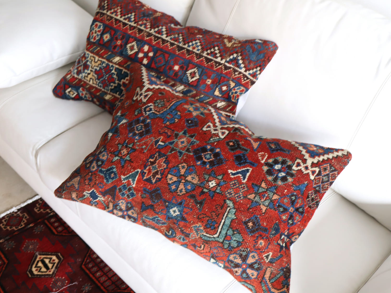 | 20世紀初頭に織られたアンティークラグからカットされたパイル織り絨毯のクッションカバーです。イラン南部に暮らすカシュカイ族のもので、天然染料による美しい色が100年経った現在でも、きれいに残っています。 |