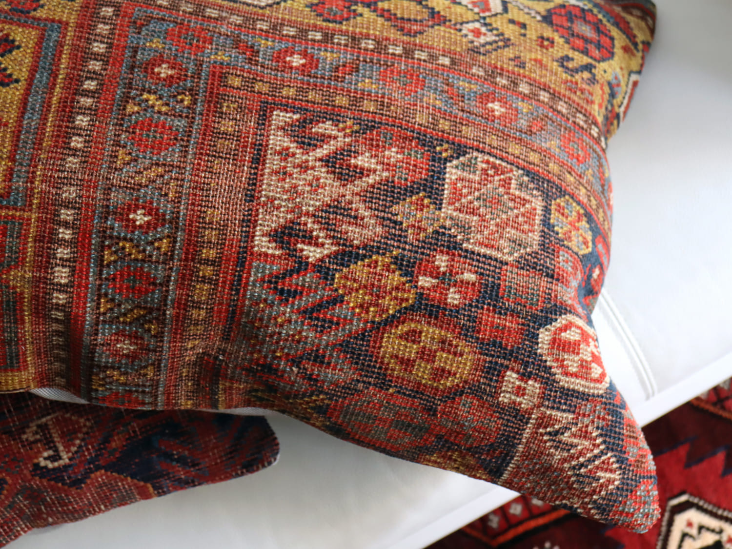 | 20世紀初頭に織られたアンティークラグからカットされたパイル織り絨毯のクッションカバーです。天然染料で染めた色合いと、ユニークな幾何学モチーフが楽しめるコレクションピースです。 |