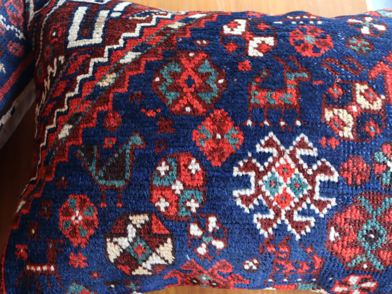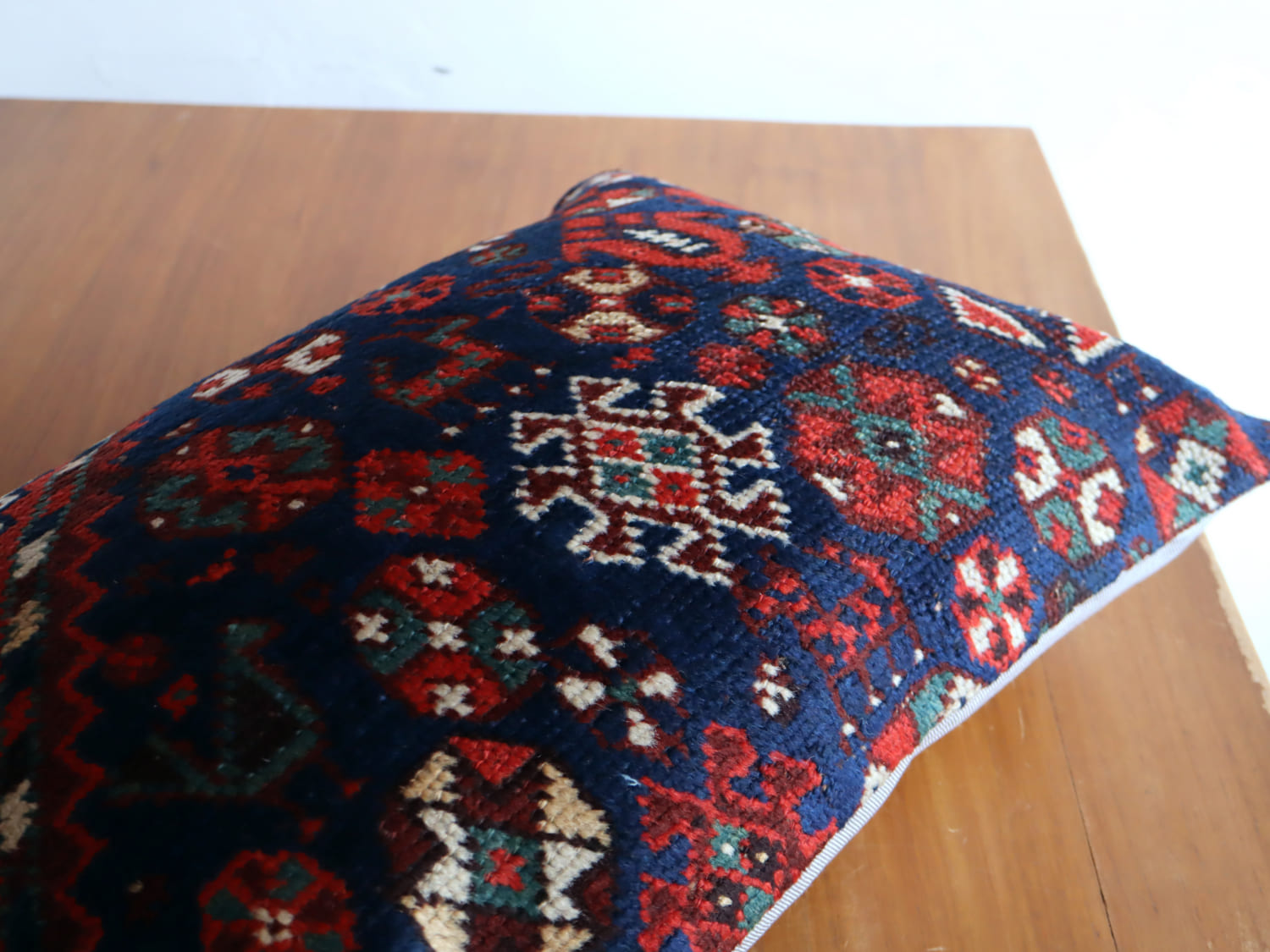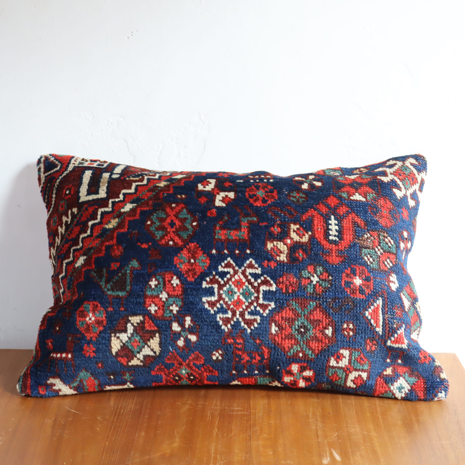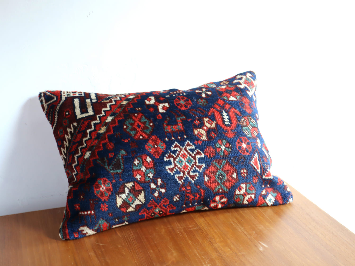| 20世紀初頭に織られたアンティークラグからカットされたパイル織り絨毯のクッションカバーです。イラン南部に暮らすカシュカイ族のもので、天然染料による美しい色が100年経った現在でも、きれいに残っています。 |
