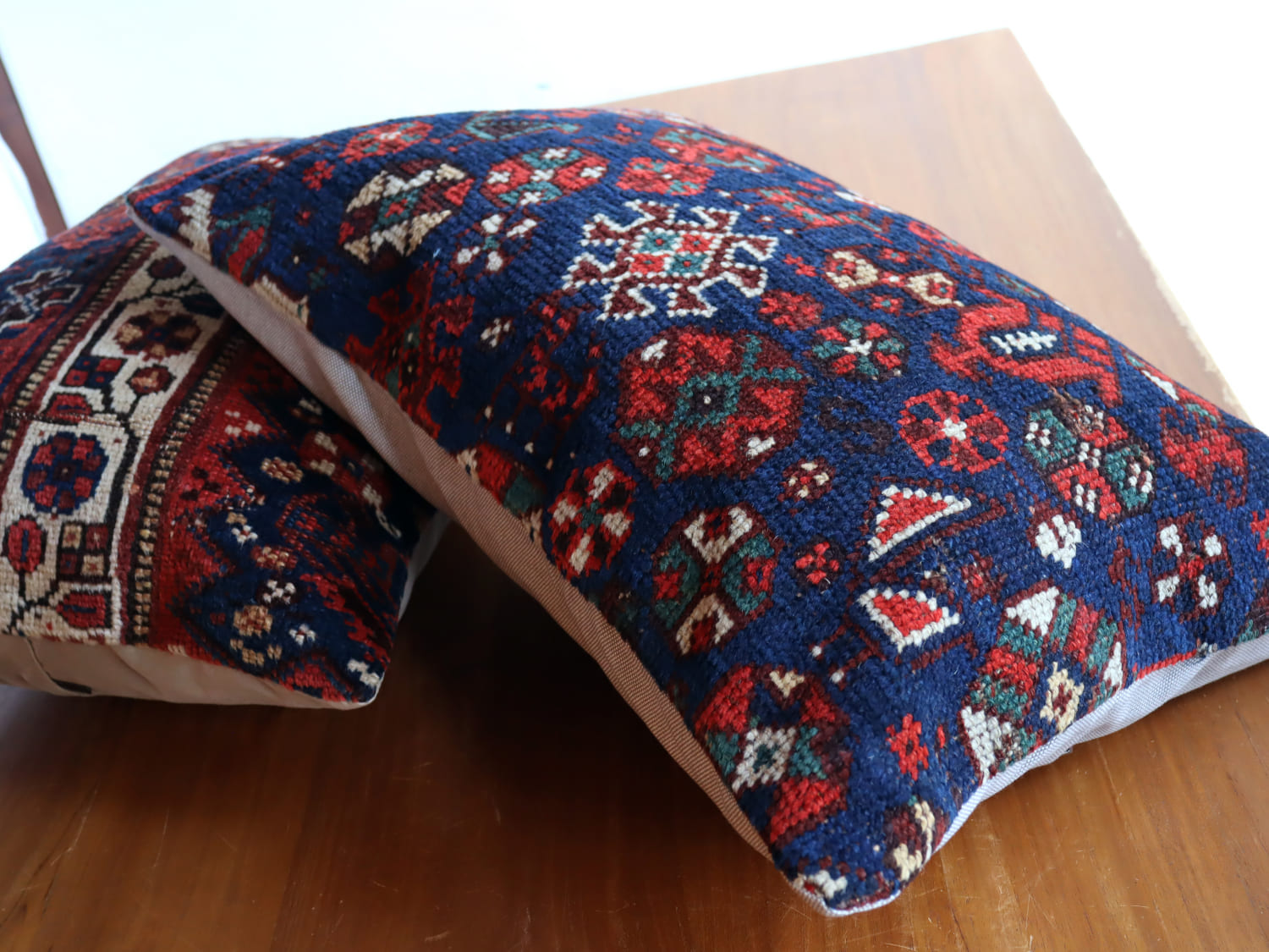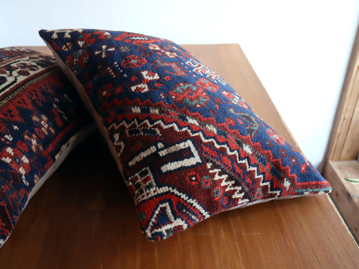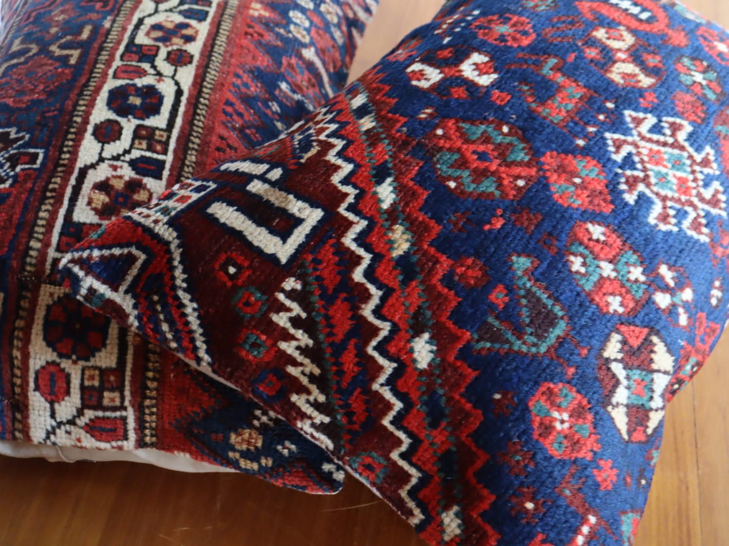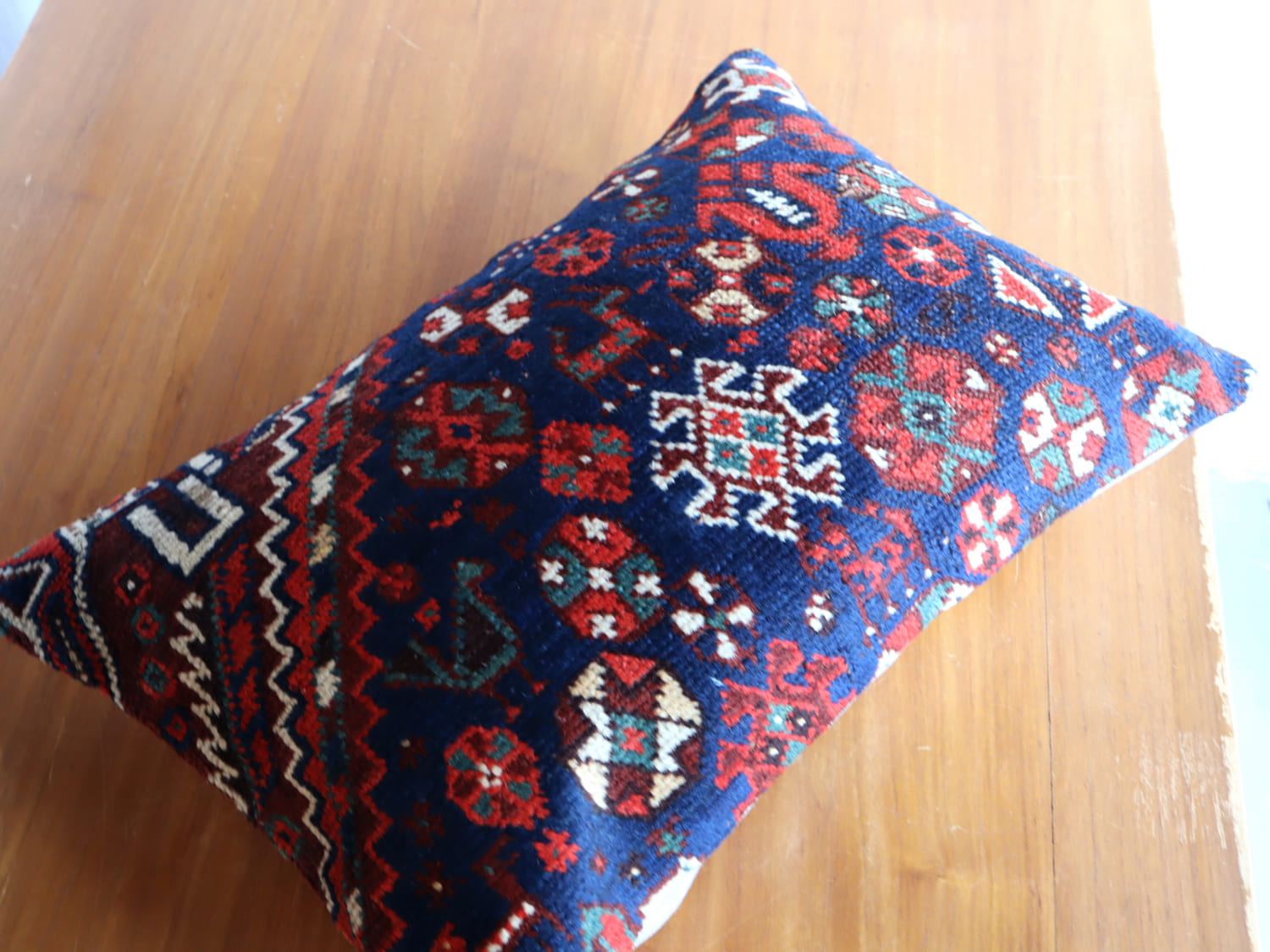 | 20世紀初頭に織られたアンティークラグからカットされたパイル織り絨毯のクッションカバーです。イラン南部に暮らすカシュカイ族のもので、天然染料による美しい色が100年経った現在でも、きれいに残っています。 |