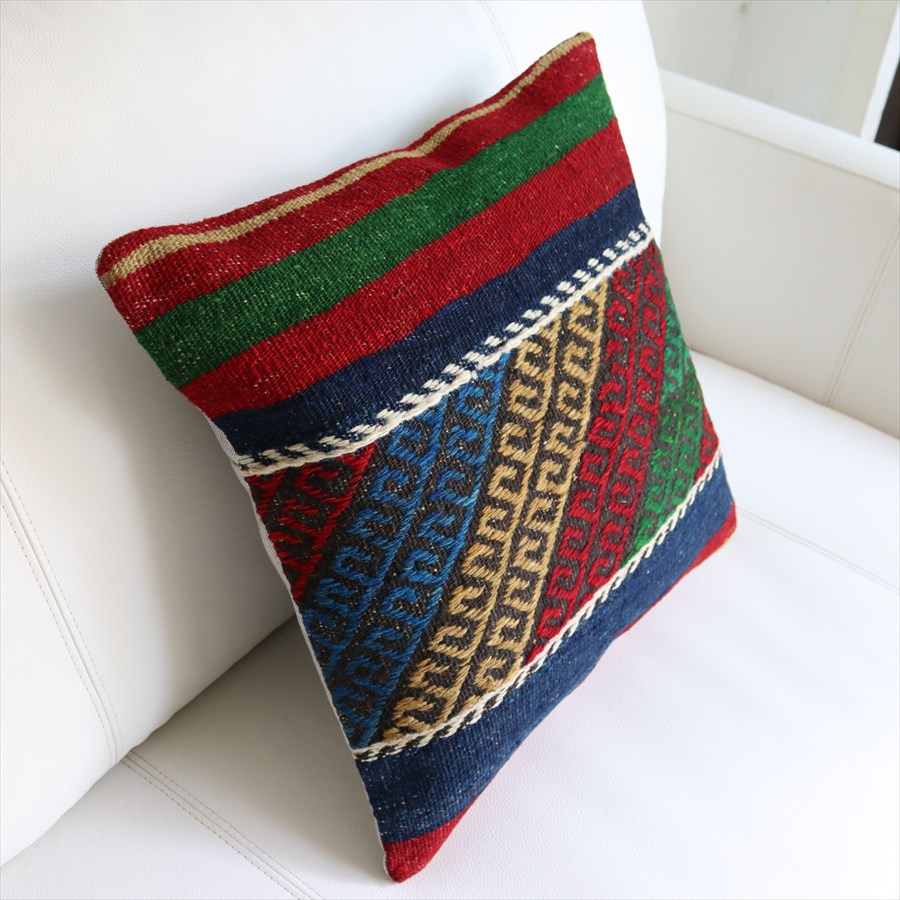 4. オールドキリムクッションカバー40cm角 Kilim Cushion シンプルボーダー・レッド&ブルー&グリーン