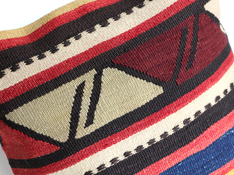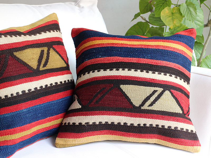オールドキリムクッションカバー40cmサイズ/Old Kilim Cushion ブルー・レッド・イエローのボーダー