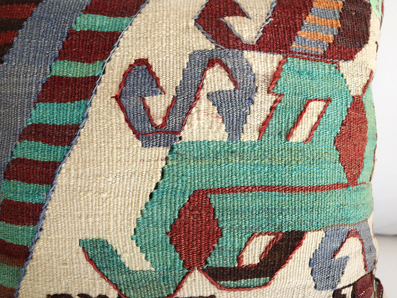 | 大型のチフカナットキリム(左右別々に織って中央ではぎ合わせる)で、モチーフがたくさん入った賑やかなデザインのキリムからのカット。ナチュラルアイボリーの地にグリーンとブルー(元は紫色)、黒みがかった赤色が使われています。 |