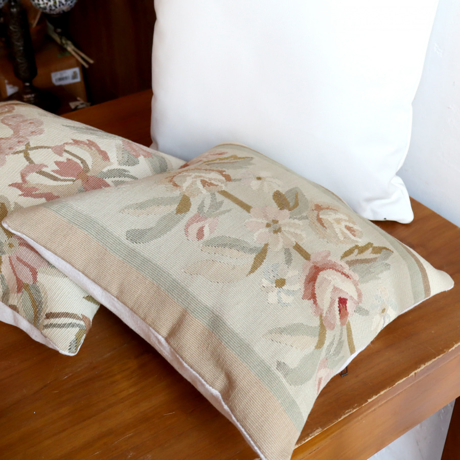| クリーム色のベースに淡いピンクやグリーンで一面に花模様が織り込まれたルーマニア地方のキリムです。もともと大きなサイズのキリムだったようで、連続していたデザインのクッションが20枚ほどはいってきました。ところどころ、色のニジミ、うすいシミなどがありますことをご了承ください。 |