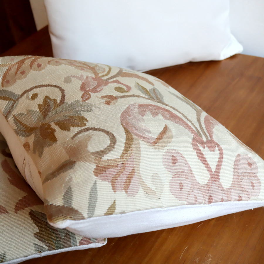 クリーム色のベースに淡いピンクやグリーンで一面に花模様が織り込まれたルーマニア地方のキリムです。もともと大きなサイズのキリムだったようで、連続していたデザインのクッションが20枚ほどはいってきました。ところどころ、色のニジミ、うすいシミなどがありますことをご了承ください。