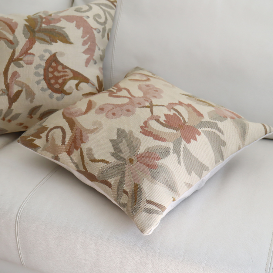 クリーム色のベースに淡いピンクやグリーンで一面に花模様が織り込まれたルーマニア地方のキリムです。もともと大きなサイズのキリムだったようで、連続していたデザインのクッションが20枚ほどはいってきました。ところどころ、色のニジミ、うすいシミなどがありますことをご了承ください。