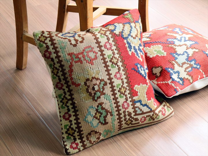 | 【オールドキリム】古い時代(主に1960-1980年代)に、一般の家庭で織られたウールの手織りキリムを表面に使ったクッションカバーです。擦り切れた個所や、日焼け、修理のあとなどがある場合がございますことをご了承ください。クッションはトルコで縫製されていて、縫製前にはきれいにクリーニングしてあります。 クッションカバーの裏面は無地のコットン、色はそれぞれ異なりますので表記してあります。 【お手入れについて】オールドキリムの染料が色落ちする場合がありますのでほかのものと一緒に洗わないようご注意ください。液体洗剤で押し洗いしたあと、よくすすいで、フラットにして乾かしてください。 |