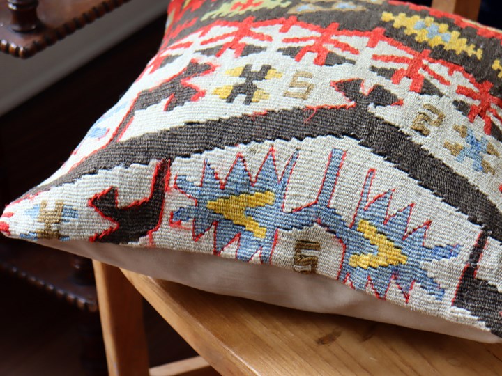 | 【オールドキリム】古い時代(主に1960-1980年代)に、一般の家庭で織られたウールの手織りキリムを表面に使ったクッションカバーです。擦り切れた個所や、日焼け、修理のあとなどがある場合がございますことをご了承ください。クッションはトルコで縫製されていて、縫製前にはきれいにクリーニングしてあります。 クッションカバーの裏面は無地のコットン、色はそれぞれ異なりますので表記してあります。 【お手入れについて】オールドキリムの染料が色落ちする場合がありますのでほかのものと一緒に洗わないようご注意ください。液体洗剤で押し洗いしたあと、よくすすいで、フラットにして乾かしてください。 |