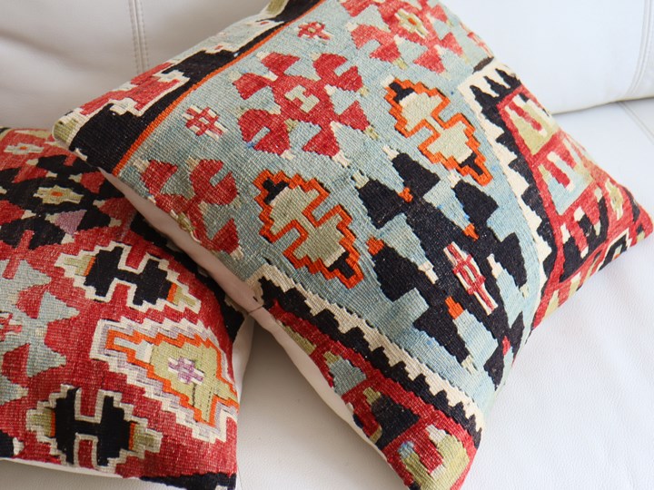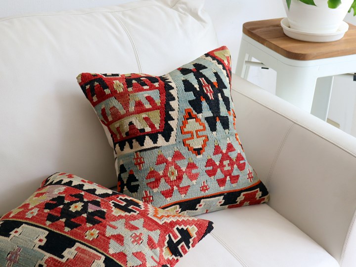 | 【オールドキリム】古い時代(主に1960-1980年代)に、一般の家庭で織られたウールの手織りキリムを表面に使ったクッションカバーです。擦り切れた個所や、日焼け、修理のあとなどがある場合がございますことをご了承ください。クッションはトルコで縫製されていて、縫製前にはきれいにクリーニングしてあります。 クッションカバーの裏面は無地のコットン、色はそれぞれ異なりますので表記してあります。 【お手入れについて】オールドキリムの染料が色落ちする場合がありますのでほかのものと一緒に洗わないようご注意ください。液体洗剤で押し洗いしたあと、よくすすいで、フラットにして乾かしてください。 |