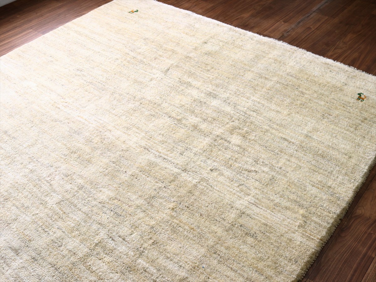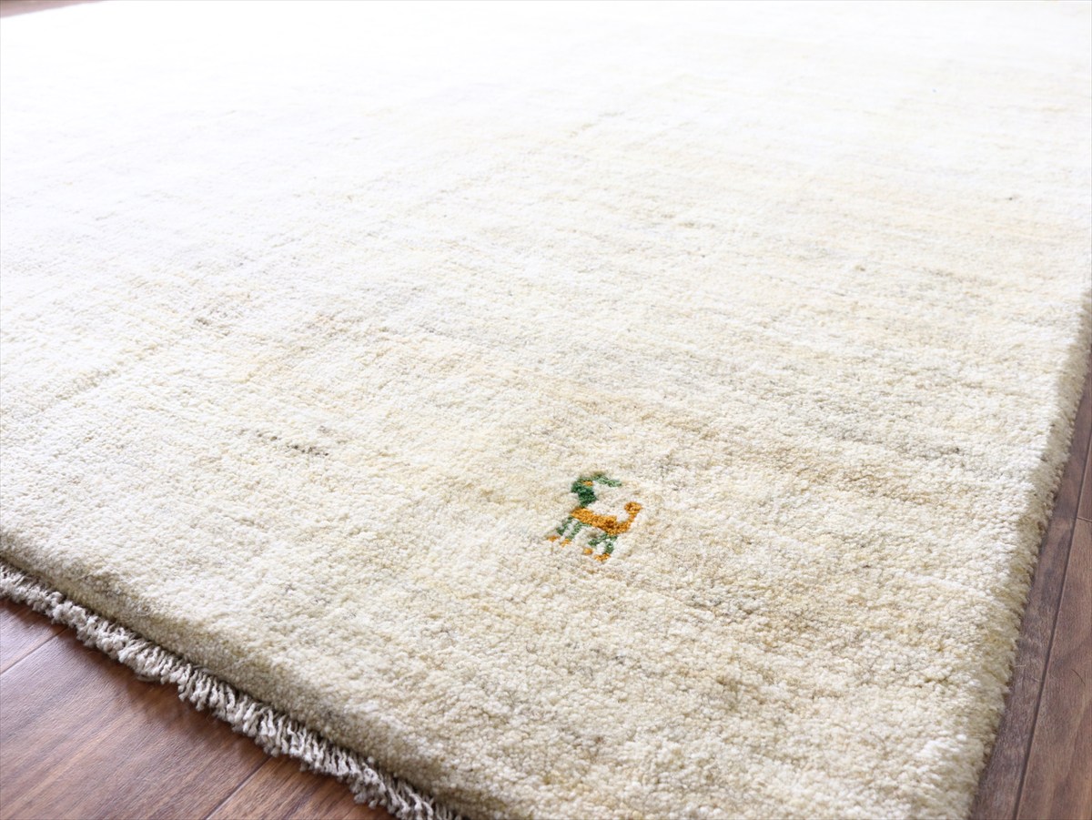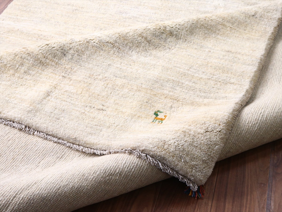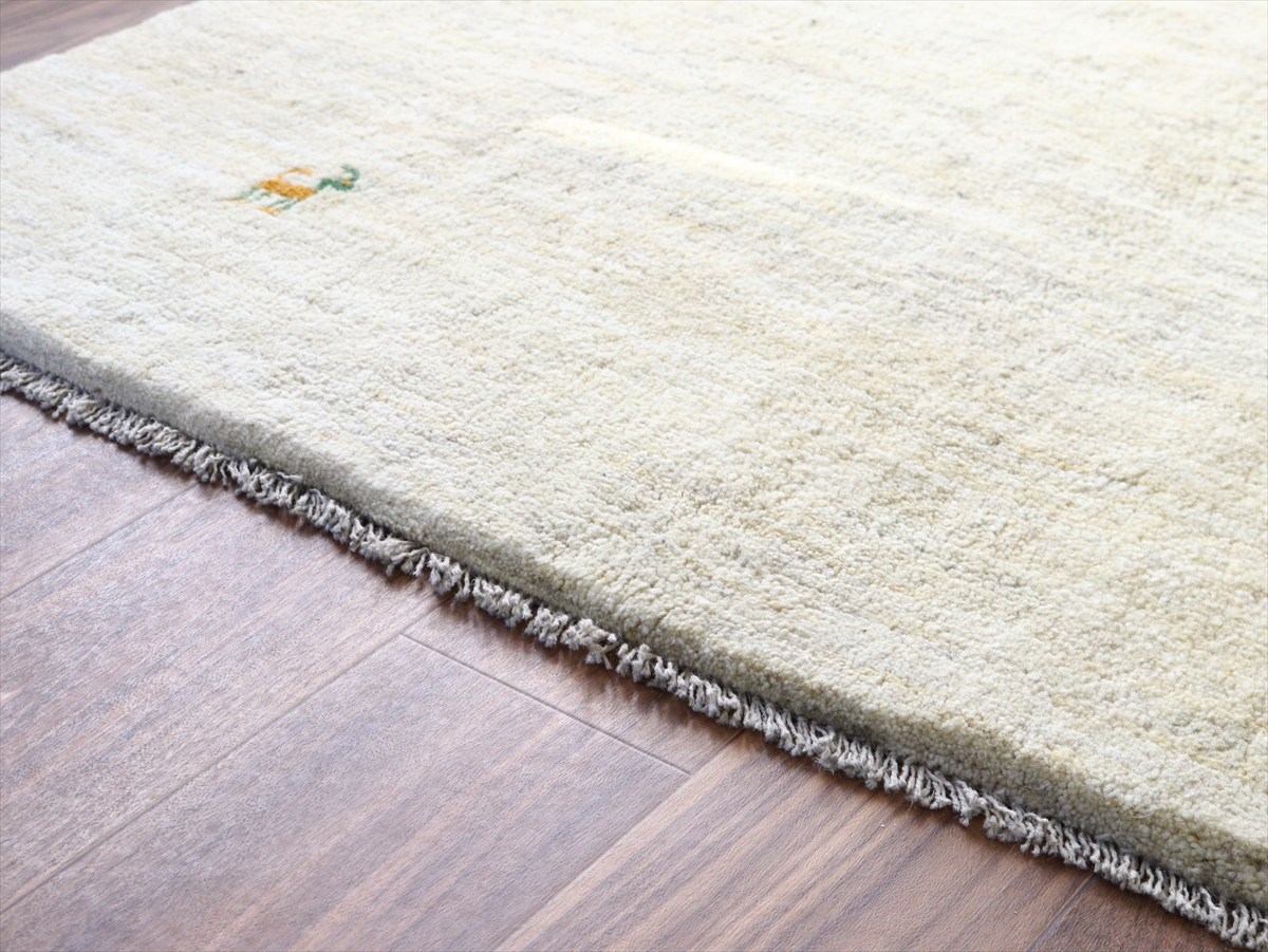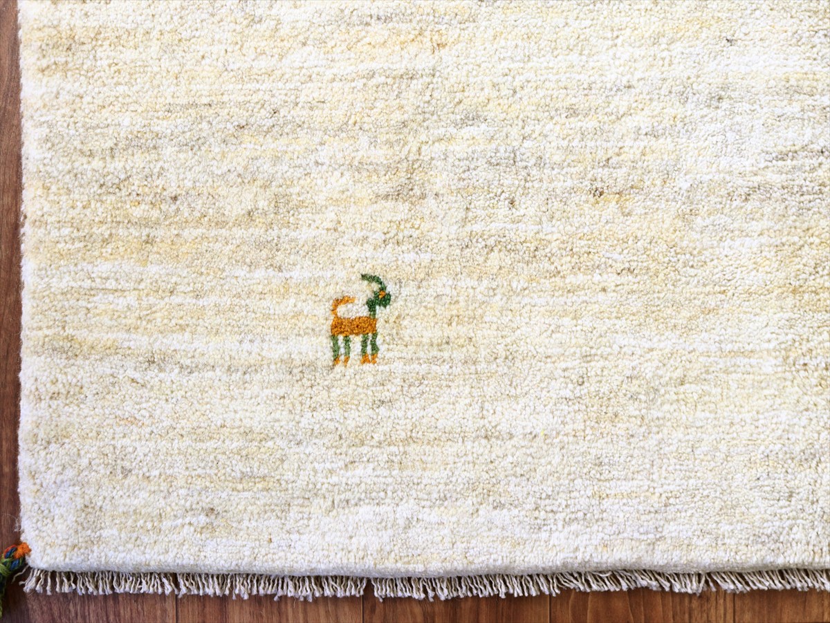 | 染めていない天然の羊毛の色をいかして織られたアイボリー色のギャッベです。シンプルなデザインながら、羊毛の色の濃淡が自然な感じに混ざり合っていて、ナチュラルであたたかみのある風合いに仕上がっています。 羊毛の色は、当店ではナチュラルアイボリーと呼んでいて、真っ白ではなくやや黄色みのある明るいベージュ系の色です。 |