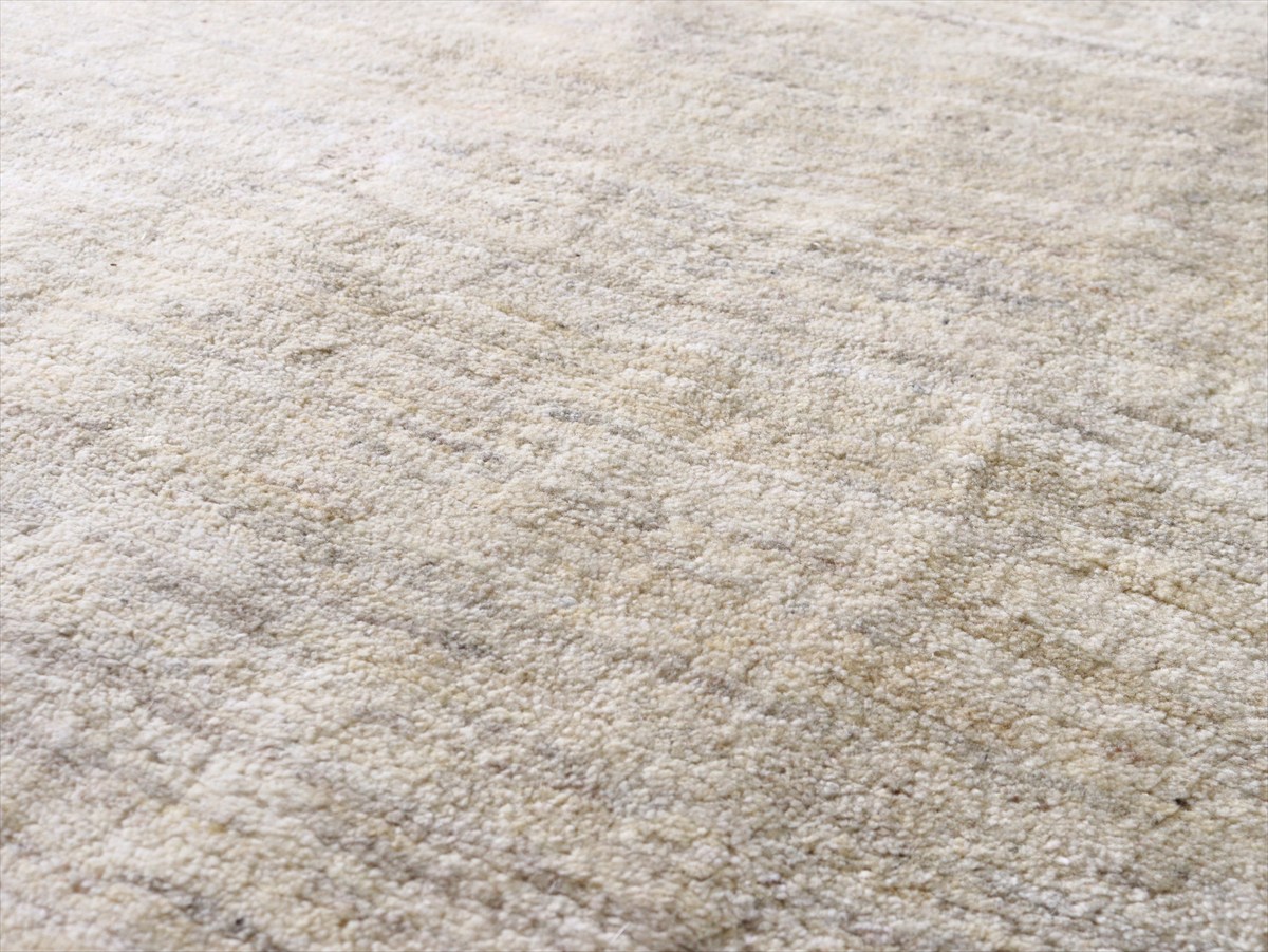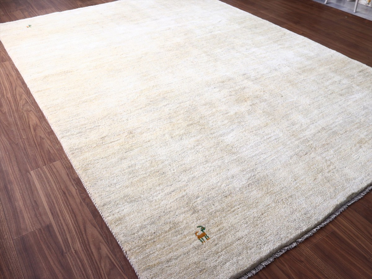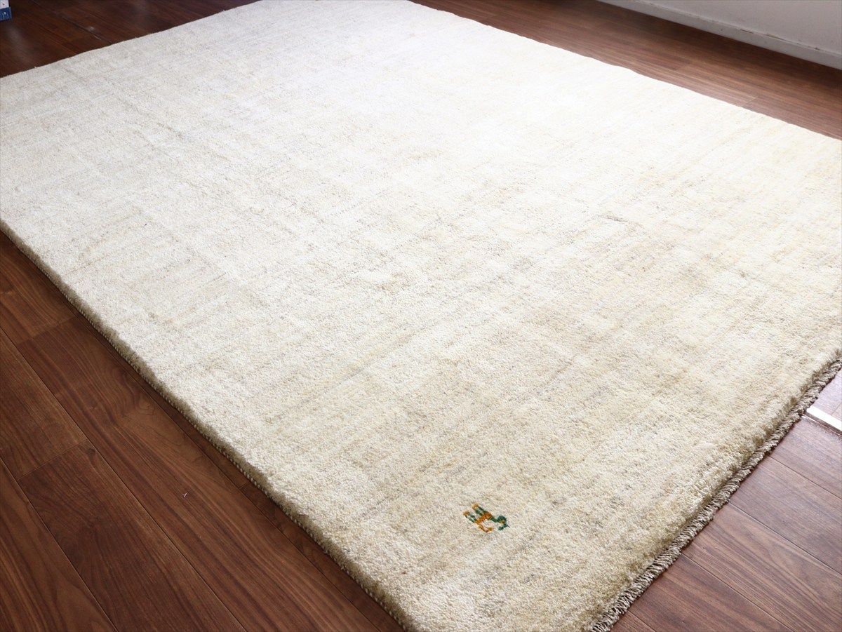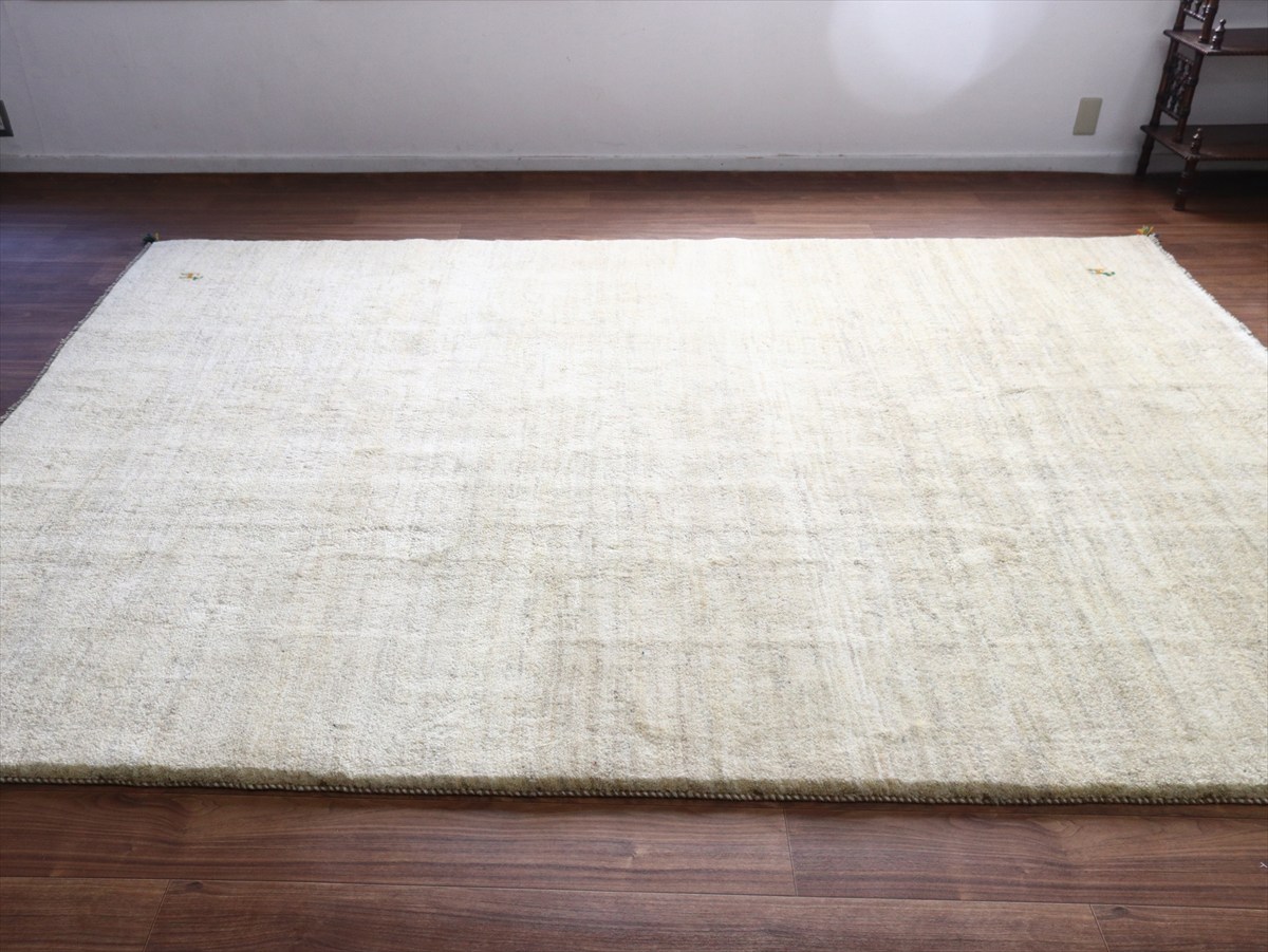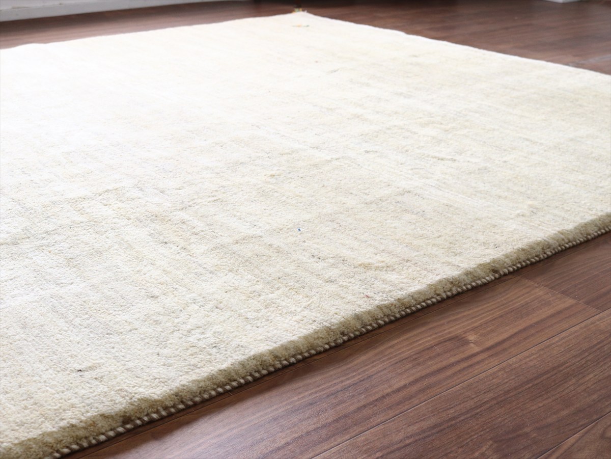 | 染めていない天然の羊毛の色をいかして織られたアイボリー色のギャッベです。シンプルなデザインながら、羊毛の色の濃淡が自然な感じに混ざり合っていて、ナチュラルであたたかみのある風合いに仕上がっています。 羊毛の色は、当店ではナチュラルアイボリーと呼んでいて、真っ白ではなくやや黄色みのある明るいベージュ系の色です。 |