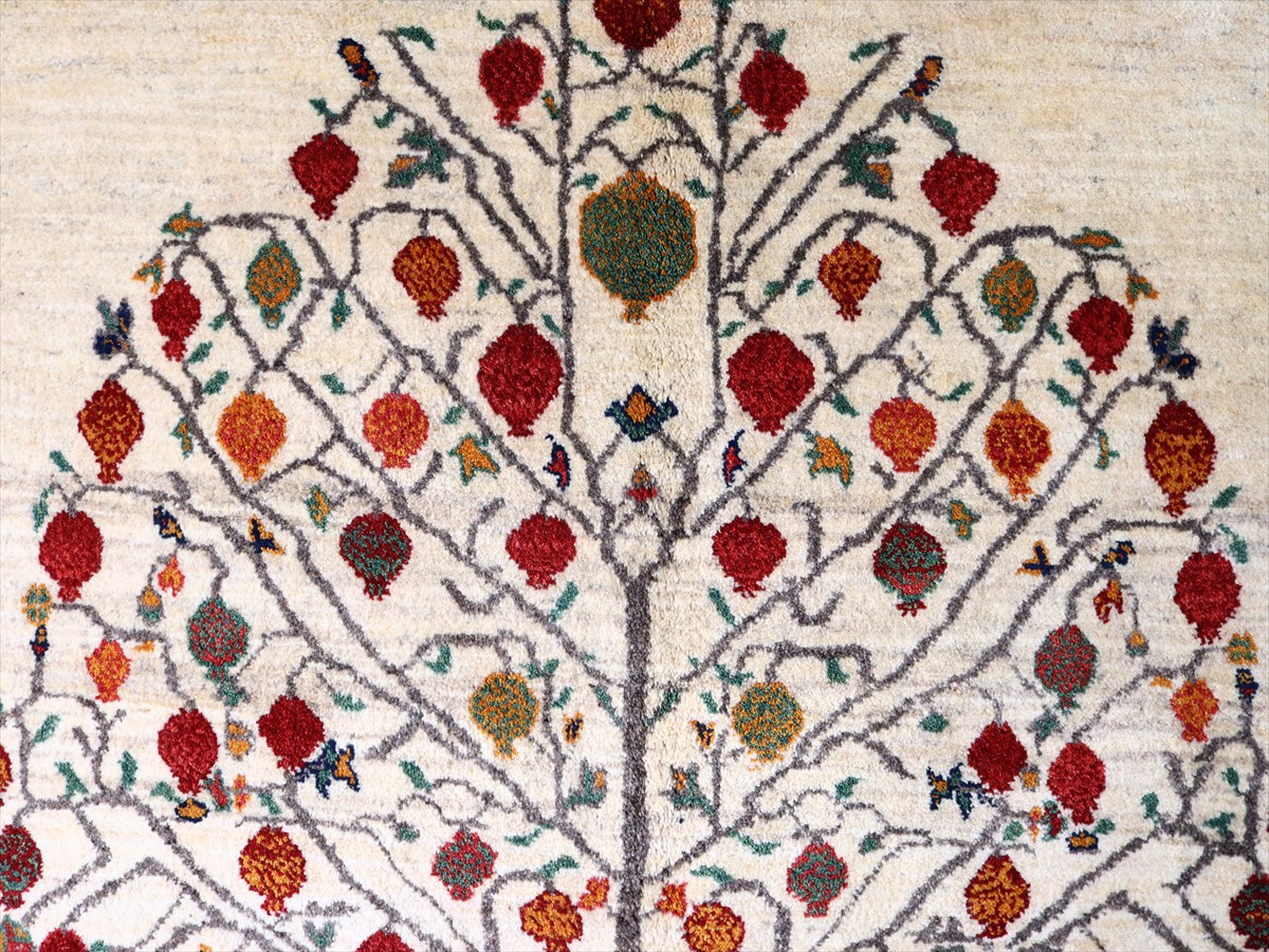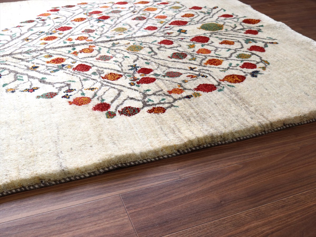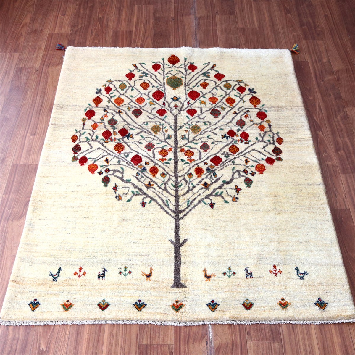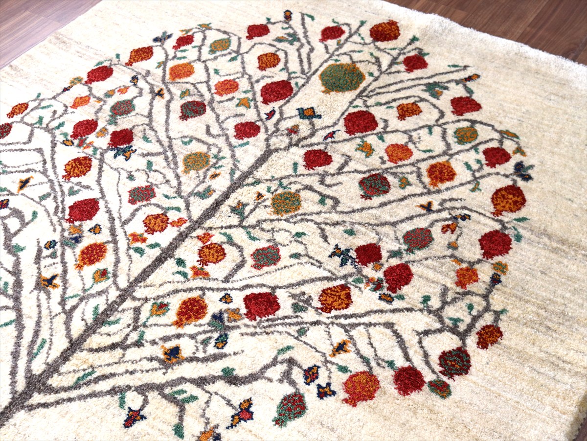 - ギャッベ Gabbeh ナチュラルアイボリー198×160cm イラン産 ザクロの樹と鳥と動物