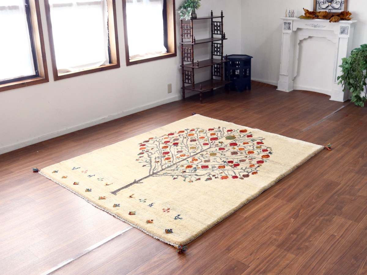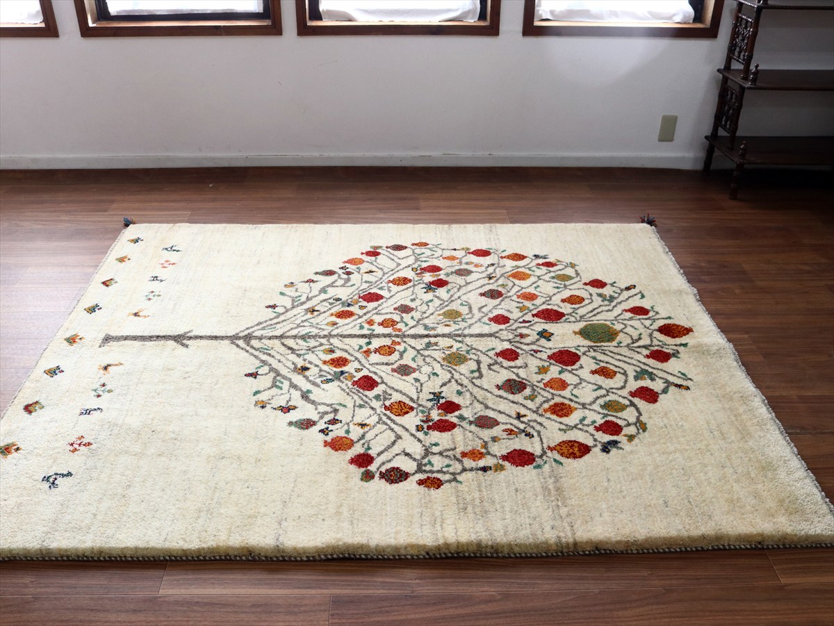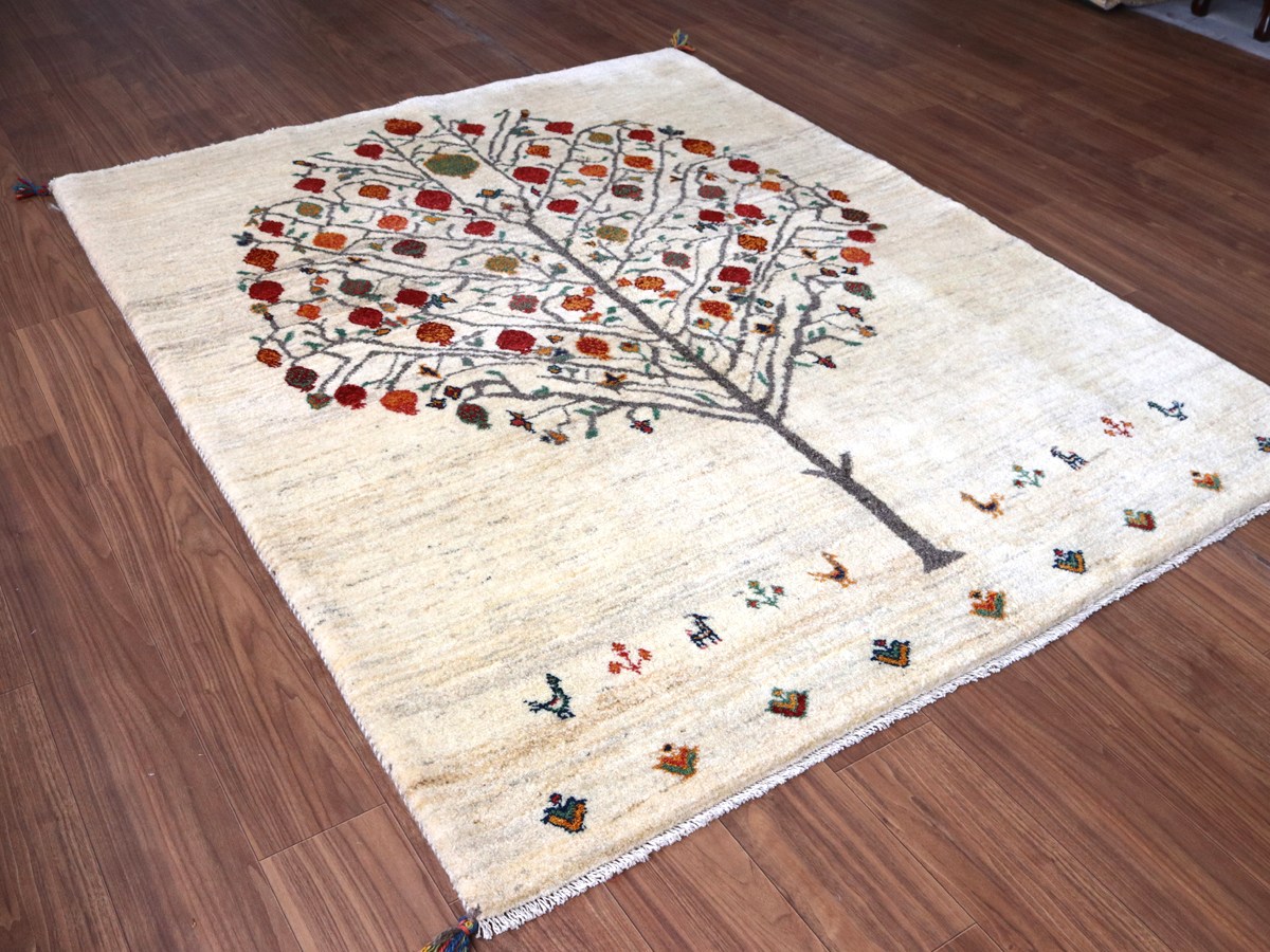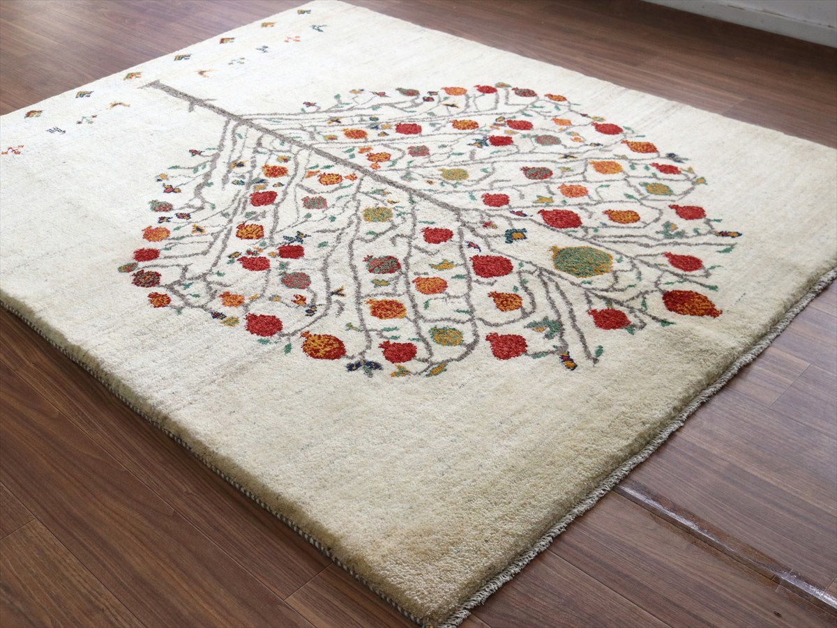 - ギャッベ Gabbeh ナチュラルアイボリー198×160cm イラン産 ザクロの樹と鳥と動物