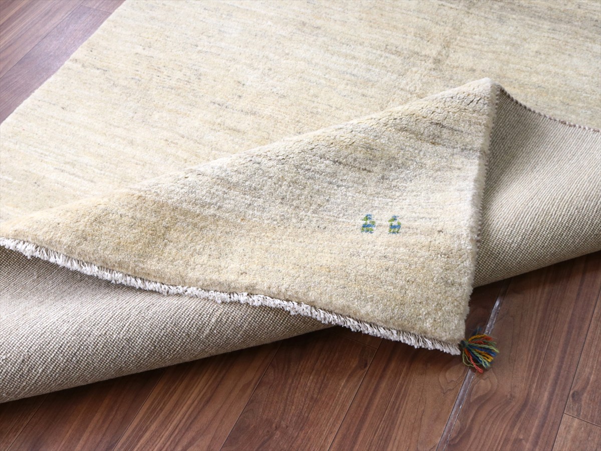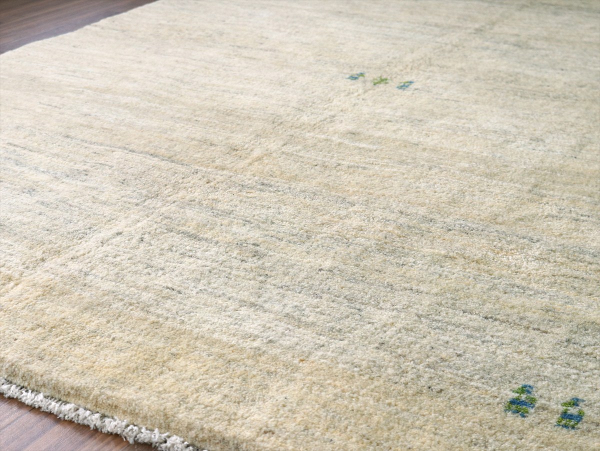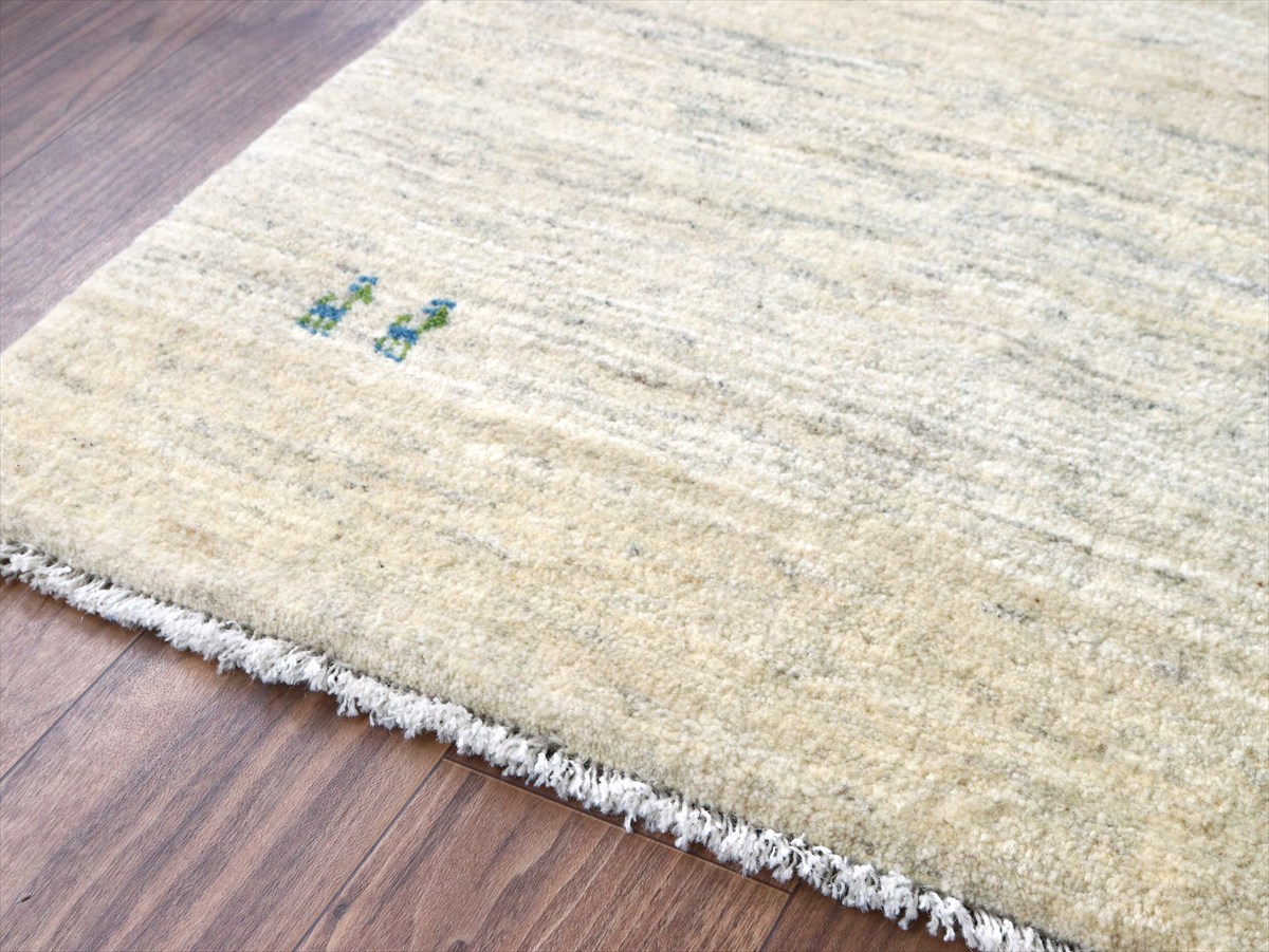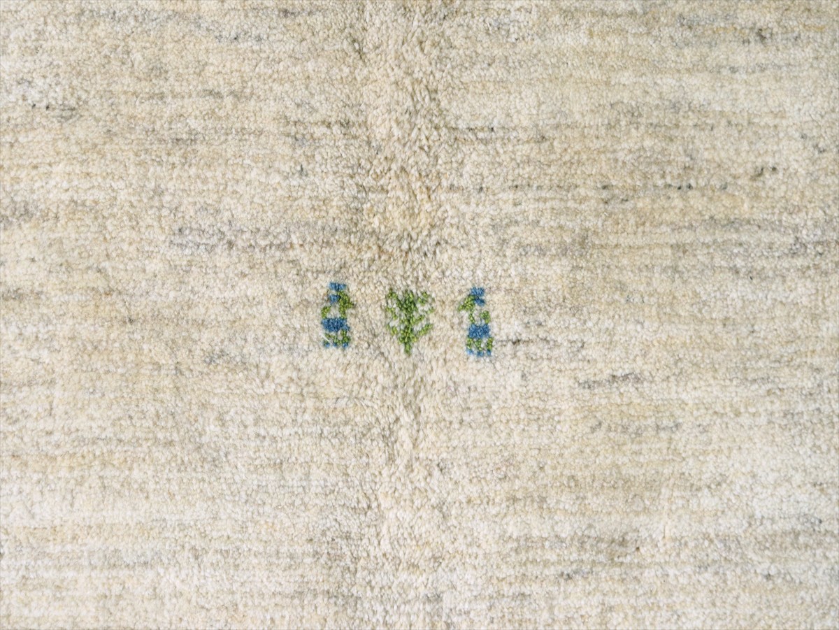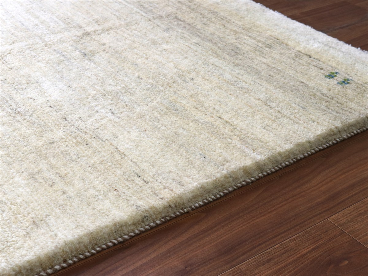 | 染めていない天然の羊毛の色をいかして織られたアイボリー色のギャッベです。シンプルなデザインながら、羊毛の色の濃淡が自然な感じに混ざり合っていて、ナチュラルであたたかみのある風合いに仕上がっています。 羊毛の色は、当店ではナチュラルアイボリーと呼んでいて、真っ白ではなくやや黄色みのある明るいベージュ系の色です。 |