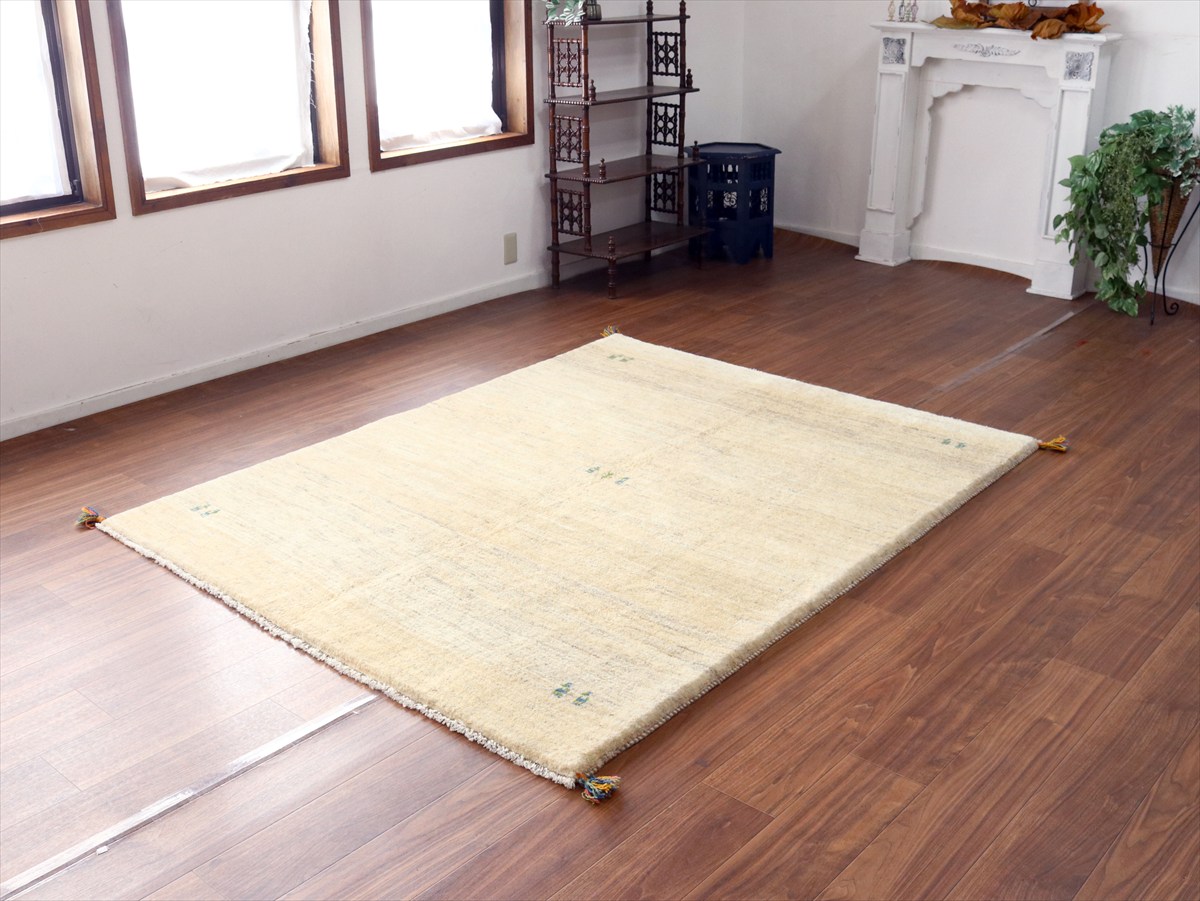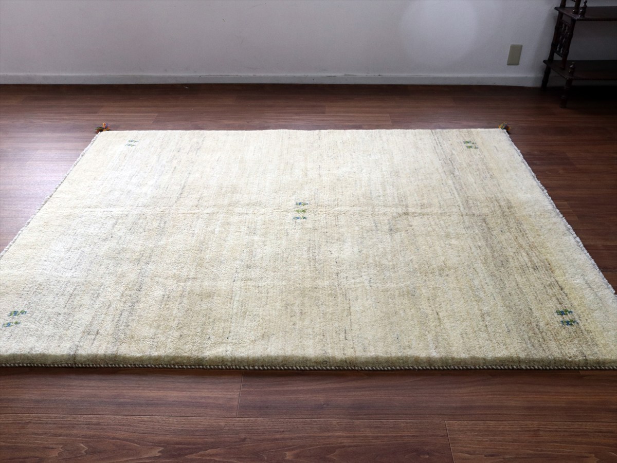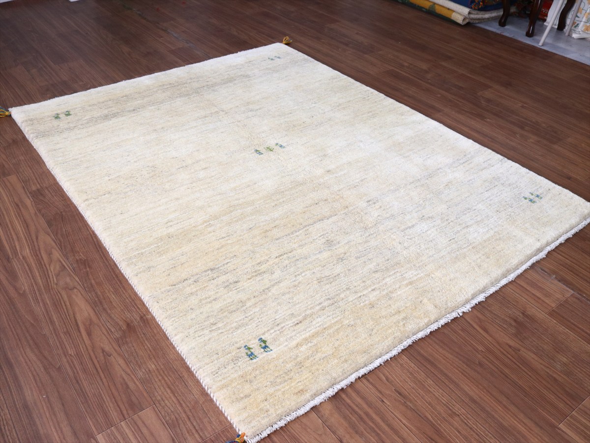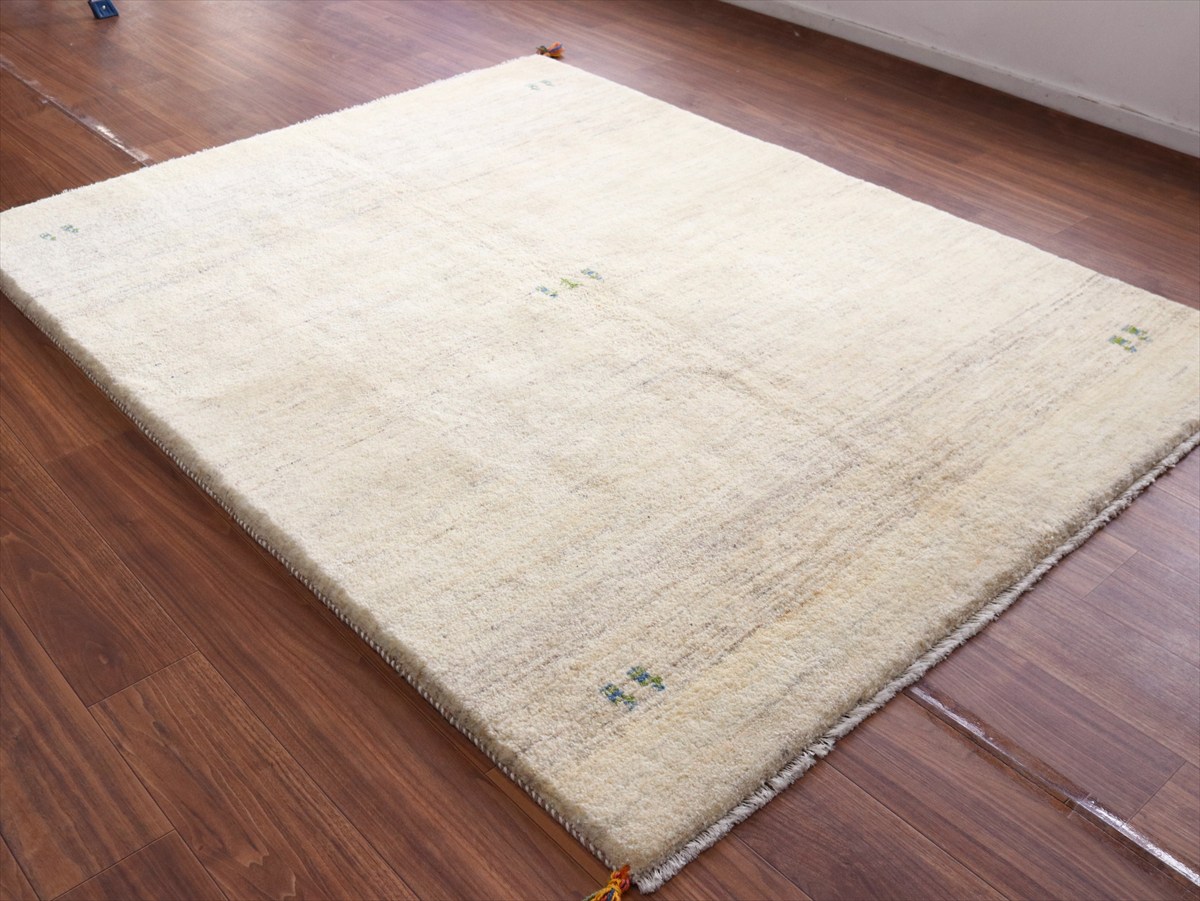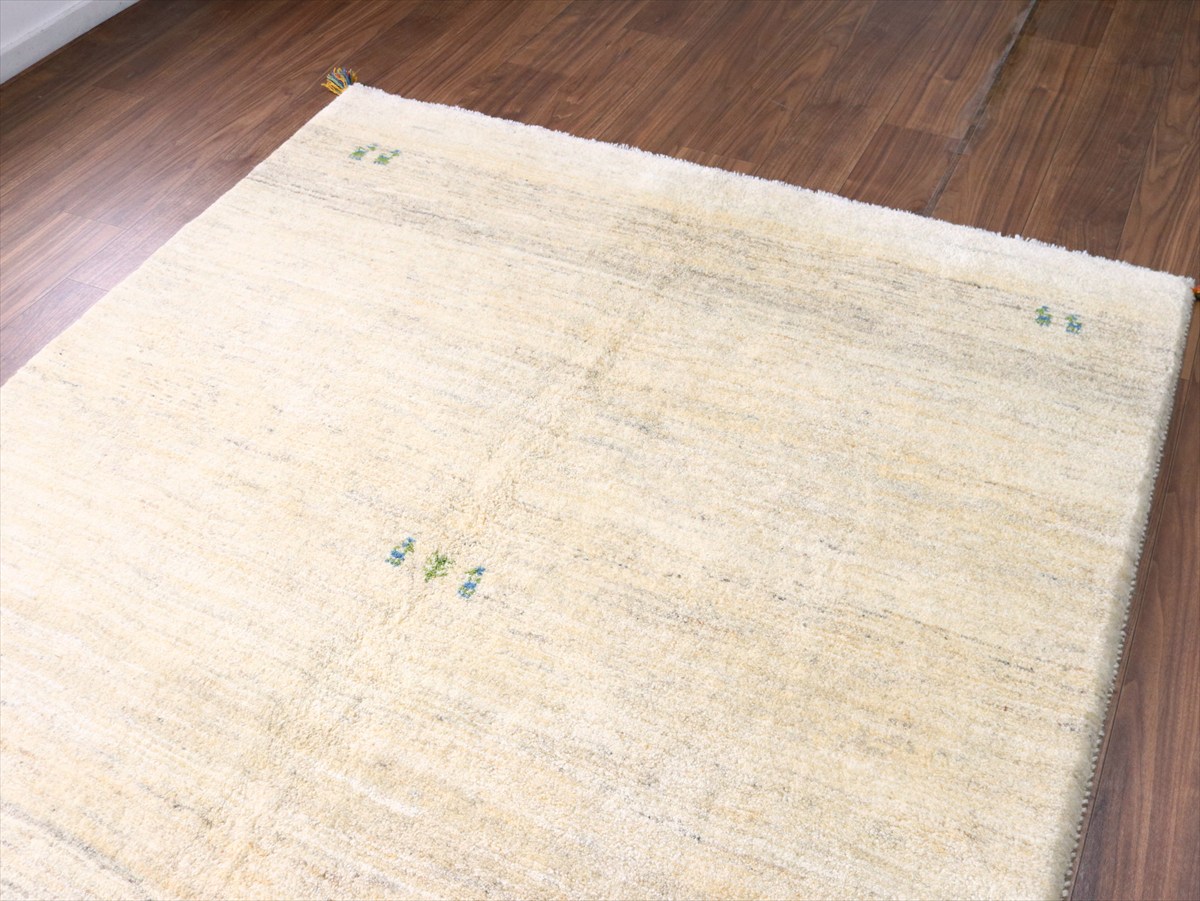 | 染めていない天然の羊毛の色をいかして織られたアイボリー色のギャッベです。シンプルなデザインながら、羊毛の色の濃淡が自然な感じに混ざり合っていて、ナチュラルであたたかみのある風合いに仕上がっています。 羊毛の色は、当店ではナチュラルアイボリーと呼んでいて、真っ白ではなくやや黄色みのある明るいベージュ系の色です。 |
