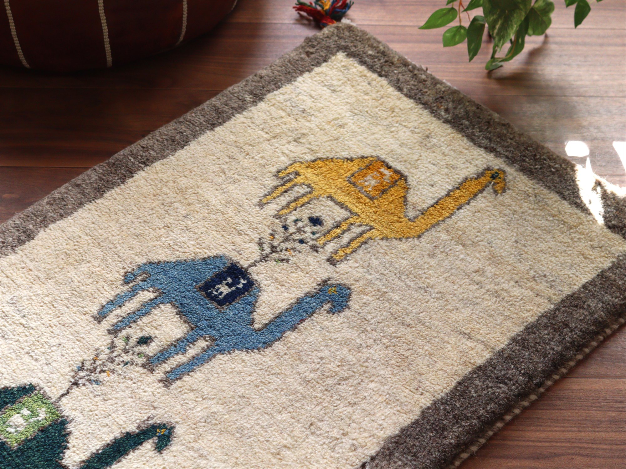 ギャッベ イラン産手織りラグ 88x55cm ラクダと植物 アイボリー