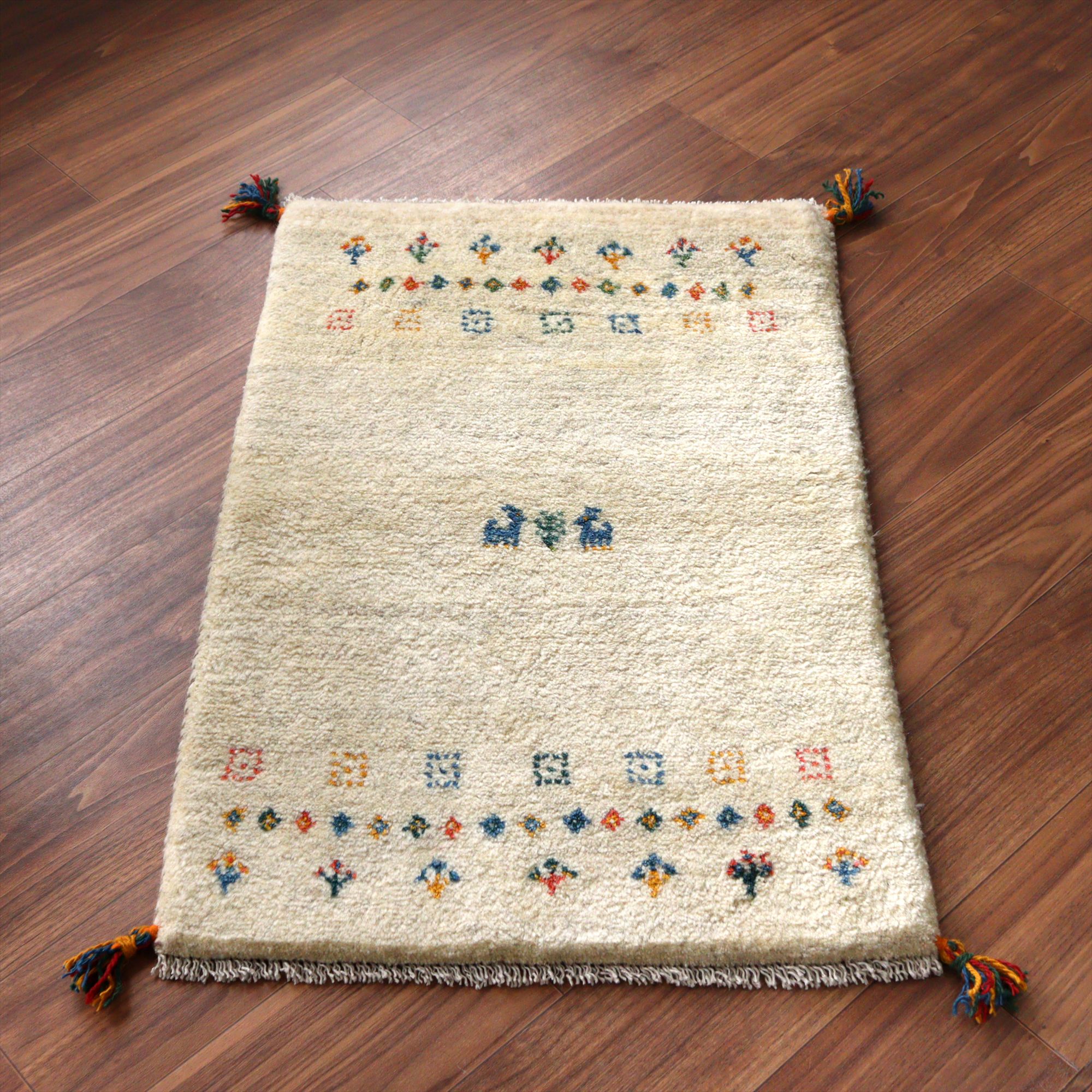 ギャッベ イラン産手織りラグ 92x60cm 動物と植物 アイボリー