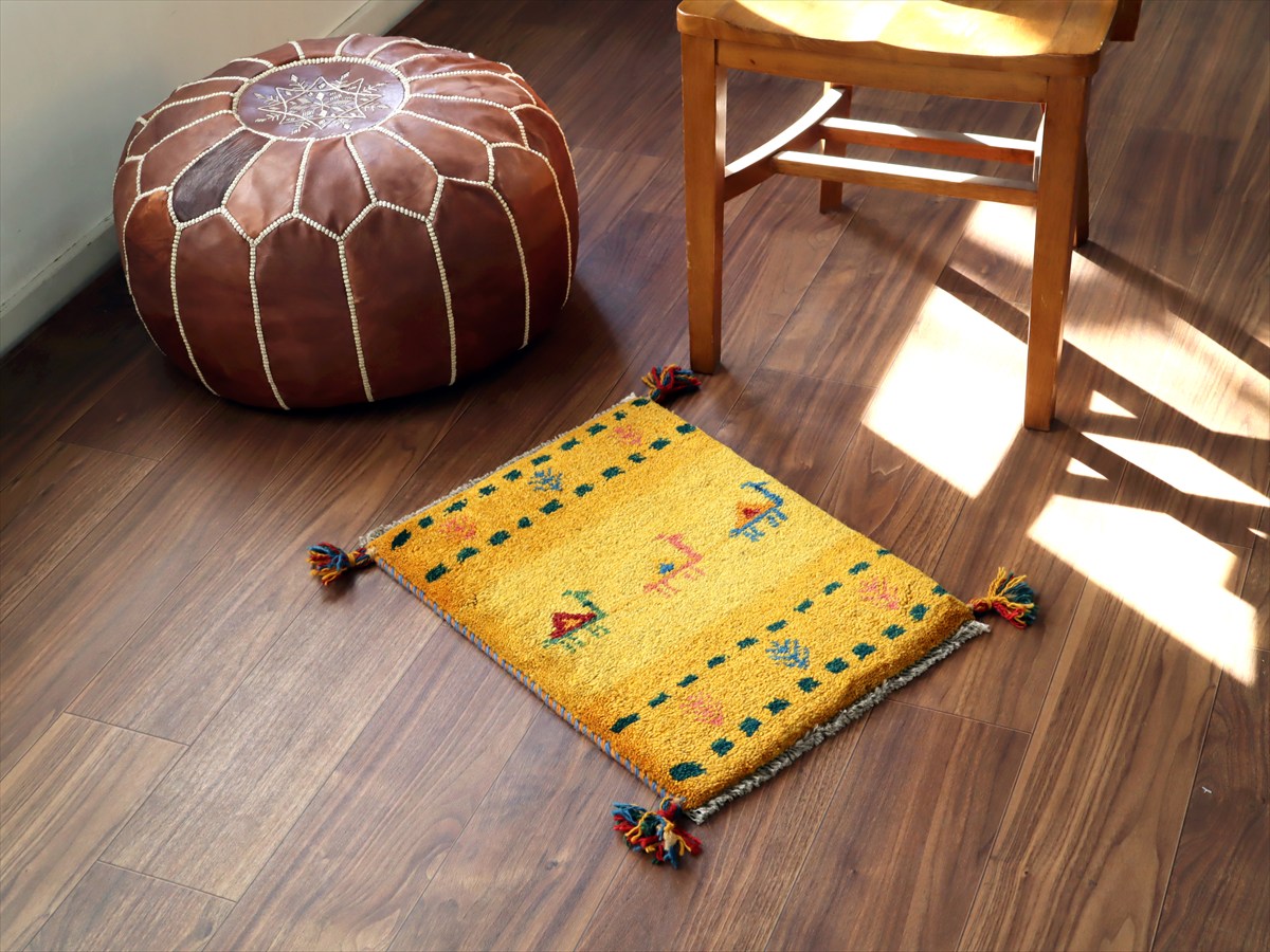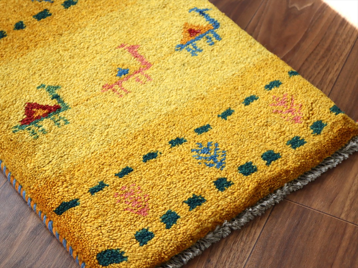 Key:ギャッベ,ギャベ,一点もの 現品販売 ラグ,ウール製,イラン,手織り,じゅうたん,絨毯,座布団, イエロー オレンジ 黄色 草木染, ガラタバザール Gabbeh, Handmade, Hand knotted, Tribal rug, Iran carpet, Wool, Natural Dye,