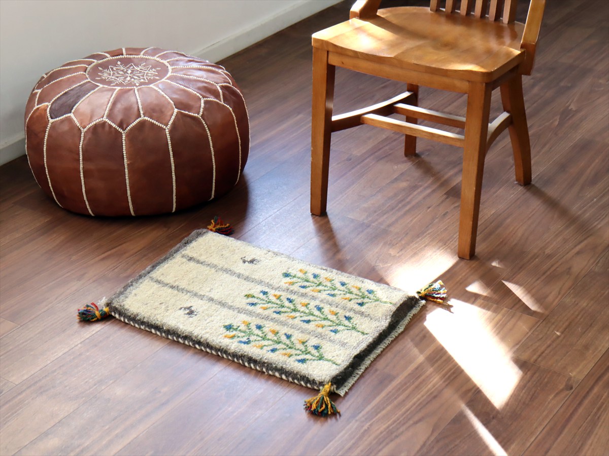 | 天然の羊毛の色をそのまま使ったアイボリーのギャッベ。ところどころグレーやベージュの毛糸も混ざっています。 |