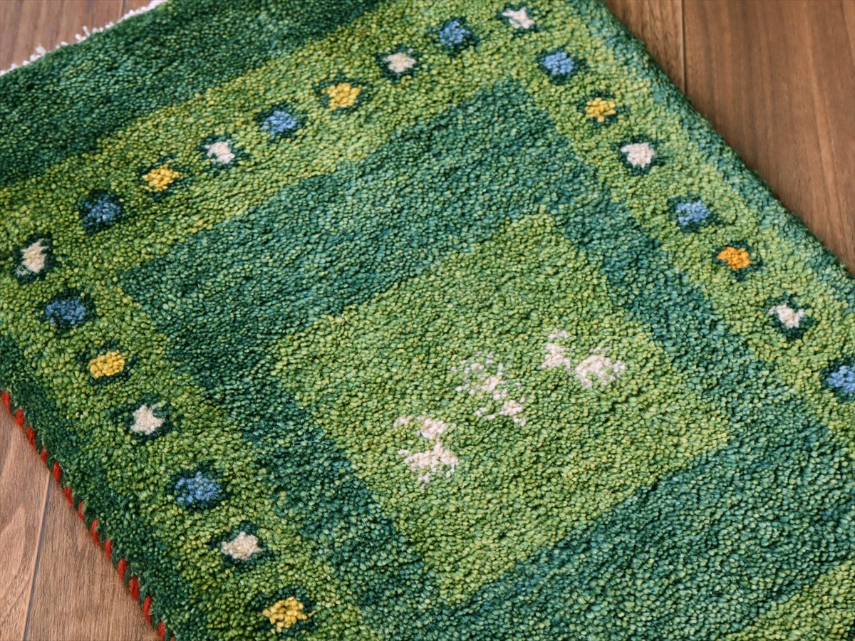 - ギャッベ ミニギャベ イラン産 60×39cm グリーン カラフルタイルと動物と生命の樹