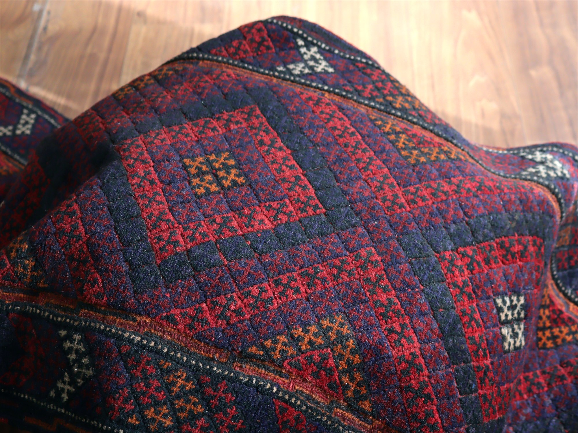 | ベース地はスマック織りでしっかりとした織り地です。モチーフ部分はパイル(毛足)のある織りで、表面には立体感があります。 |