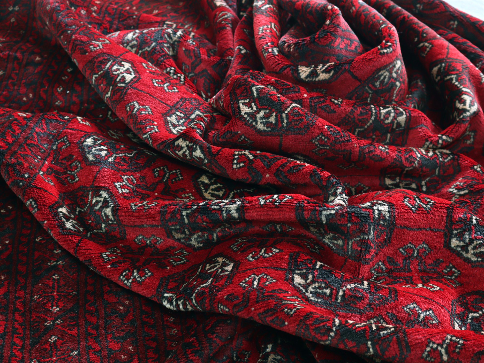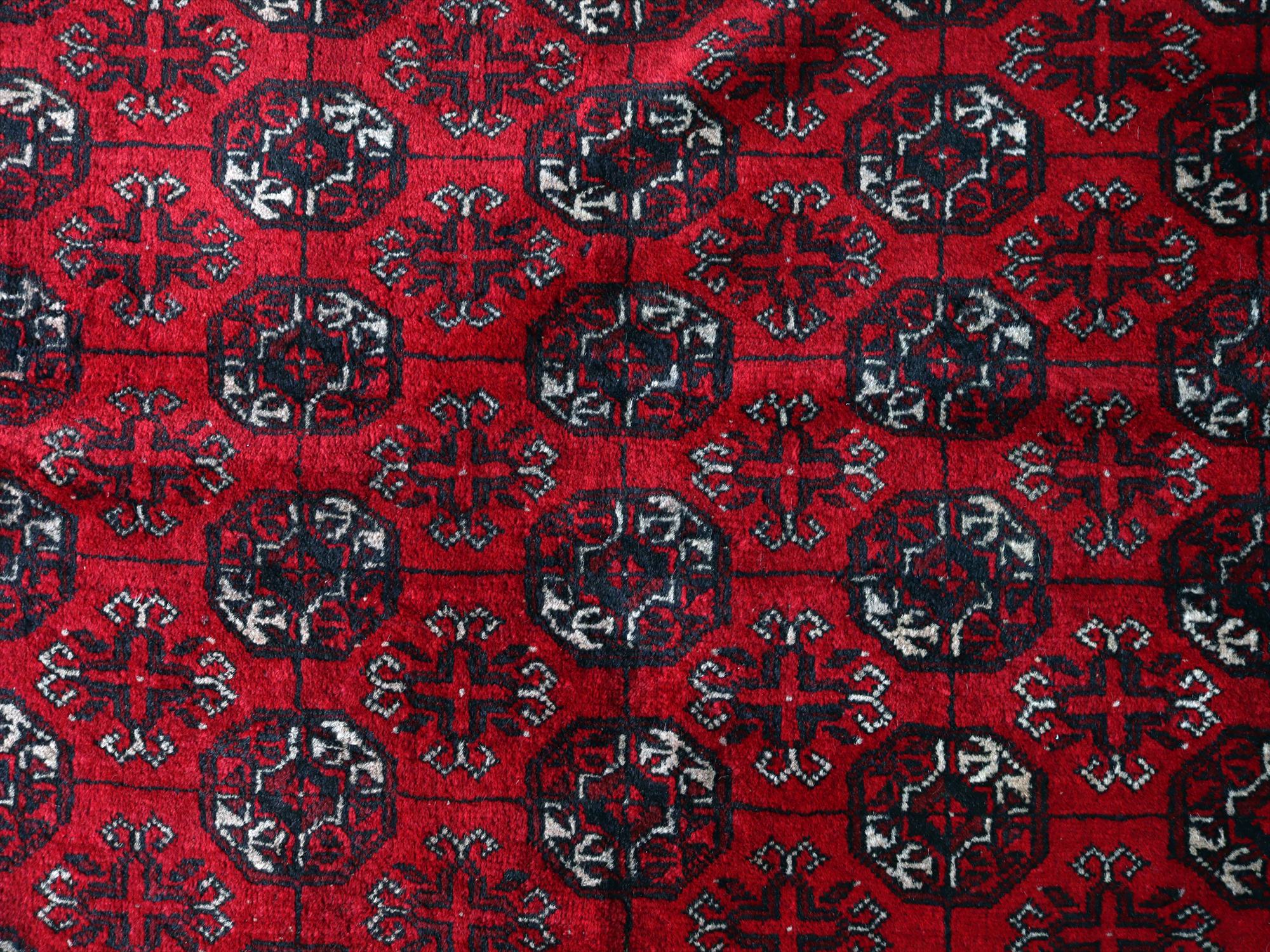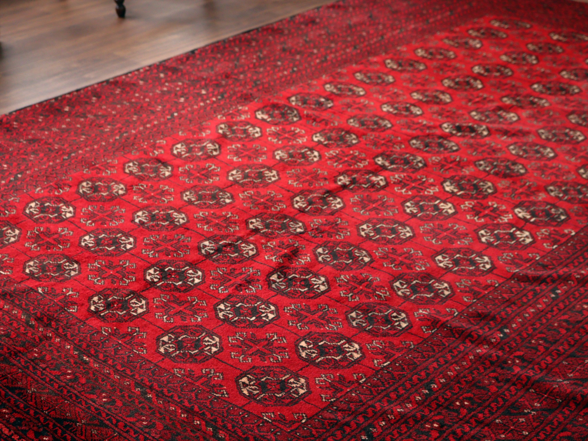| トーンの異なるレッドで織られた幾何学模様が連続するアフガン絨毯。クラシックで重厚感のある佇まいが、お部屋を落ち着いた雰囲気に。 |