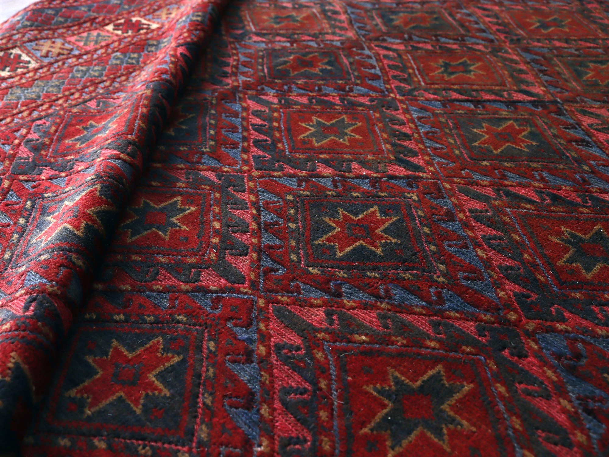 | アフガニスタン東部、イランと国境を接するエリアの緻密な織りのキリムです。細かい織り目のスマック織りをベースに、立体感のあるカーペット織りでモチーフをレリーフのように織り込んだ1枚。 |