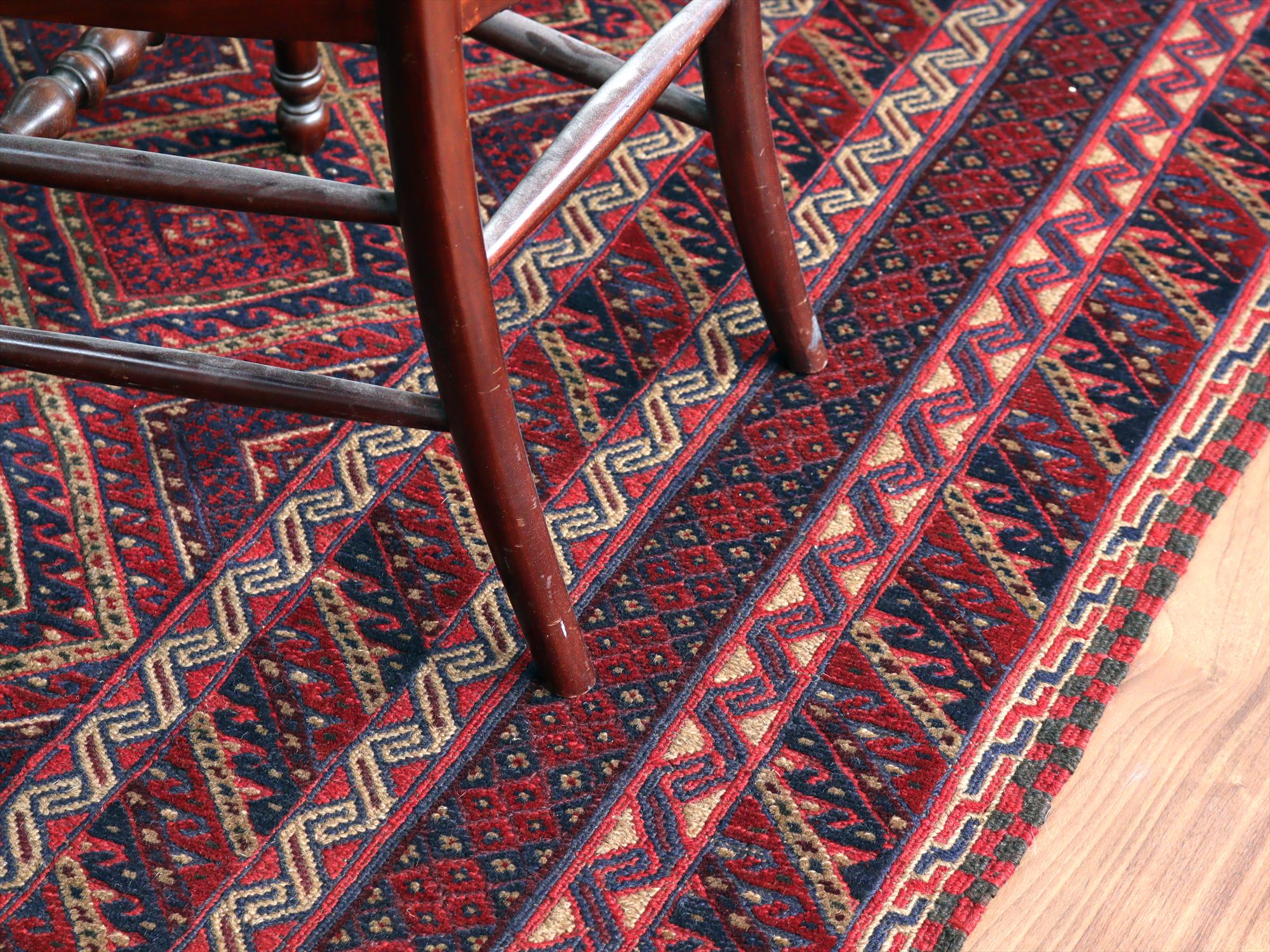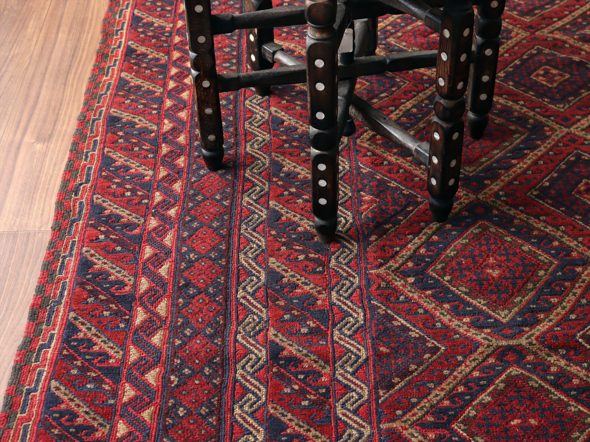 | アフガニスタン東部、イランと国境を接するエリアの緻密な織りのキリムです。細かい織り目のスマック織りをベースに、立体感のあるカーペット織りでモチーフをレリーフのように織り込んだ1枚。 |
